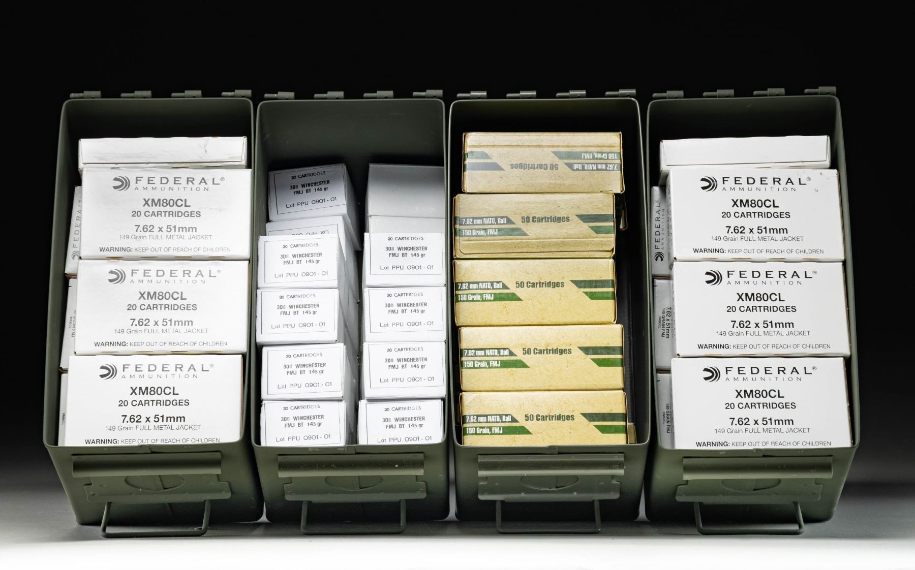 All in great condition within 4 near excellent GI style 50 cal. ammo cans. IMI packed in 50 round boxes; Federal and PPU in 20 round boxes. 10 boxes of PPU have 145 grain FMJ BT bullets. / 20 boxes of Federal XM80CL have 149 grain FMJ bullets. / 10 boxes of IMI have 150 grain FMJ bullets. (02-25177-12/NW). AMMO. $750-1,000.