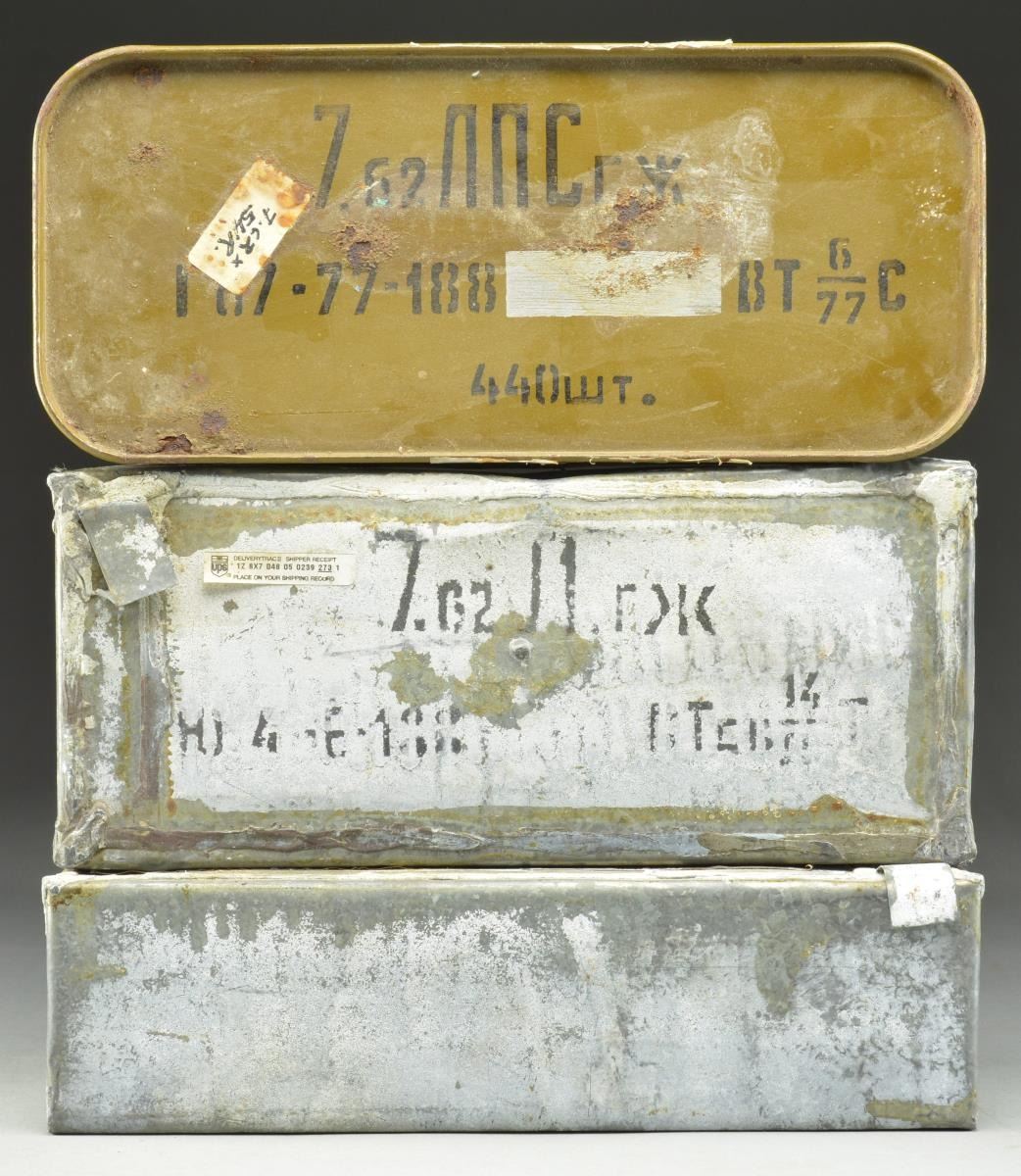 440 RDS. in sealed green "spam can" of ammo. / 800+ Rds. in 2 sealed gray "spam cans" of ammo. CONDITION: sealed cans good as is w/ marks. (02-18040/MD). $250-450.