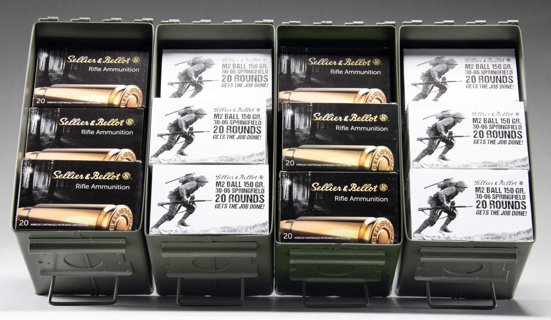 Sellier and Bellot Garand specific ammo having 150 grain FMJ bullets of 2,700 FPS velocity. Packed in 20 round boxes within 4 near excellent GI style 50 cal. ammo cans. 33 boxes are basically black and 34 are white; both are the same M2 ball specific ammo. (02-25177-14/NW). AMMO. $800-1,200.