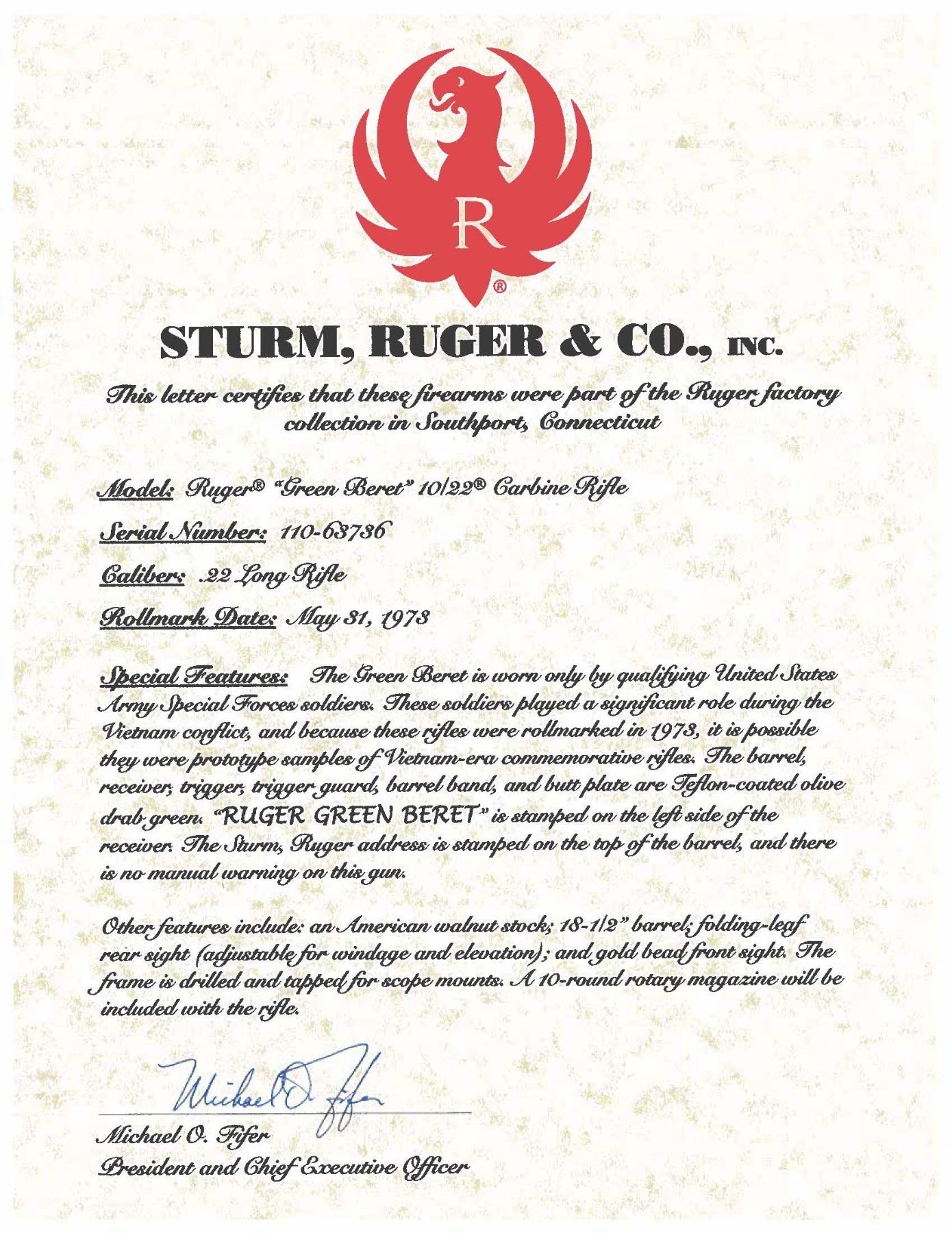 CARBINES. Please note as of 4/9/25 this item description has been updated. Please revisit this description and contact us with any questions. Cal. 22 LR. S# 110-63736. Bbl. 18 1/2" with standard banded gold bead front sight and folding leaf rear. Roll mark date of May 31, 1973 (1961 to date for all 10/22's) per factory letter signed by Ruger President, Michael O. Fifer. Prior to its Ruger Auction sale, it was stored in the factory collection at Southport, CT until October of 2012 when sold on Gun Broker via a Ruger Benefit Auction; winning bid was $3.050. Only 6 were made from serial number 110-63733 to 110-63738 having hand stamped (in slightly flawed alignment) "RUGER GREEN BERET" on left side of receiver without "10/22" designation anywhere on the carbine. A consecutively numbered example (110-63735) is listed preceding this one. Standard barrel address absent of "warning" marks (initiated 1977). Matte green Teflon finish resembling military parkerizing. Oiled walnut stock by Overton that has early back slant cut at forend tip plus alloy buttplate and barrel band. Internet search to ROCS (Ruger Owners and Collectors Society) noted number 110-63734 was sold at another Ruger Benefit Auction to a FFL holder in NJ for just over $2,500; no info found about the other 3 Green Beret Carbines. Exceedingly rare, documented 10/22 Carbine. MAGS: 1 factory 10 rd. UNATTACHED ACCESSORIES: above mentioned factory letter. 44 Carbine box with added label and black felt marker info on end opposite 44 markings plus shipping sleeve addressed to FFL in CO. CONDITION: all aspects near excellent including bore. (23-6856/NW). CURIO. $1,500-2,000.