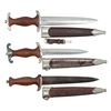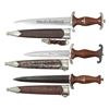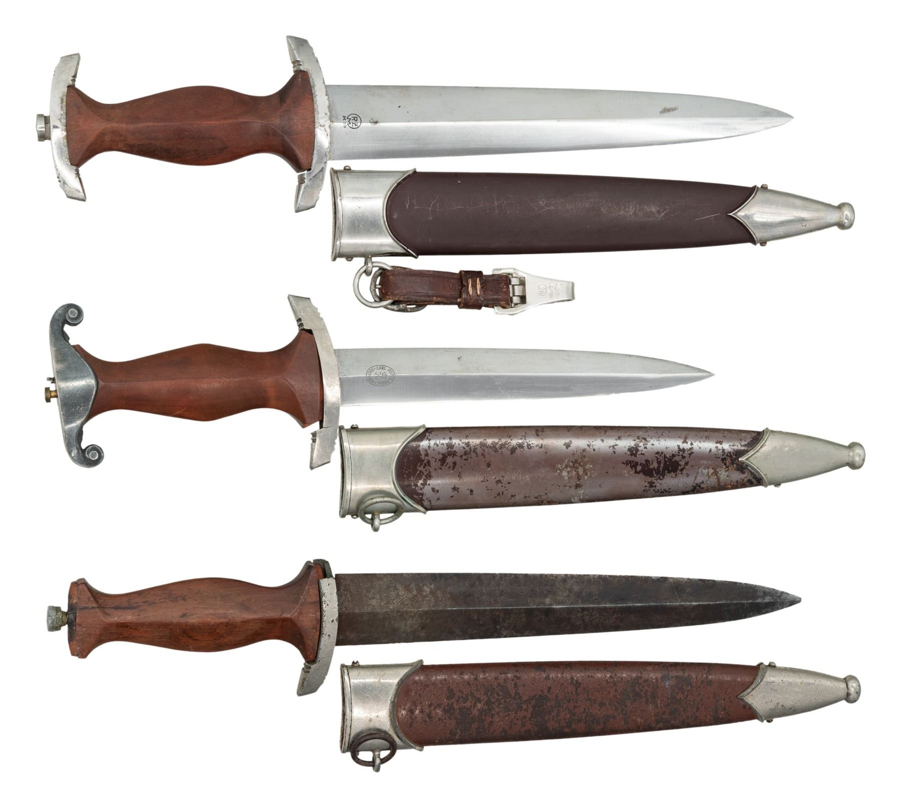 1) WWII German SA dagger measuring 14 3/4" overall with a blade that is etched "Alles fur Deutschland" and is marked "RZM M7/9" which indicates manufacture by Solinger Metallwarenfabrik GmBH of Stoecker & Co. Plated cross guard and pommel guard. Brown wood grip with inset brown enamel SA button and eagle. Brown painted scabbard with plated mounts and original hanger. CONDITION: blade has substantial original factory polish. Hilt shows light wear as does the grip. Scabbard finish is very nice and the hanger shows light wear. 2) WWII German SA dagger measuring 14 3/4" overall with a blade that is etched "Alles fur Deutschland" and is marked "RZM M7/51 1942 (logo)" which indicates manufacture by Anton Wingen Jr. of Solingen. Plated cross guard and no pommel guard. Brown wood grip with inset brown enamel SA button and eagle. Brown painted scabbard with plated mounts. CONDITION: blade has a black patina and is in relic condition. The crossguard is 30% missing and the pommel guard is gone. The grip is in decent shape and shows light wear. Scabbard is rough with an oxidized finish. 3) WWII German dagger measuring 14 1/2" overall with a 7" blade that is in the form of an SA or SS blade with no etching. The blade is marked "CARL JUKIUS KREBS (logo) SOLINGEN". Plated cross guard and the pommel guard is actually a crossguard for an Army dagger with the Party symbol removed. Brown wood with no adornments. Scabbard is brown anodized with a painted finish over the original finish and plated mounts. CONDITION: blade has original factory polish. The crossguard is cracked and the grip has a small tight crack. Scabbard finish retains about 40% of the repaint. (02-26169/BF). NON-GUN. $600-800.