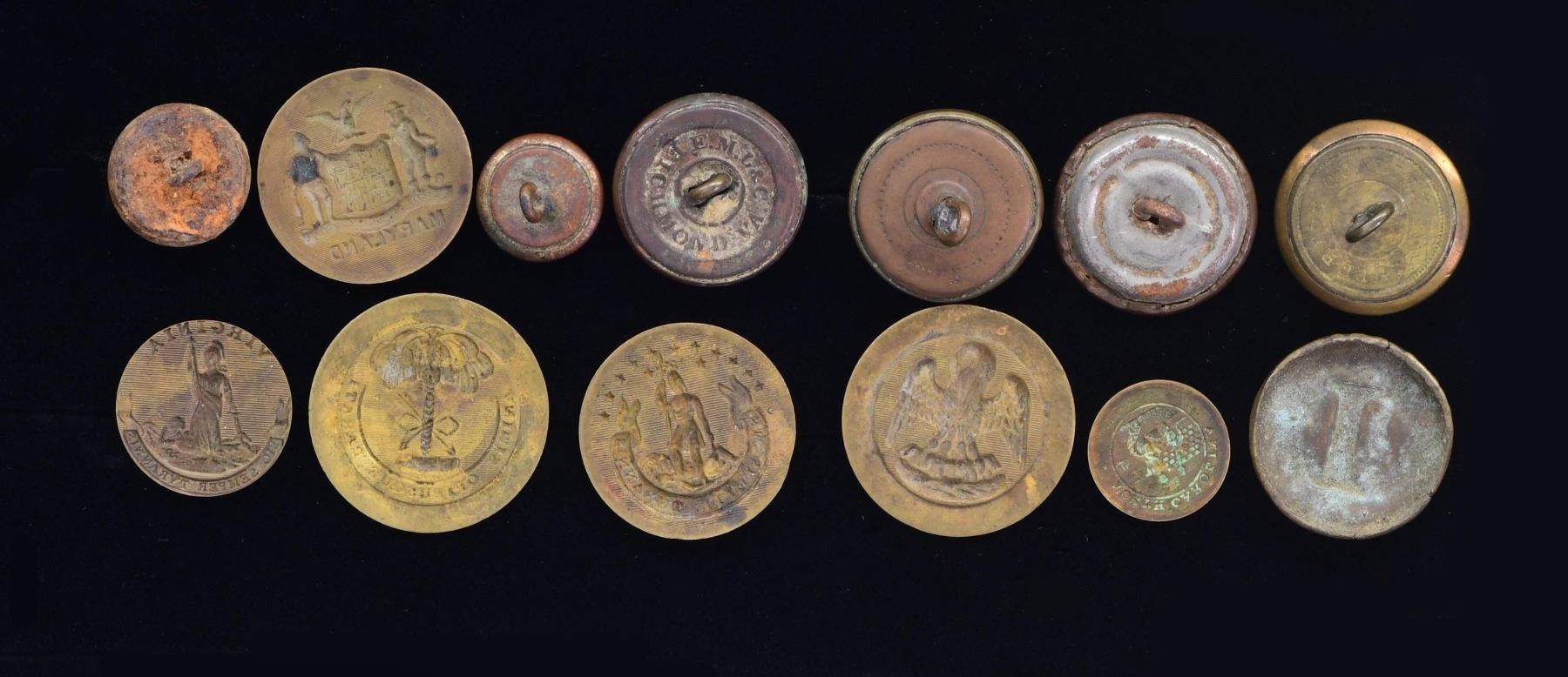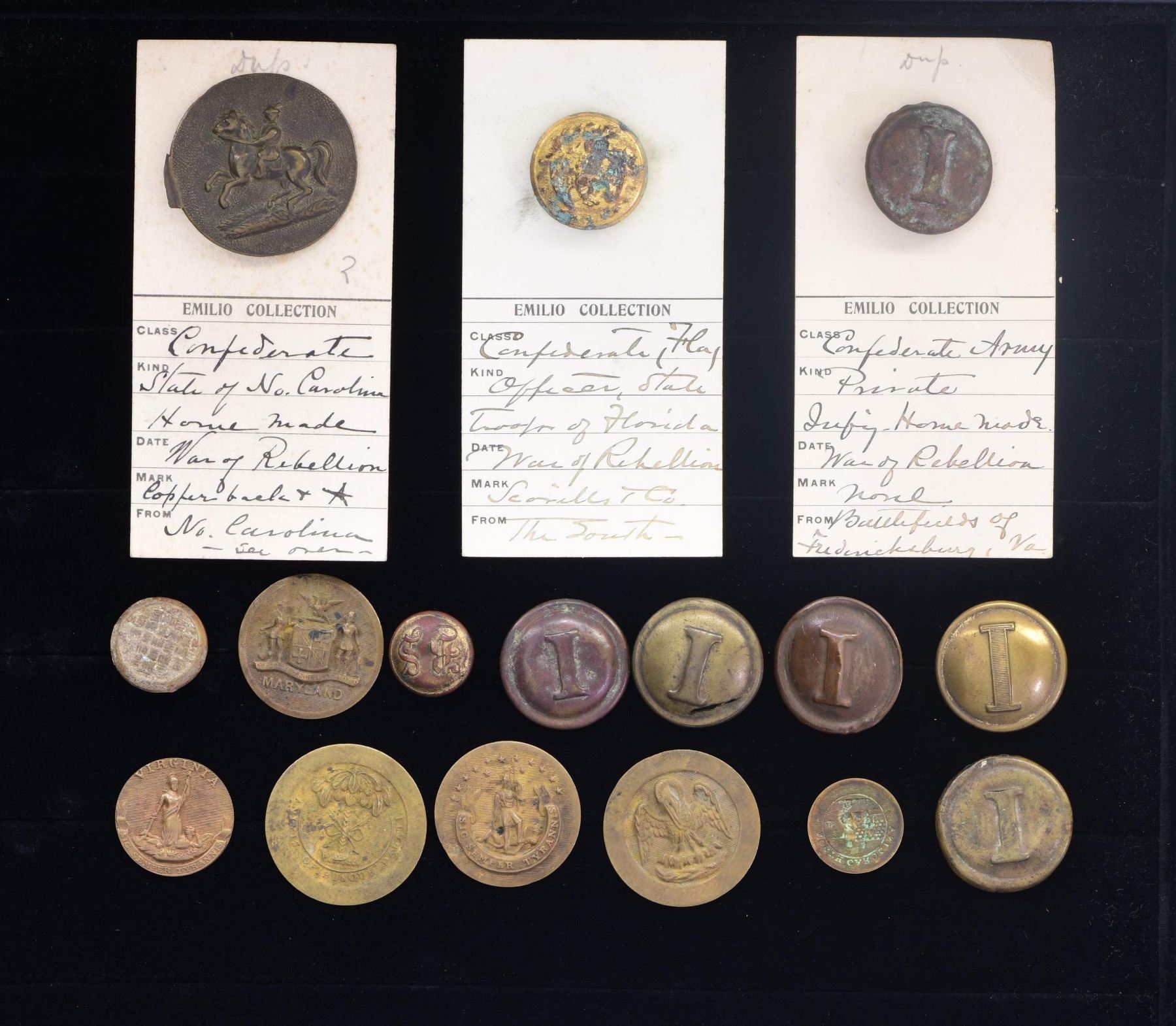 UNFINISHED BUTTON BLANKS. This lot includes 1 FL-1 Florida Territorial Seal button that may be excavated. This button has a substantial gold finish but shows extensive and deep verdigris. The backmark reads RMDC "SCOVILLS & CO SUPERFINE". This button is on an original Emilio card. / 1 Large button showing a horse and rider on an original Emilio card that identifies it as a "State of No. Carolina Homemade War of Rebellion" button. / 1 Excavated tinned iron back Local "I" button on an original Emilio card. Button was excavated in Fredericksburg. / 1 Coat-size lined "I" button with a Superior Quality backmark. / 1 Locally produced coat size "I" button with a copper face and a tin back. / 1 Excavated Local "I" button with a backmark that reads RMDC "E.M.L & CO RICHMOND VA." / 1 Locally produced coat size "I" button with a brass face and copper back, showing a large manufacturing flaw in the front. / 1 Front shell only of a locally produced "I" button. / 1 Civilian excavated cuff button from a Fredericksburg camp. / 1 Bingham School of North Carolina cuff button. / 6 Unfinished button faces for southern buttons. CONDITION: Florida button, as stated, is rough. Excavated buttons have a dark patina. Other buttons show light to moderate wear. Button blanks show light wear. PROVENANCE: Luis F. Emilio estate collection. (02-23227-21/BF). $1,000-1,500.