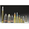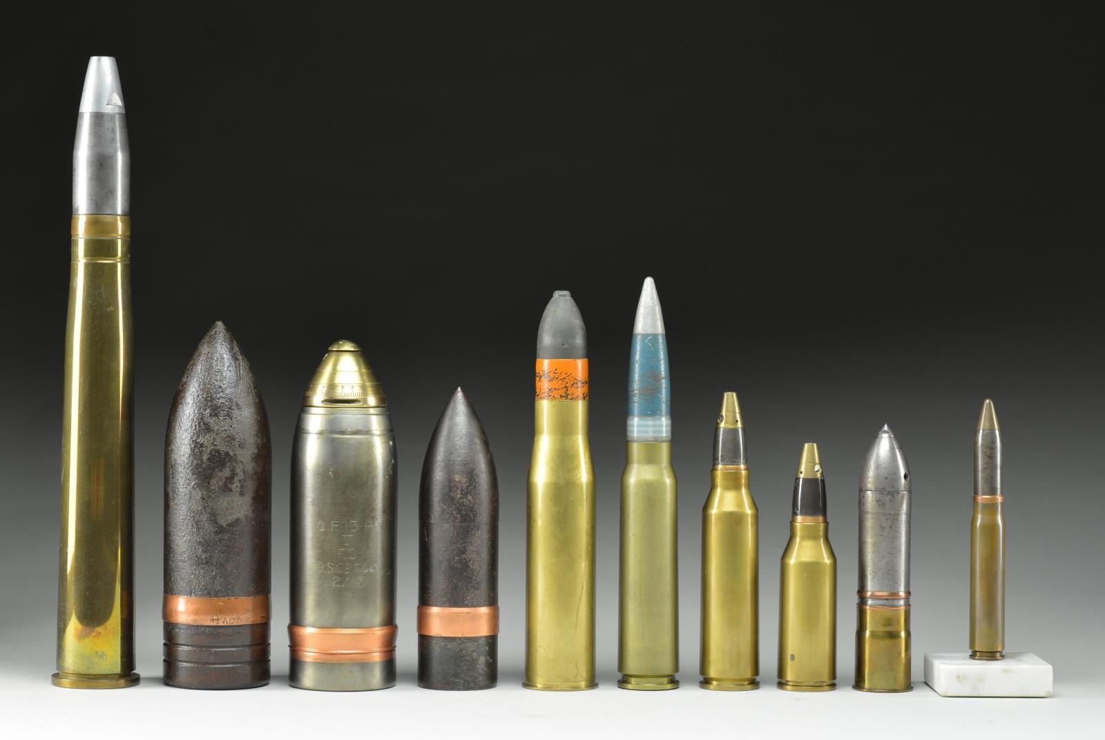 40mm MK I Bofos shell shell & head. / African Armament Corp. 37mm M17 shell. / 30mm Dummy PGU-16/B shell. / 1" shell unmarked, case length: 4 5/8". / 1" Shell unmarked, case length: 6". / WWI 1.5" Shell marked "S 989 / 1916". / 75mm timed fuse projectile for Model 1916 field artillery marked "Q. F 13 Pr / E.S. / B.S. Co I.CO. / 2/17". / 55mm Projectile dated 1906 for M777 howitzer. / 75mm projectile in similar style to M777 howitzer projectile. Wrapped in cellophane. / 20mm rnd. on marble stand. CONDITION: most in fair to good condition w/ oxidation & flaking finish. PROVENANCE: Estate Collection of Kenneth Horn (Grandson of JC Higgins). (02-16313/MD). $200-300.