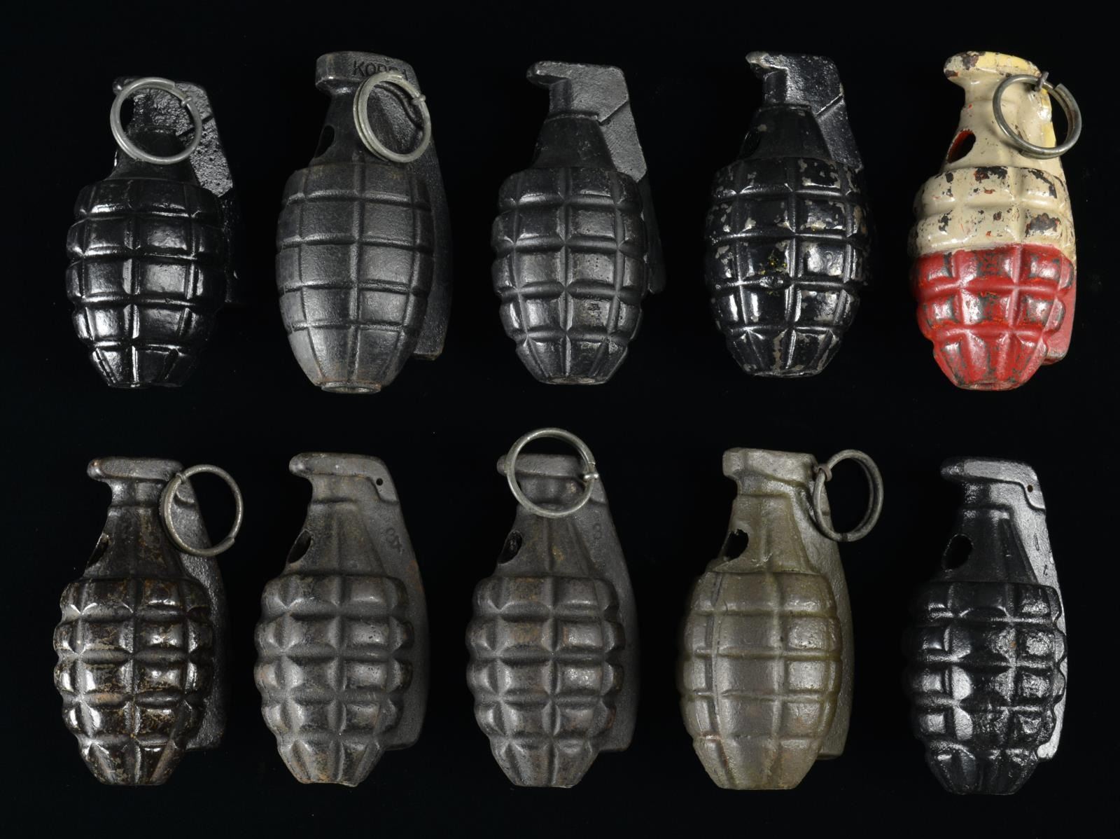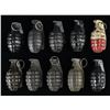 These dummy grenades have the same appearance as MK I & MK II grenades w/ 6 having pins. 1 Grenade has a white & red paint, while rest are black & gray. CONDITION: good overall appearance w/ flaking finish, scuffs, dents & scratches. (02-16245-1/MD). $200-400.