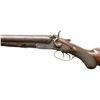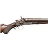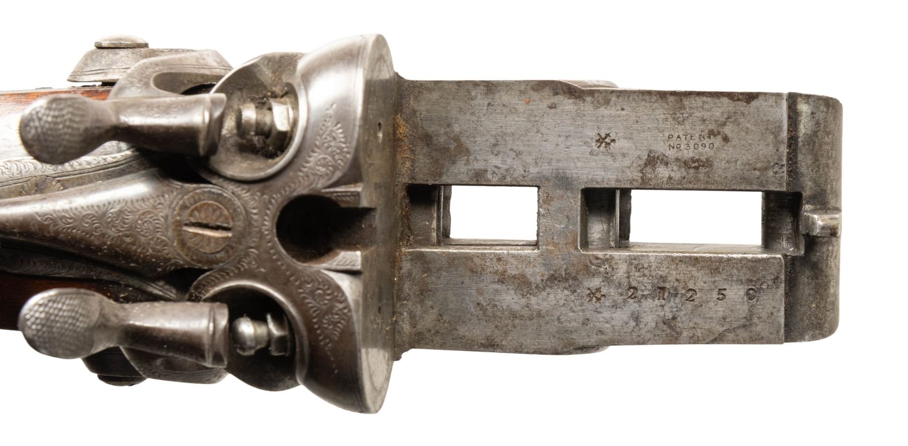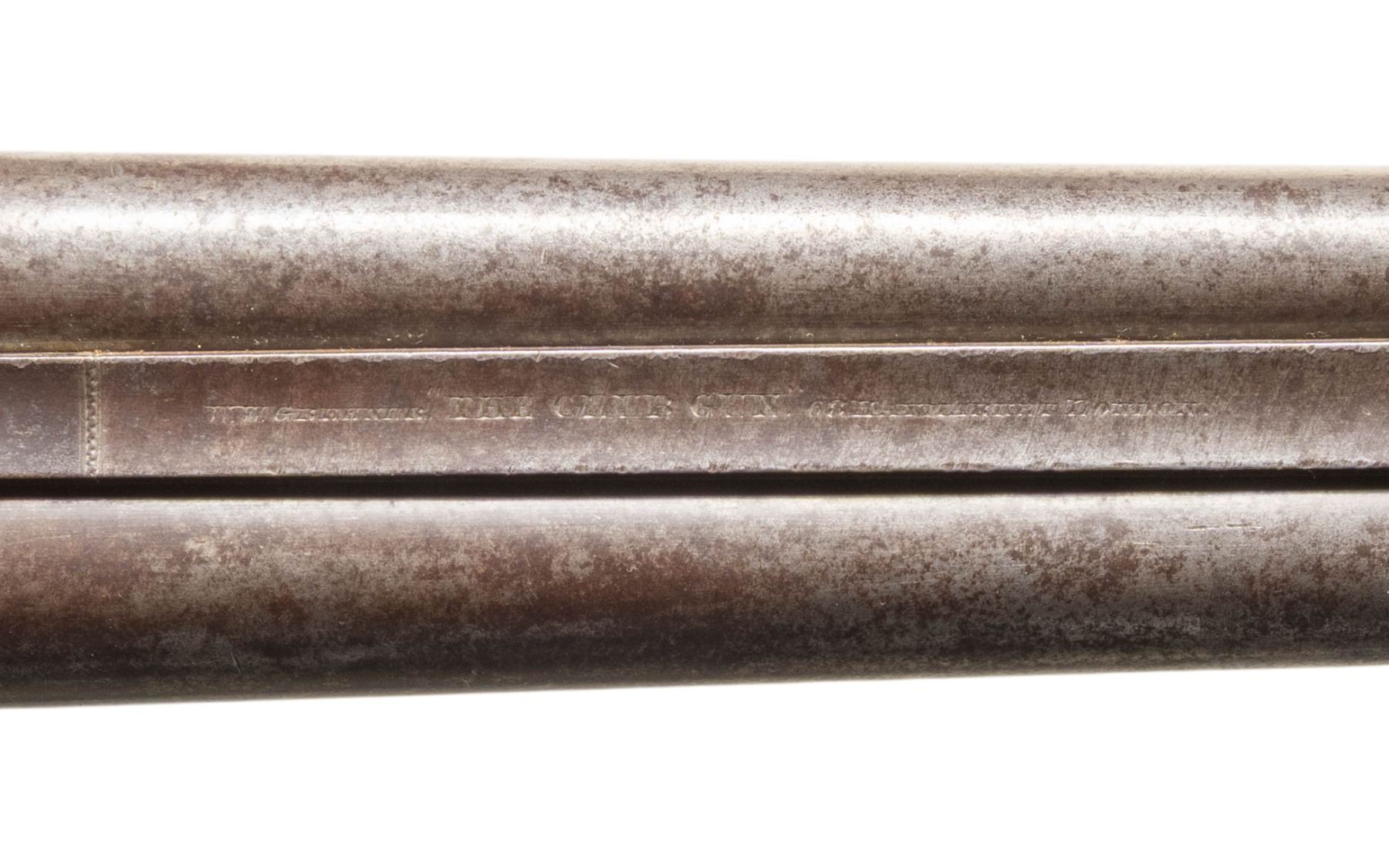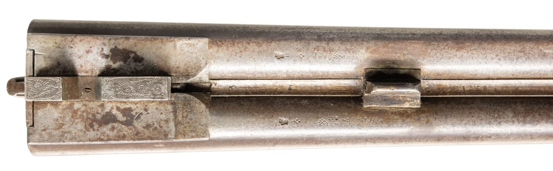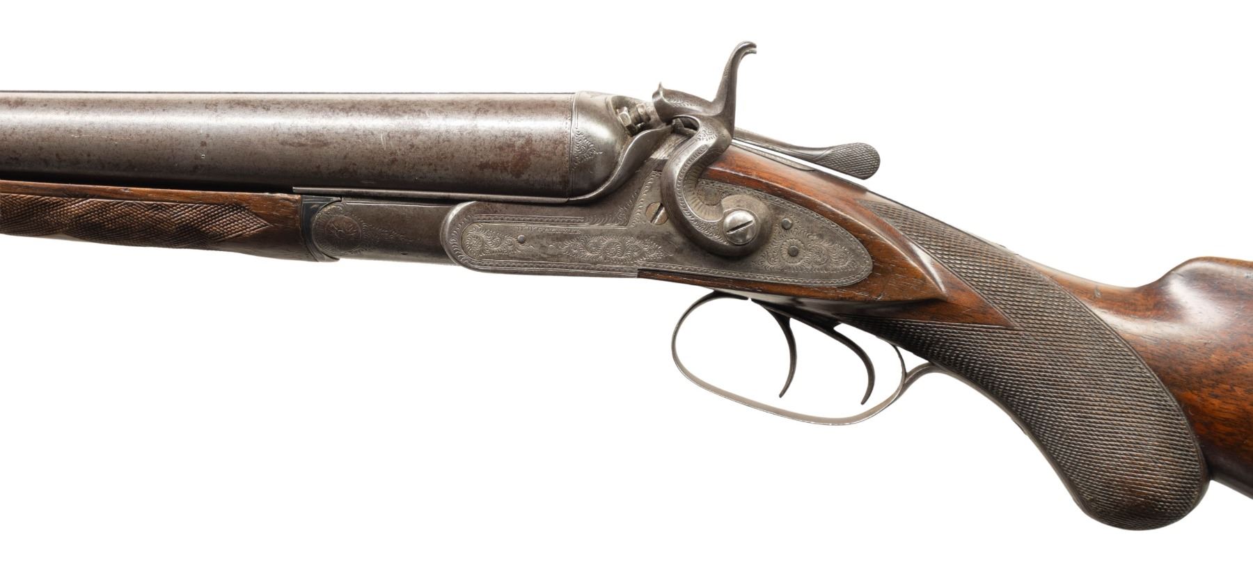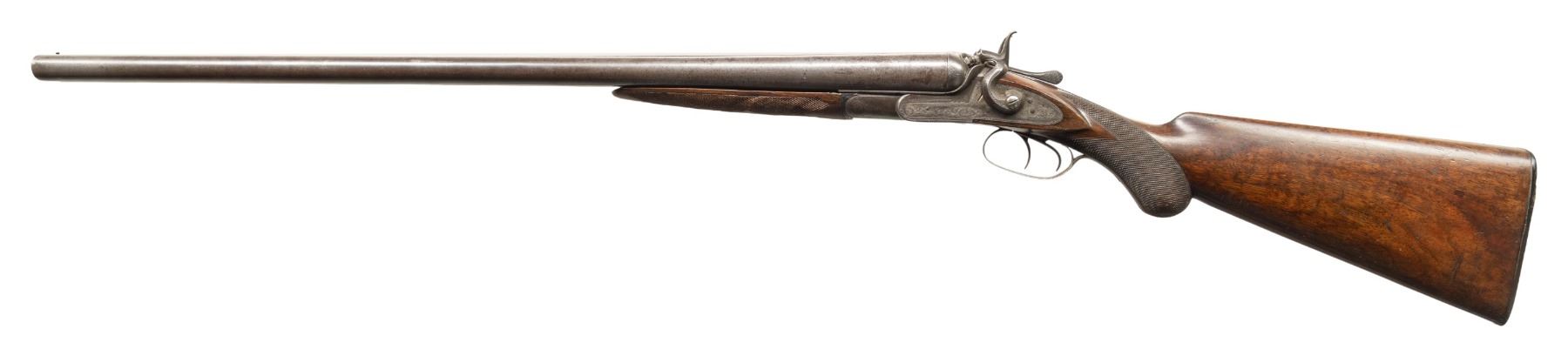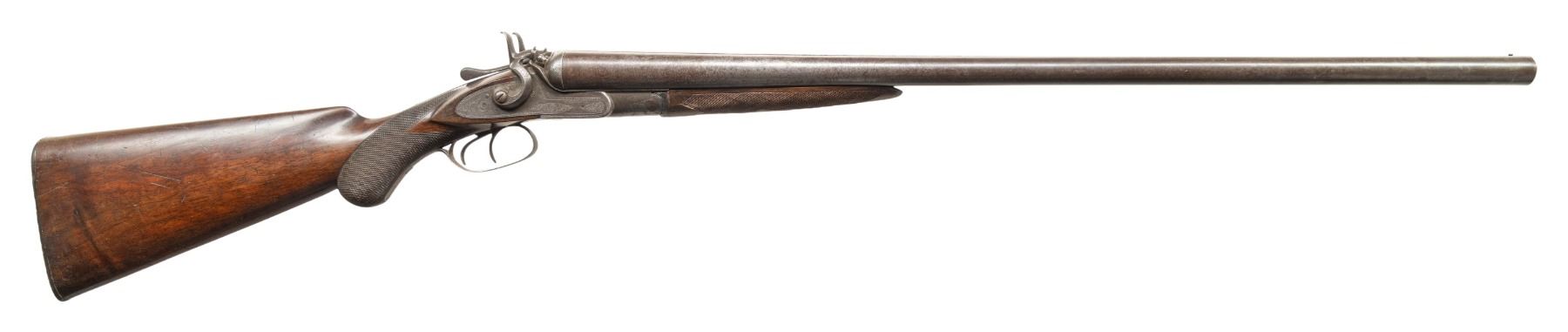 HAMMER SHOTGUN. Cal. 10 Ga. S# 21250. Bbls. 28" w/ brass bead & rib extension; water table has Pre 1887 Birmingham proof including "NOT FOR BALL" proof. Action has rebounding hammers & firing pins along with dbl. triggers & extractors. Sprays of acanthus scroll engraving on locks that extend to bottom of action, triggerguard bow, & top tang. Walnut splinter forearm with ebony tip. Rnd. knob pistol grip walnut buttstock; LOP: 13.75" to hard rubber buttplate. CONDITION: metal have gray/brown patina appearance with numerous sm. marks. Sanded & refinished forearm w/ re-cut checkering. Buttstock has good finish with numerous dings & scratches. Bores shows heavy pitting. Appears mechanically fine; barrels slightly loose to frame. PROVENANCE: From the PMRB Collection. (01-28888/MD). ANTIQUE. $500-800.