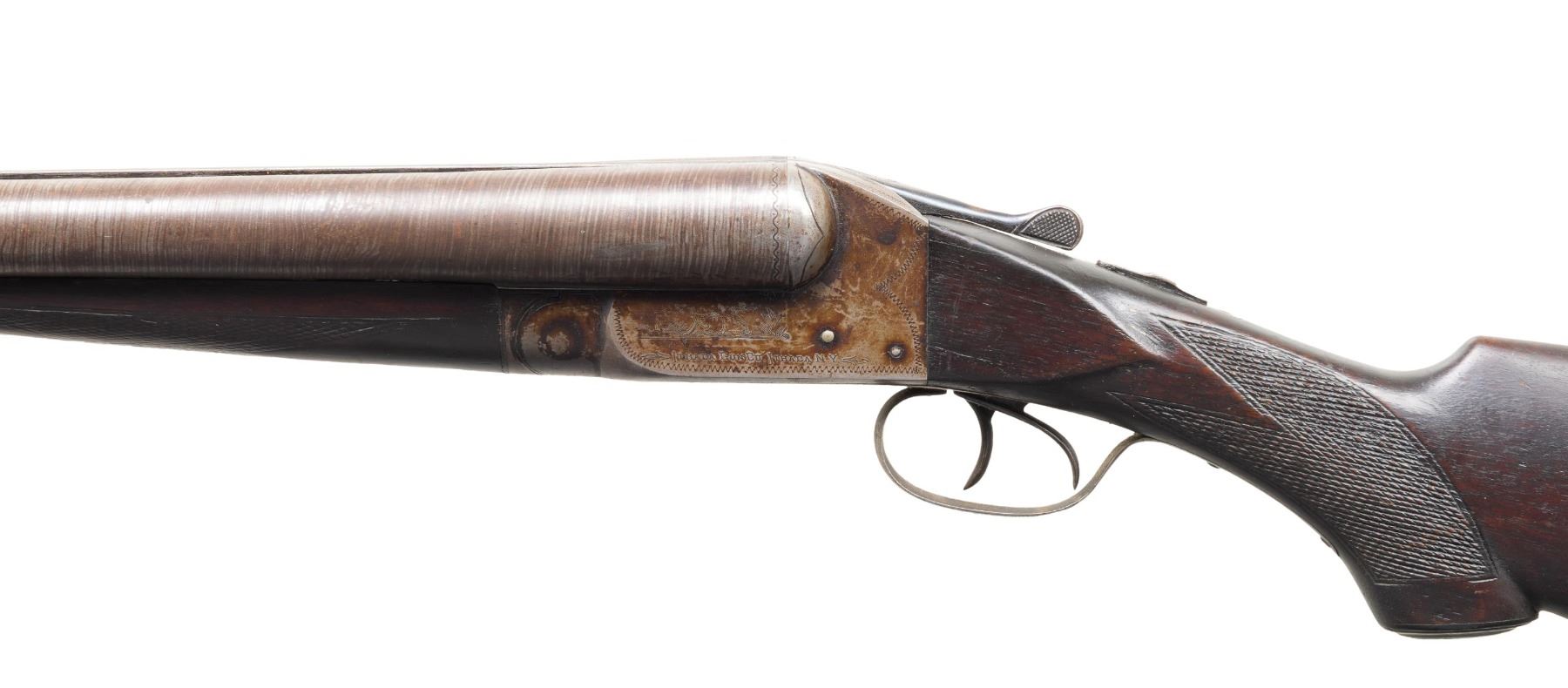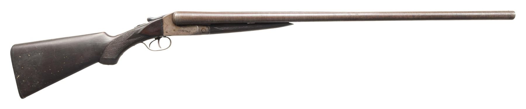 Cal. 10 Gauge. S# 267073 (1915). The matching numbered 32" barrels have matted rib with brass front bead. "4" stamped chokes on water tables. Boxlock action w/ dbl. triggers & extractors. Walnut stock set w/ matching numbers on forearm & hard rubber grip cap. LOP: 13.5" to hard rubber Ithaca buttplate. CONDITION: barrels & action have gray/brown patina appearance with corrosions along edges of action, rib & forearm edges. Wood has a dark worn appearance with worn checkering, sm. gouges, white paint spots & hairline cracks. Action appears tight. Bores show pitting. PROVENANCE: Estate of Groves Herrick. (25-5643/MD). CURIO. $300-500.