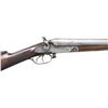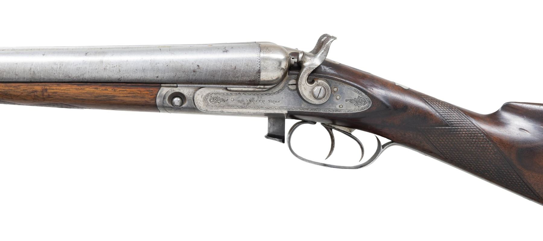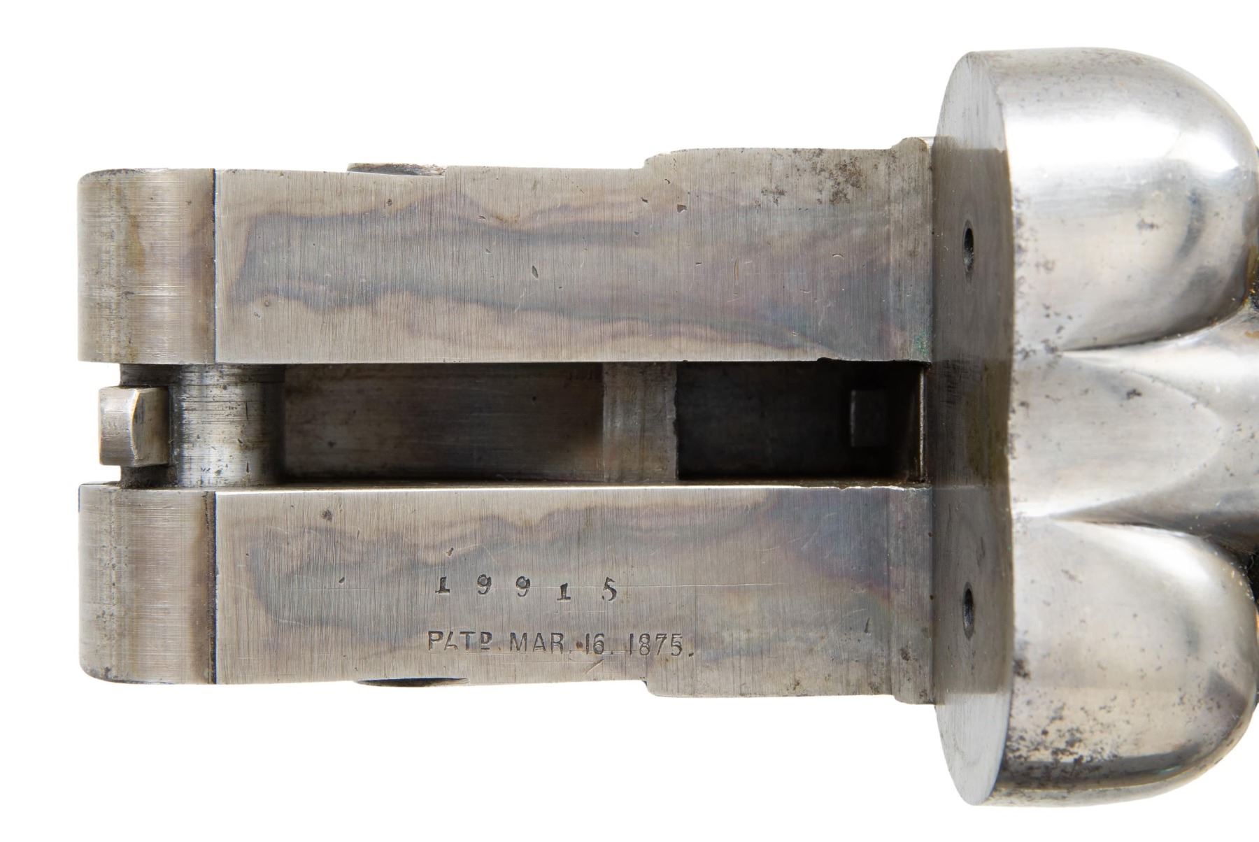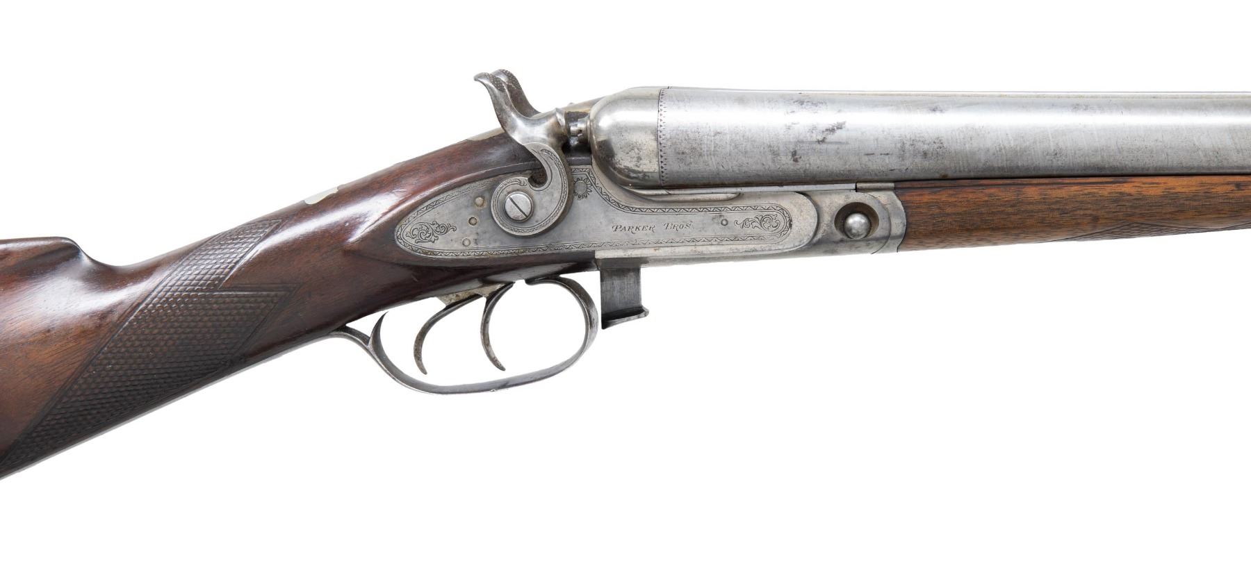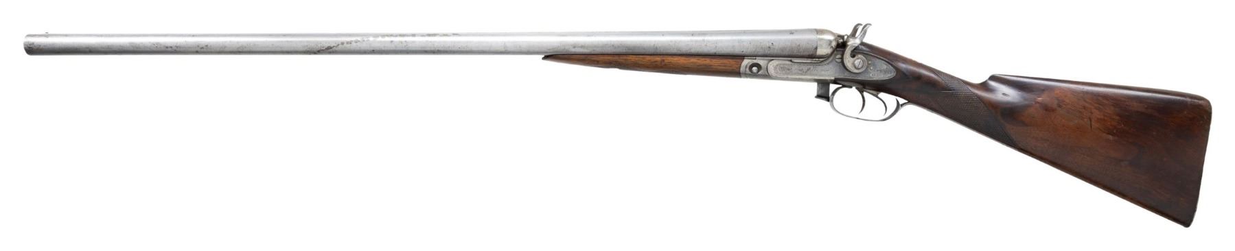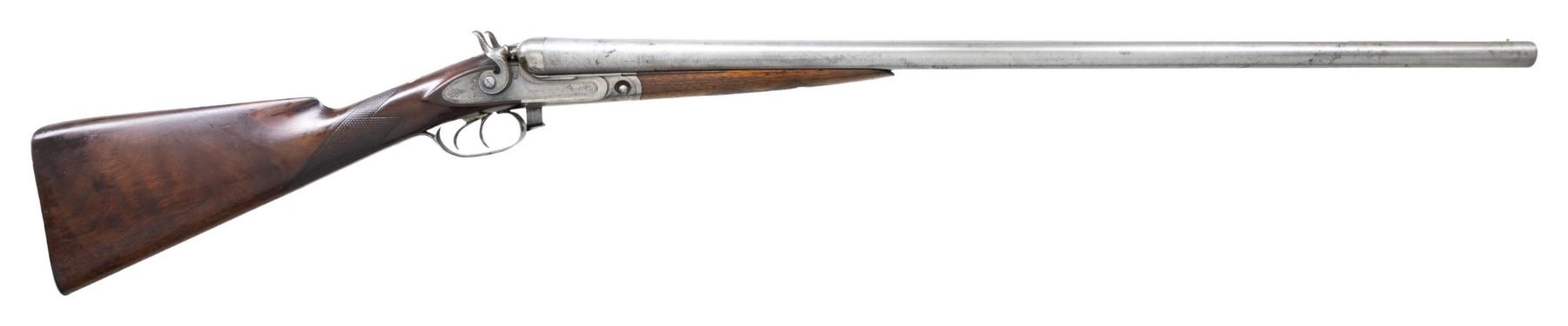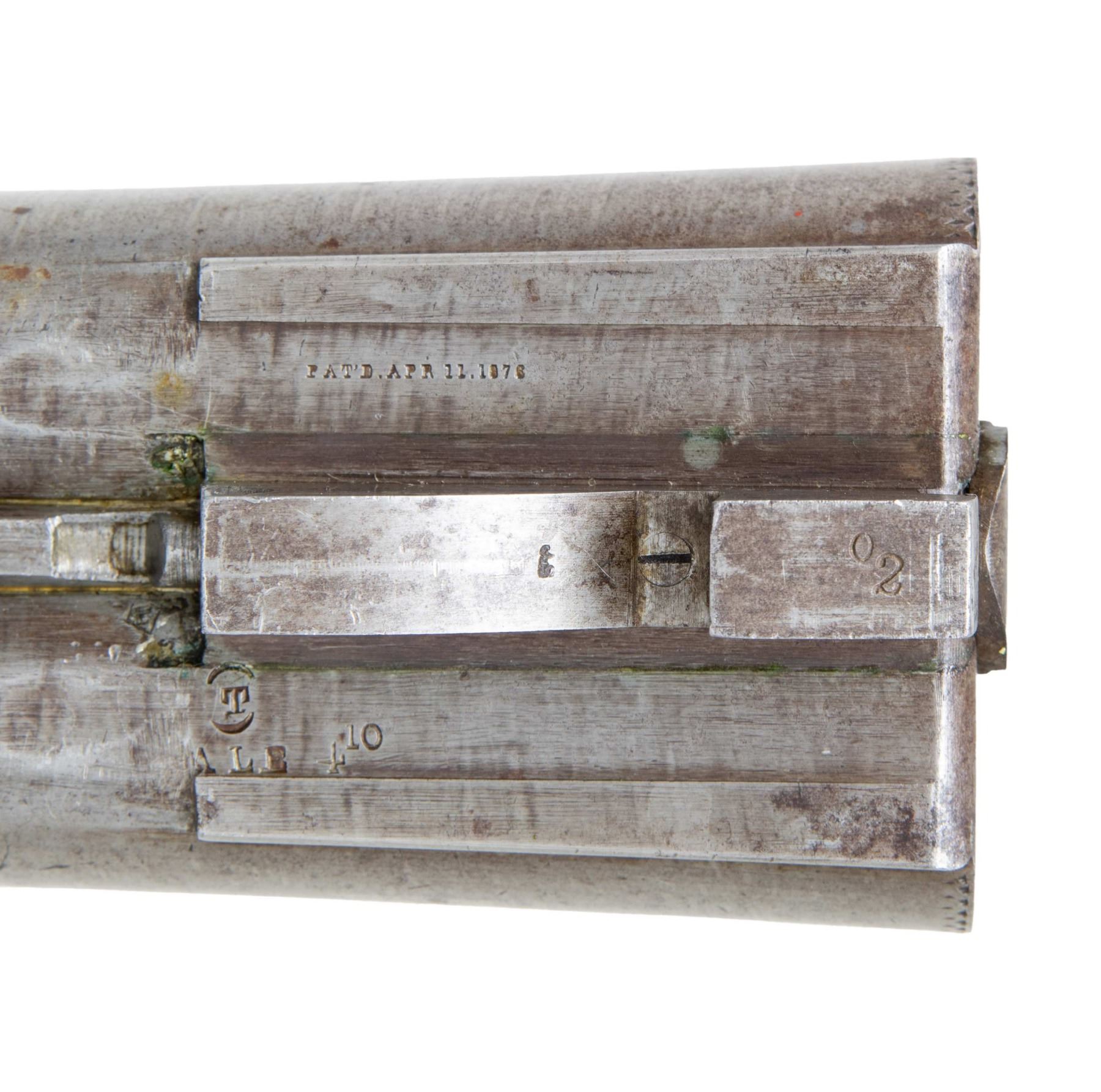 Cal. 10 Ga., 2 7/8". S# 19915. Mfg. 1880. The matching numbered Plain twist steel 30" barrels have front bead. Locks have accents of border & scroll engraving. No. 2 frame has double triggers, front lifter & extractors. Triggerguard tang has matching S# engraved. Splinter walnut forearm with checkering, steel tip, Deeley style release & matching numbered iron. Straight grip stock with checkering & German silver shield top of wrist. LOP: 13" to steel buttplate. CONDITION: barrels have gray patina appearance overall with scattered spots of corrosion & dent on left bore. Action & lock plates faint case colors mixed with hand worn silvering on edges & scattered spots of patina. Good wood finish shows wear to checkering along with scattered dings & marks. Finish is peeling in small spots throughout buttstock. Hairline cracks are present extending behind lock plates. Pitted bores. (01-27809/MD). ANTIQUE. $900-1,300.