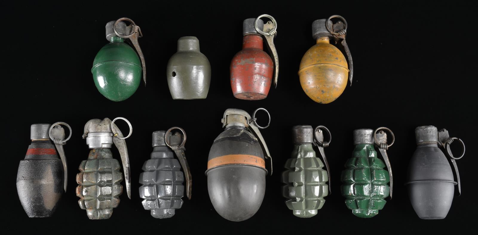 Included are 2 iron OF37 "jug" bodies, 4 sheet metal "egg" style bodies (1 noticeably larger by 1/2" diameter), 4 F1 style iron bodies & 1 cast iron "egg" body. 8 Model 36 & 2 Billant fuses. CONDITION: ranging from good oxidized w/ flaking finish to very good repainted. (02-16271-1/MD). $500-750.
