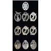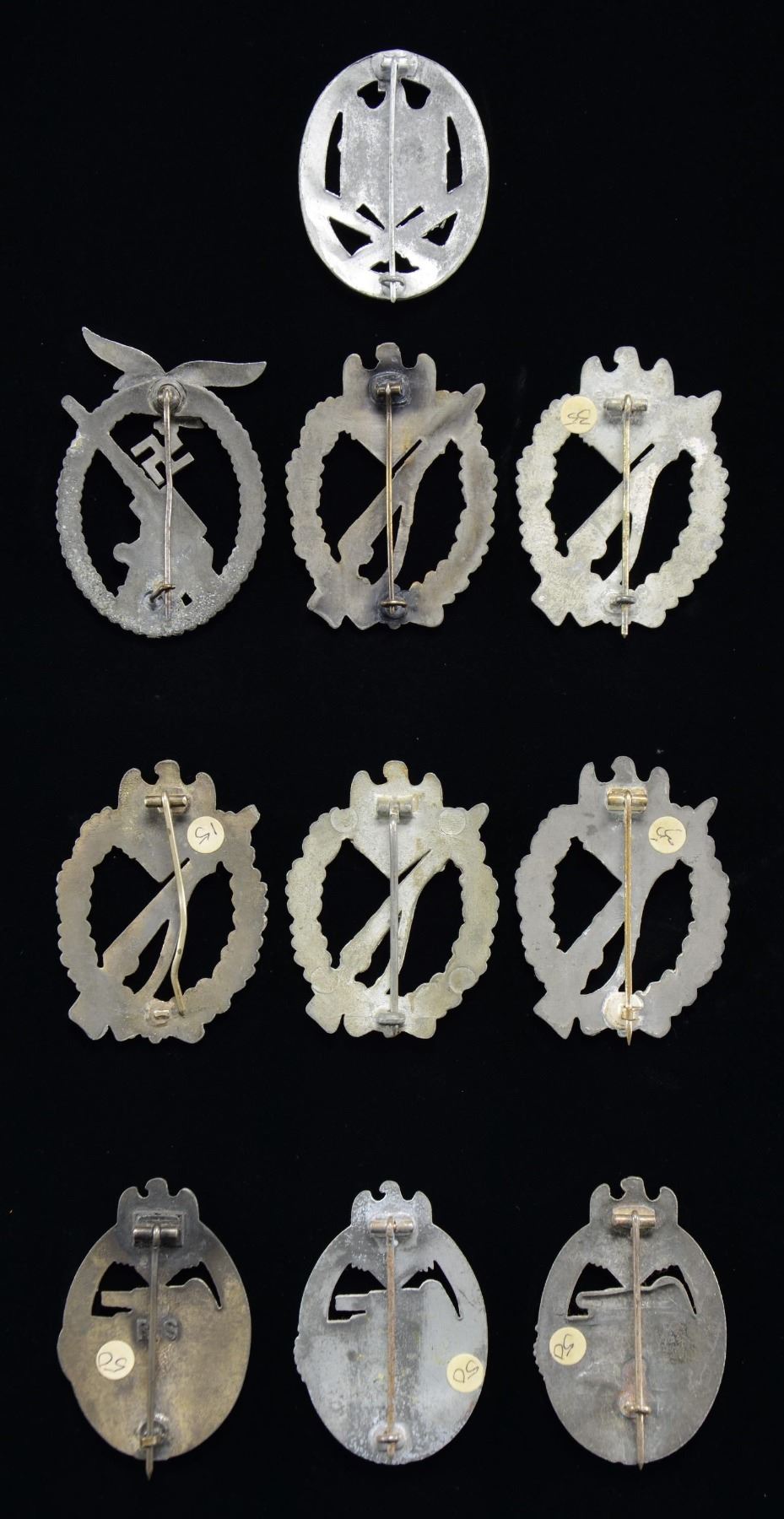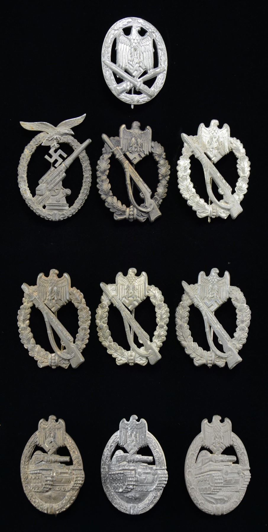 This lot consists of 5 Wehrmacht Infantry Assault Badges, none of which have markings on the reverse. / 3 Wehrmacht Tank Assault Badges, with one marked "R.S." on the reverse and the other two unmarked. / 1 Wehrmacht General Assault Badge with no markings on the reverse. This badge may be of post-WWII production. / 1 Luftwaffe Flak Badge. CONDITION: badges generally show light wear with some oxidation. One of the Infantry Assault Badges has a broken catch. The Luftwaffe Badge has a bent catch. (02-22967-2/BF). $900-1,300.