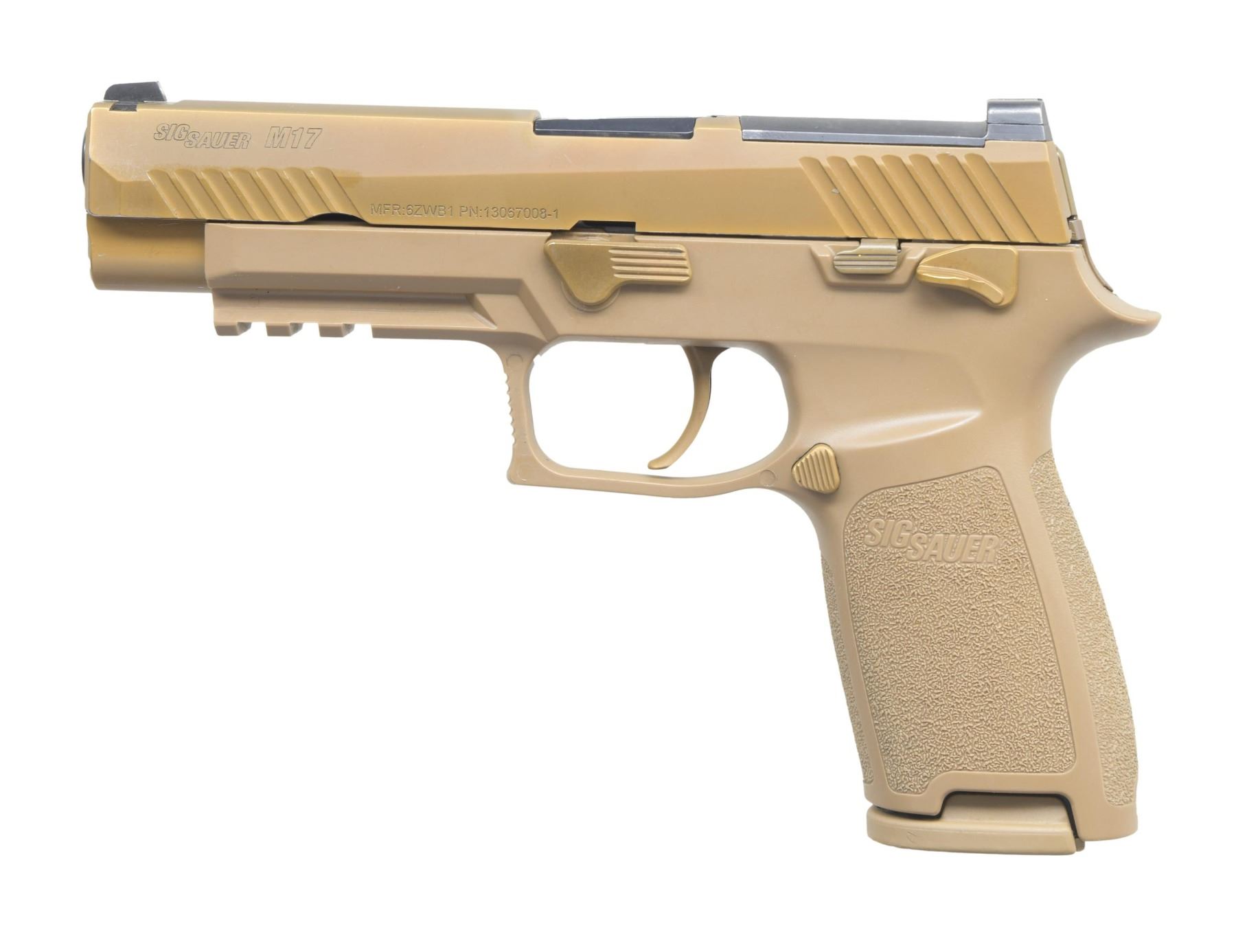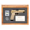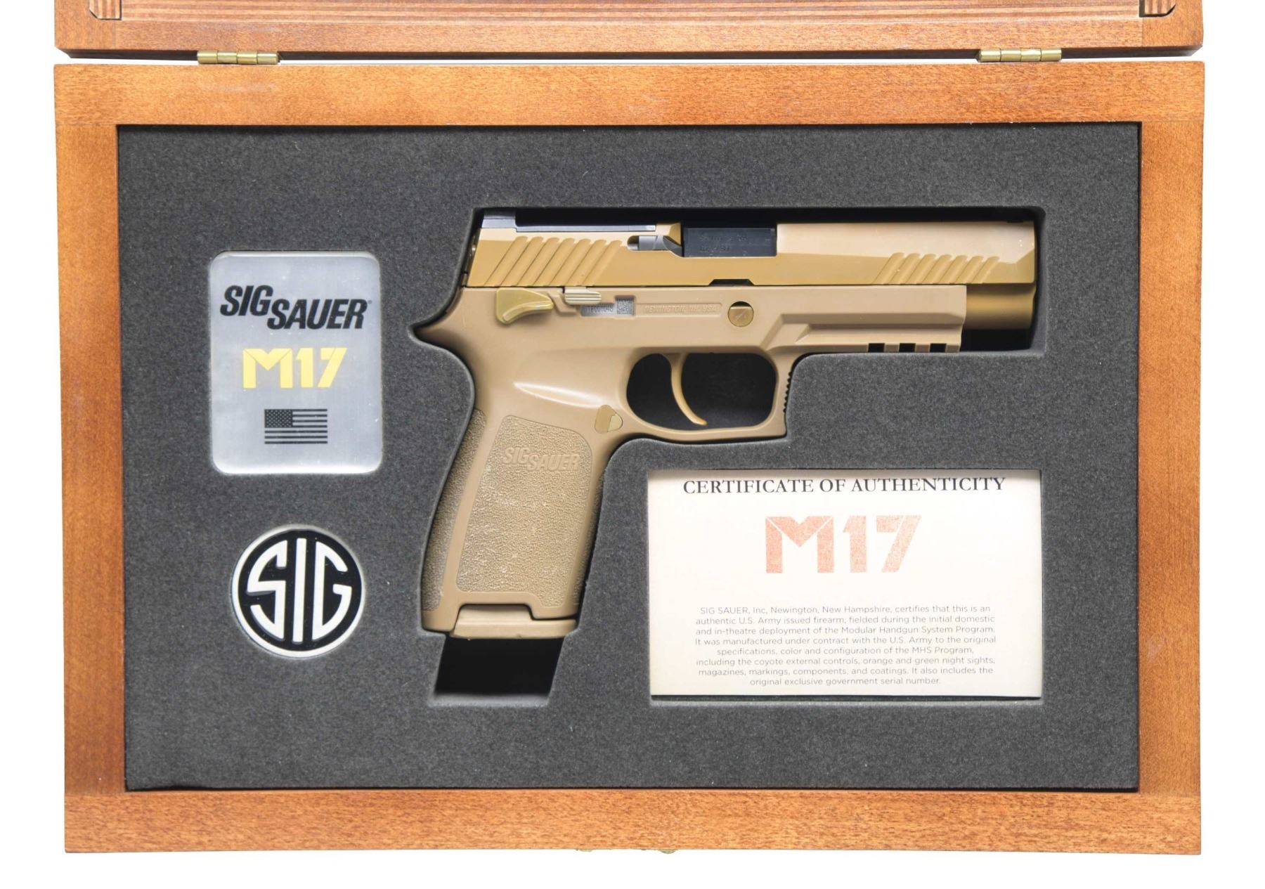 PISTOL WITH BOX, DISPLAY CASE, & FOIA LETTER. Cal. 9x19mm. S# TF001048. Bbl. 4 5/8". M17 semi-automatic pistol, mfg. by Sig Sauer under contract for the U.S. Army's MRS (Modular Handgun System) program. Left side of the slide is marked "SIG SAUER M17" above "MFR:6ZWB1 PN:13067008-1". Right side of the frame is marked with the "TF00" prefix S#, followed by Sig Sauer's mfg. information. Coyote slide, textured polymer frame, and trigger, with blued bbl., extractor, RMR plate, and iron sights. Slide and bbl. exhibit a matching "6ZWB1". MAGS: one 17-rd. and three 21-rnd. UNATTACHED ACCESSORIES: Sig Sauer display case with authenticity card and matching factory box containing paperwork and mags. This pistol is also accompanied by an FOIA (Freedom of Information Act) letter, listing amongst other dates of significance "December 13, 2017 - The HHB, 101st Airborne Division Artillery, Fort Campbell, Kentucky received the weapon from the Logistics Readiness Center - Fort Campbell, Fort Campbell Kentucky" and was returned to Sig Sauer on April 9th of 2019. CONDITION: excellent, with some light to mild wear (primarily around edges) and some superficial handling marks from previous Army use. Mirror bore, exhibiting well-defined rifling throughout. Frame exhibits some superficial handling marks, with a couple of scratches present on the right side. Box and display case are excellent overall. A very attractive example of a 101st Airborne Division-issued Sig Sauer M17 pistol. (24-5902/MLW). MODERN. $1,500-2,500.