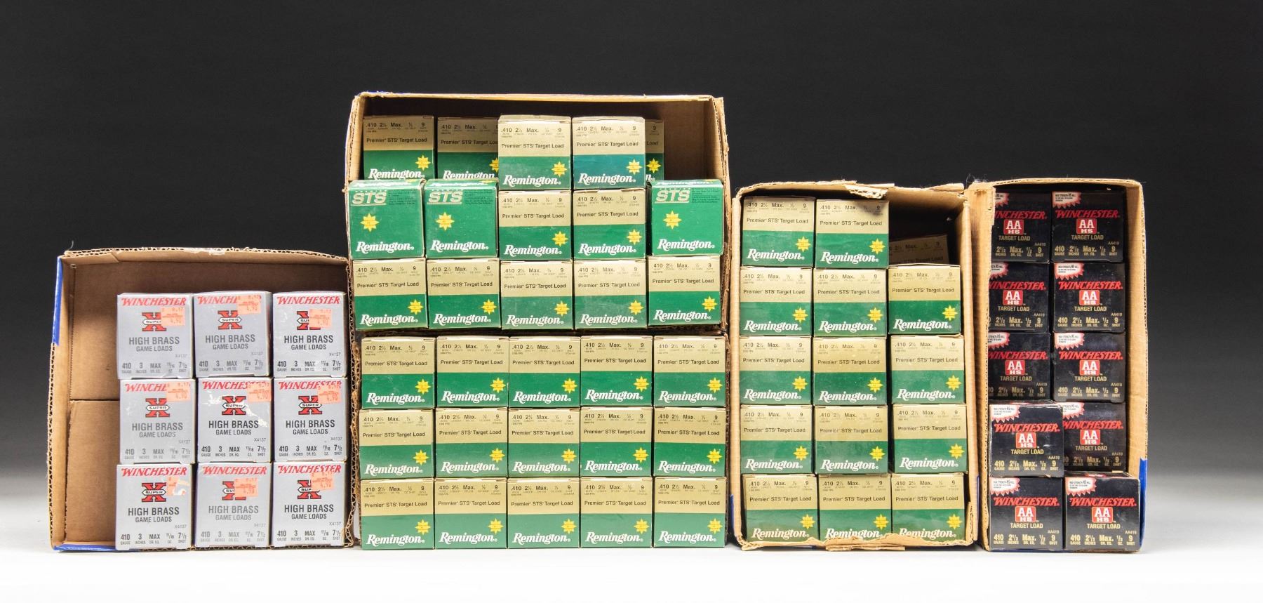 AND WINCHESTER. REMINGTON: 81 boxes of Premier Target Loads having 2 1/2" case length, Max Dram equivalence and 1/2 oz. of #9 shot. / WINCHESTER: 13 boxes with stock numbers of "AAHS" and "AA419" having 2 1/2" case length, Max Dram equivalence and 1/2 oz. of #9 shot. / 9 boxes of Super-X having stock number "X4137" with 3" case length, Max Dram equivalence and 11/16 oz. of #7 1/2 shot. PROVENANCE: Estate of Lloyd Robinson. (02-26049-6/NW). $750-1,000.
