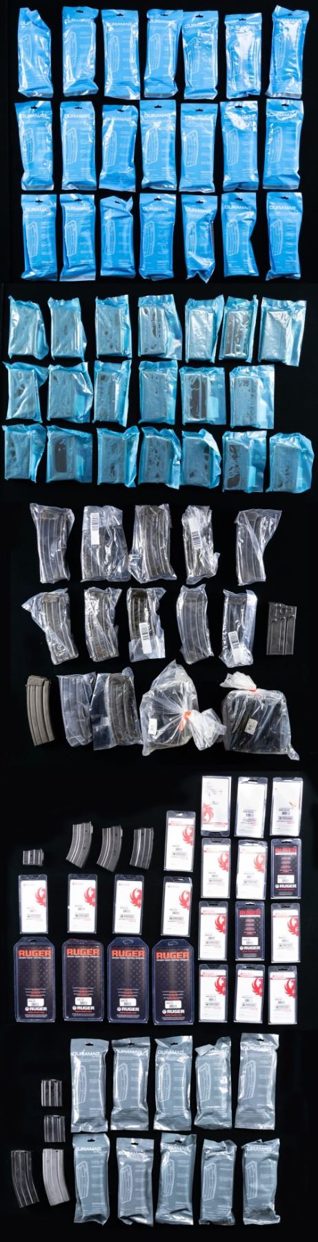 All are very good to new as noted. Count appears accurate. AR-15: 21 new black stainless DuraMags of 30 rounds each. / 10 new black aluminum DuraMags of 30 rounds each. / 1 used Colt 30 round. / 1 used C-Products of 30 rounds. / 1 used BFI of 5 rounds. / 1 Stoner of 5 rounds. GALIL: 13 very good Israeli surplus 35 round 5.56 Nato mags. / G3: 20 used aluminum 20 round mags. / 1 used steel 20 round mag. M-14: 20 new in packages Check-Mate 20 round mags. / RUGER: 4 new in package MAG30 for Mini-14 in 223 Rem. / 13 new in package MAG20 for Mini-14 in 223 Rem. / 1 used MAG20 for Mini-30 in 7.62X39. / 4 new 5 round MAG762 for Mini-30 in 7.62X39. / 1 used 5 round Mini-14 mag in 223 Rem. (02-25186-4/NW). $1,000-1,500.