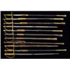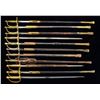 Nice group of variant contracted Civil War musician swords. Scarce Collins contract dated 1862 w/ scabbard; Emerson and Silver contract dated 1863 w/ scabbard; Roby dated 1863 w/ scabbard; 4 of Ames w/ Civil War dates, one has complete scabbard, another has a partial scabbard. The other 4 swords are imports by Horstmann, one w/ etched blade, all w/ scabbards, one w/ frog which is unsewn. CONDITION: good to very good overall. (02-14240/JS). $ 1,500-2,400.