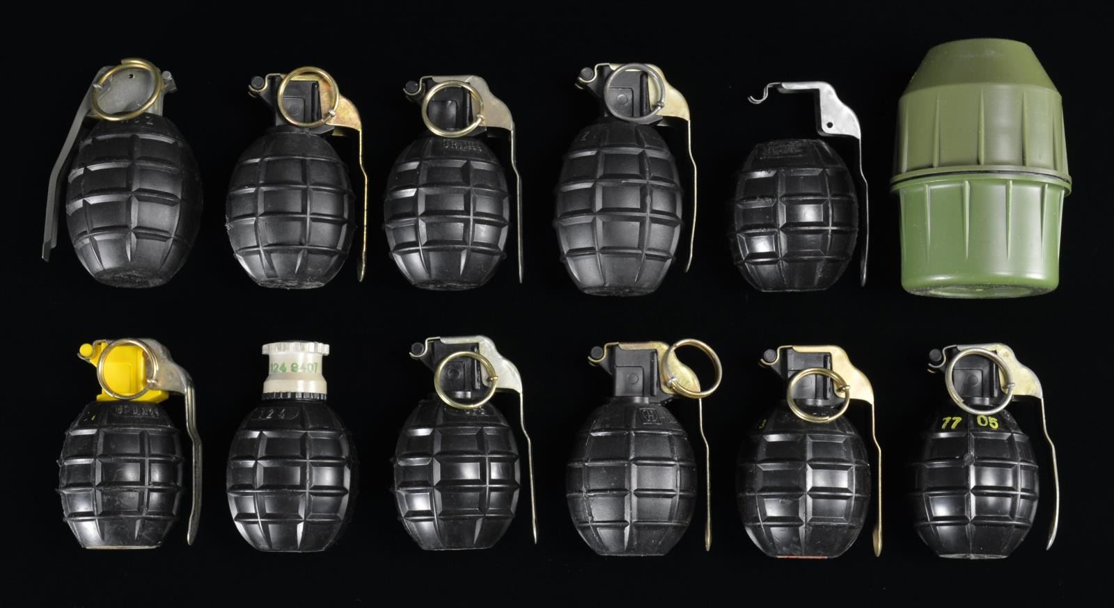 12) 1 Unmarked in M93 style mouse trap style fuse. CONDITION: fuse is broken at threads & spring holder on unmarked grenade. Otherwise, all grenades in very good overall w/ light scuffs. (02-16249-1/MD). $500-750.