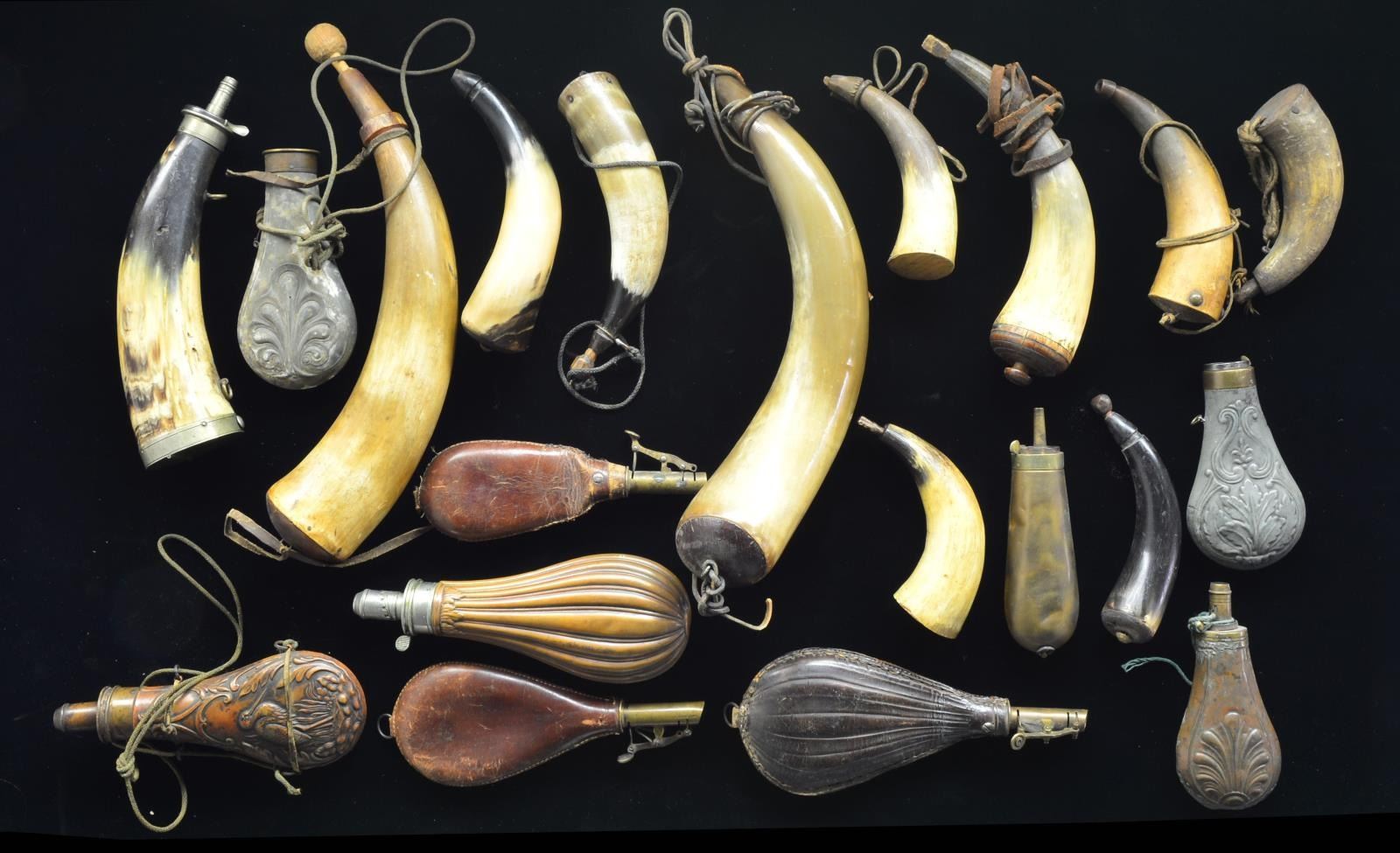 This lot contains 11 plain, undecorated powder horns ranging in size from 6" to 15 1/2". / Fluted brass powder flask by Dixon. / Brass powder flask decorated w/ a stork. / Medium bag style, brass powder flask. / Sm. fan decorated brass powder flask. / 3 Partial zinc powder flasks. / 3 Leather shot pouches w/ chargers on the tops. CONDITION: powder horns generally show light to moderate wear but remain quite solid. Several have wooden plugs intact. The brass powder flasks are generally quite solid w/ the exception of the fan decorated example in poor condition. Zinc flasks are in relic condition. Leather shot flasks show moderate wear. (02-14100/BF). $400-700.