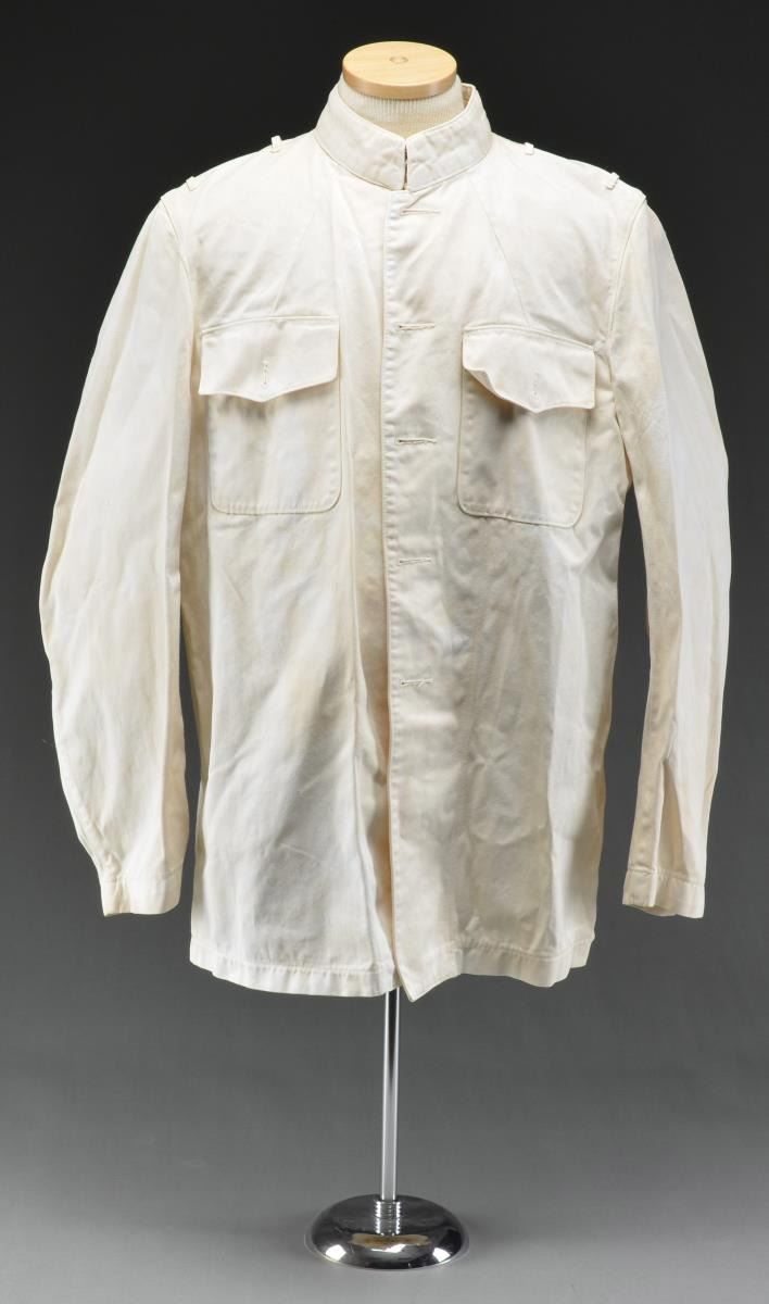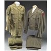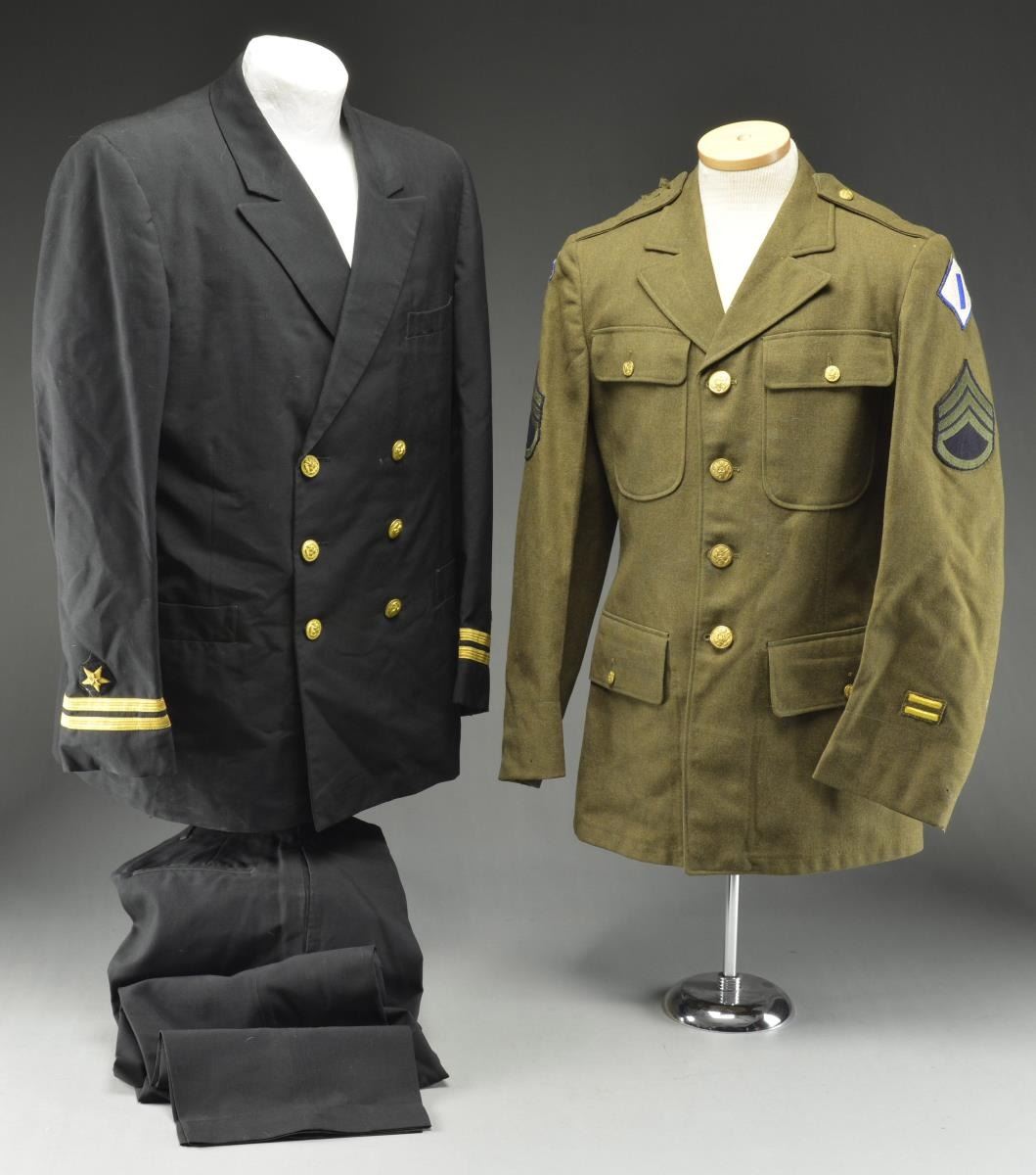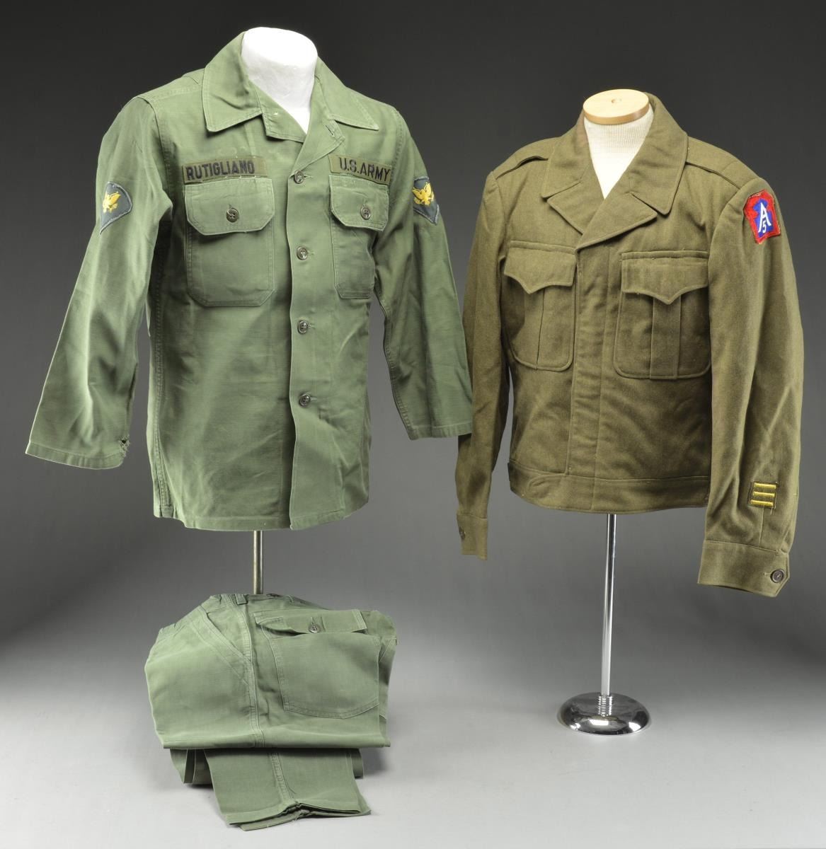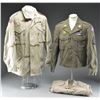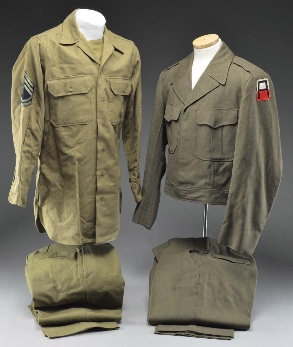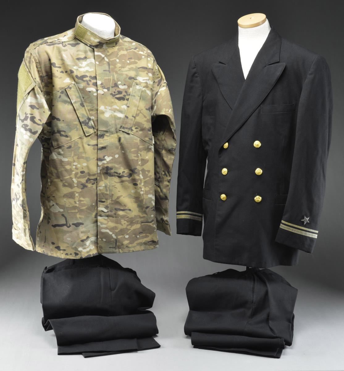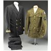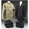 1) Green wool shirt & trousers w/ Sergeant 1st Class stripes. ID'd on inside to T/SGT Davis. 2) Ike jacket & khaki shirt. Jacket has T/SGT stripes, Signal Corp collar brass, EIB badge & WWII ribbons. Allied Forces shoulder patch on left sleeve. 88th Infantry on right sleeve. 3) Ike jacket w/ 5th Armored Division patch on left sleeve. 4) US Army tunic w/ Staff Sergeant stripes. Left sleeve has 1st Service Command patch. Right sleeve has 88th Division patch. 5) Vietnam Era fatigue shirt w/ 25th Infantry Division patch & Specialist IV insignia. 6) WWII Vintage Ike jacket & pants w/ 1st Army shoulder patch. 7) 1 US NAVY uniform coat w/ gold stripes & star. w/ trousers. 8) 1 US NAVY uniform coat w/ gold stripes & star. w/ trousers. 9) White hook fastened standing collar shirt w/ patch pockets. 10) Desert camouflage field coat US Army Persian Gulf War era. 11) Multi-cam combat coat by Propper Mfg. CONDITION: uniforms are in generally good condition w/ scattered wear, insect damage & staining.(02-18143/RW/MD). $50-100.