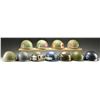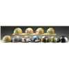 LINERS. This varied group of liners includes 1 black painted liner for a Lieutenant in the Military Assistance Command. / 1 Green painted liner for a Lt. Col. in the Military Assistance Command. / 1 Green painted liner for the Military Assistance Command with a 101st Airborne insignia on the front. / 1 Green painted liner for the Military Assistance Command with a medic's insignia on the front. / 1 Green painted liner for the Military Assistance Command with 82nd Airborne insignia on the front. / 1 Green painted liner for the Military Assistance Command with Special Forces Group insignia. / 1 Green painted liner with "PRESS" painted on the side & an "AP" insignia on the front for Associated Press. / 1 Elaborately painted liner for the 2nd Recon of the 5th Special Forces Group. / 1 Green painted liner for the South Vietnamese with a large "QC" on the front. / 1 Blue painted liner with a yellow & white stripe & a South Vietnamese Air Force eagle on the front. / 1 Gray painted liner with a Petty Officer 2nd Class insignia on the front. CONDITION: all liners show light to moderate wear & most colors remain sharp. (02-16357/BF). $900-1,400.