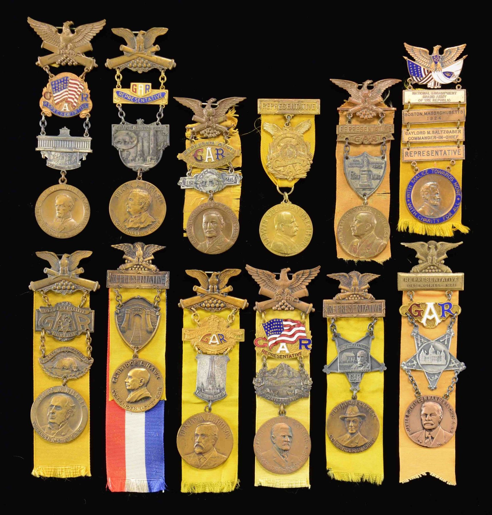 This large and very attractive group of GAR National Encampment Medals includes 1 Representative to the 1923 encampment in Milwaukee. / 1 Representative to the 1924 encampment in Boston. This medal is missing two attachment rings. / 1 Representative to the 1919 encampment in Columbus, OH. No ribbon. / 1 Representative to the 1920 encampment in Indianapolis. / 1 Representative to the 1927 encampment in Grand Rapids, MI. / 1 Representative to the 1928 encampment in Denver. / 1 Representative to the 1931 encampment in Des Moines, IA. / 1 Representative to the 1930 encampment in Cincinnati. / 1 Representative to the 1918 encampment in Portland, OR. / 1 Representative to the 1929 encampment in Portland, ME. / 1 Representative to the 1925 encampment in Grand Rapids, MI. Tattered ribbon. / 1 Representative to the 1922 encampment in Des Moines, IA. CONDITION: all medals generally show light wear, except as noted above. (02-23014/BF). $700-1,200.