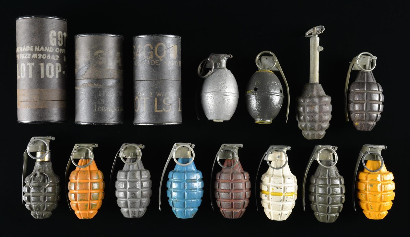 A variety of different finished grenades used from Inter War period through Cold War. 10 "Pineapple" F1 & 2 "egg" cast iron bodies. 1 Grenade has blue finish & other has white finish w/ yellow band indicating training grenades. Fuses include M1, M6A3, M6A4C, M10, M10A2, M10A3, M204A2, & M60. Also included are 3 black painted paperboard containers for MK II & MK III grenades. CONDITION: fair to very good w/ different degrees of wear, flaking finish & oxidation. (02-16245-4/MD). $350-500.