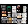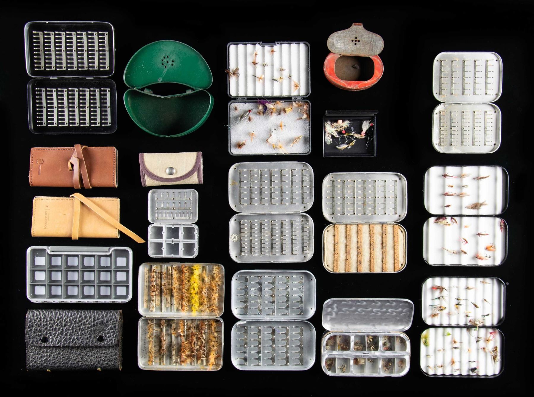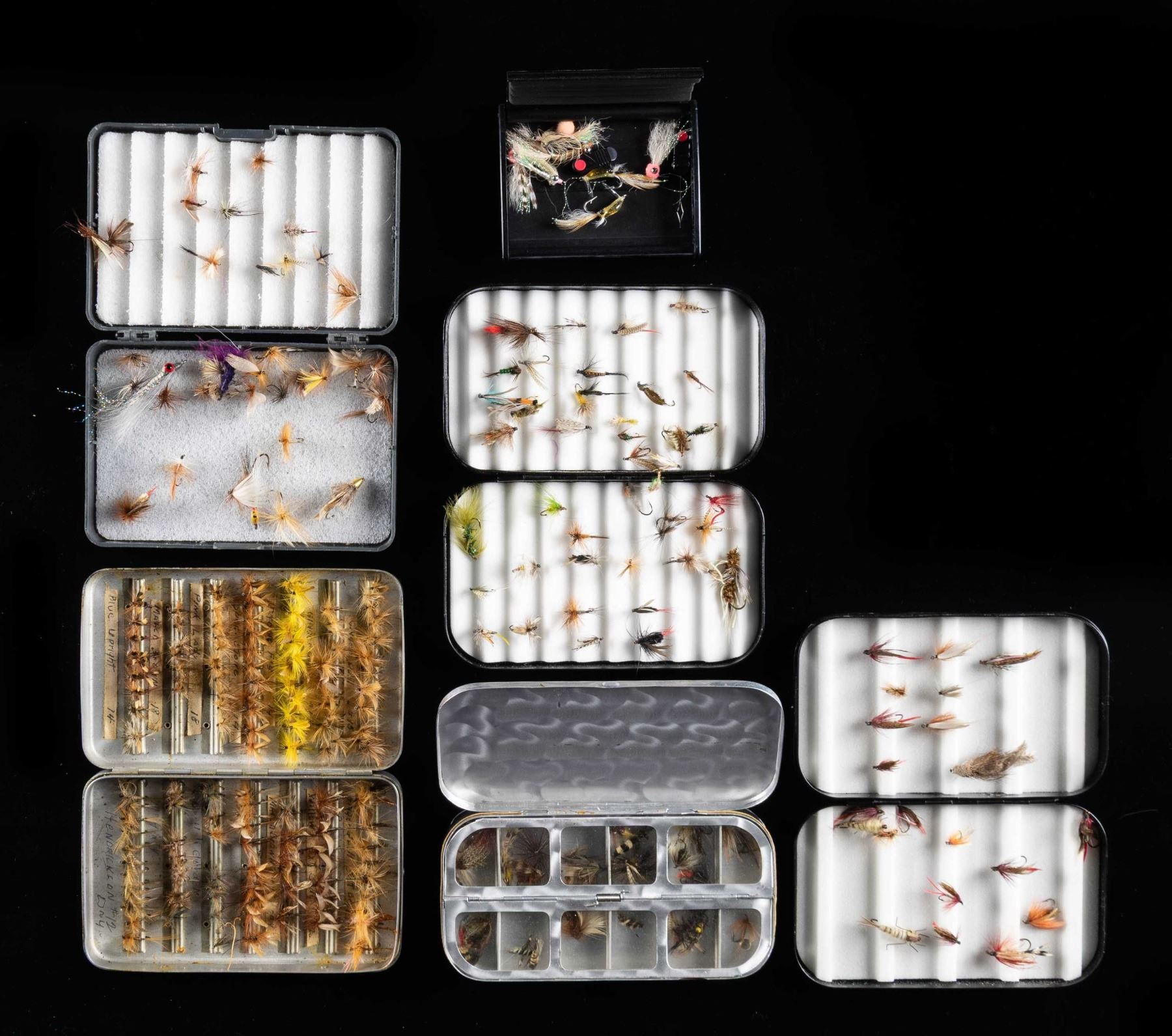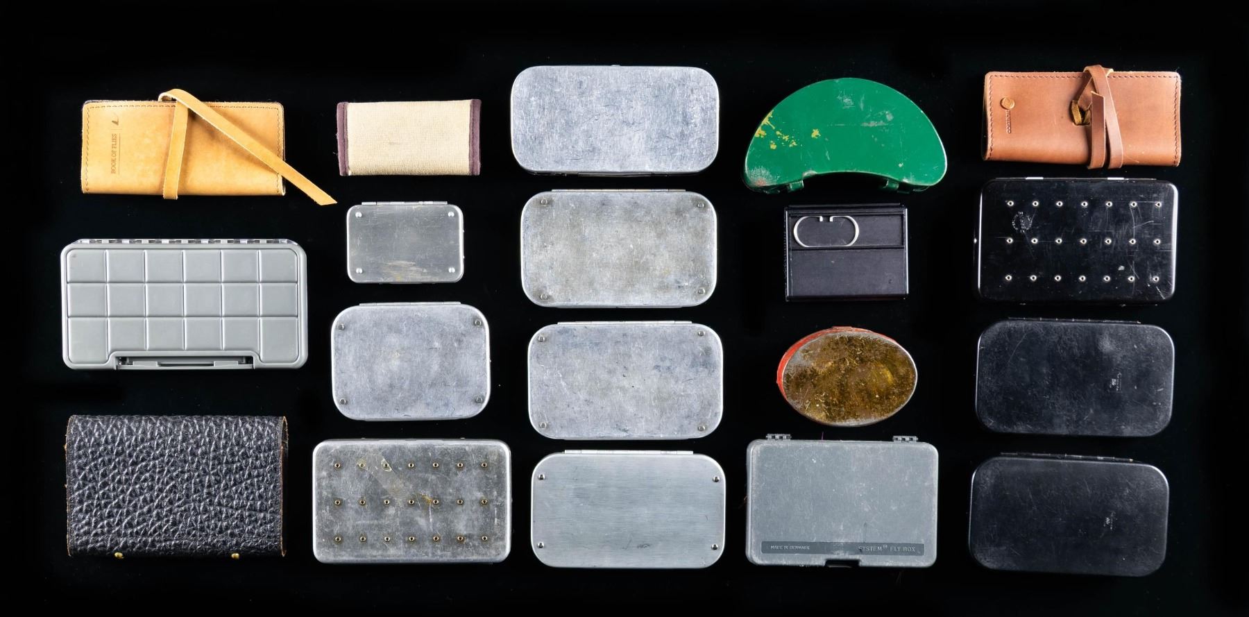 CANS. 1) 5 - Aluminum Wheatley boxes with spring clips: 3-6" 1- 5" 1-3-1/2" which has compartments as well. CONDITION: good to fine. 2) 2 - 6" Black anodized Wheatley boxes with foam interior each containing approx. 20+ flies. CONDITION: very fine. 3) 1 - 6" Unmarked Wheatley type aluminum box containing over 120 dry flies. CONDITION: good. 4) 1 - 6" Aluminum and leather covered box with 12 compartments containing over 20 flies. CONDITION: good. 5) 1 - 6" Black anodized box by Perrine with spring clips. CONDITION: very fine. 6) 1 - 4" "The Fly Trap" black anodized with 7 bone fish flies. CONDITION: very fine. 7) 1 - 7" Hard plastic box with compartments. CONDITION: very fine.8) 1- 6" "Scientific Anglers" plastic with over 20 flies. CONDITION: good. 9) 1- 6-1/2" "Common Sense" black leather fly wallet. CONDITION: fine. 10) 2- 6" Leather "Book of Flies". CONDITION: very fine. 11) 1- 4" Canvas fly wallet by Orvis. CONDITION: very fine. 12) 1- 6" green tin worm box. CONDITION: very fine. 13) 1- 4" early oval red tin worm box. CONDITION: good. PROVENANCE: From the Private Collection of Berrien Moore III. (02-25870-10/MGM). $500-1,000.