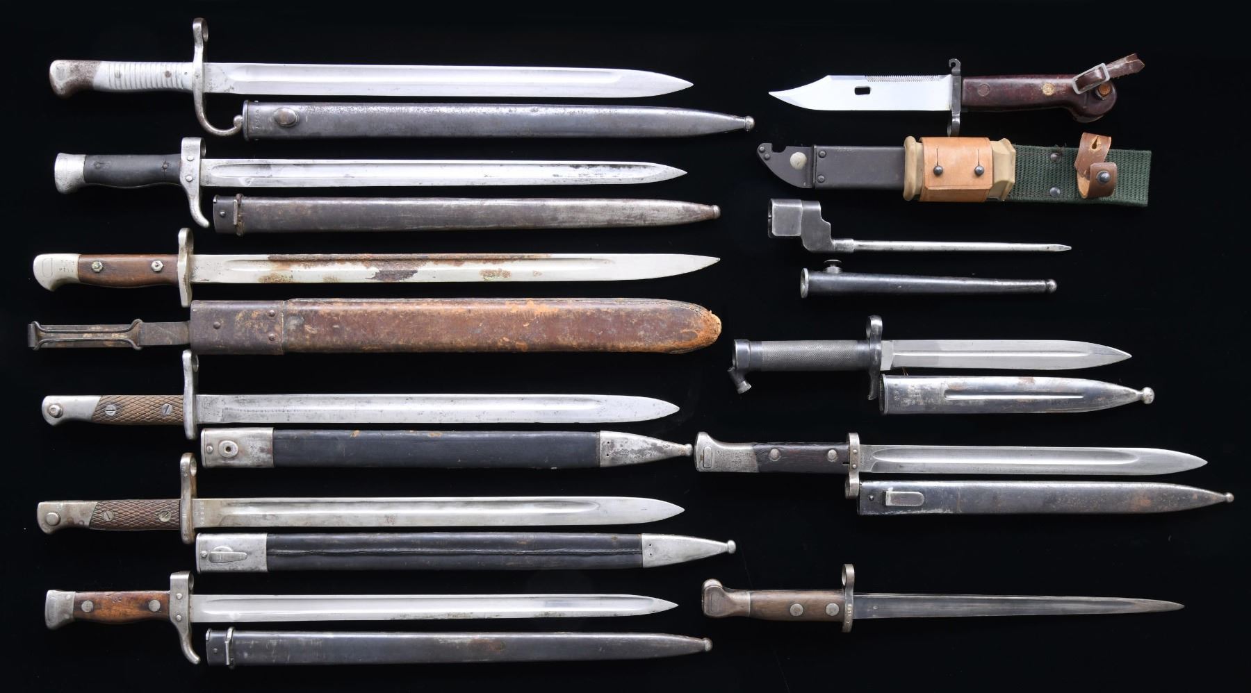 This varied lot of bayonets contains 2 M1892 French bayonets, one of which has a cracked composite grip. / 1 British P1907 bayonet in a US M1905 leather-covered scabbard with an iron belt loop. Blade shows heavy oxidation. / 1 British No. 4 MKII bayonet. / 2 Spanish M1893 long bayonets. / 1 Argentine M1891 bayonet with alloy grips. / 1 Russian M1968 SVD bayonet. / 1 Dutch M1895 bayonet for the Mannlicher rifle. This bayonet does not have a scabbard. / 1 Czechoslovakian VZ23 long bayonet. / 1 Swedish M1896 bayonet. CONDITION: all bayonets are complete with scabbard, except as noted. All bayonets show use and are in average condition, except as noted. (02-23381-1/BF). $500-800.
