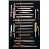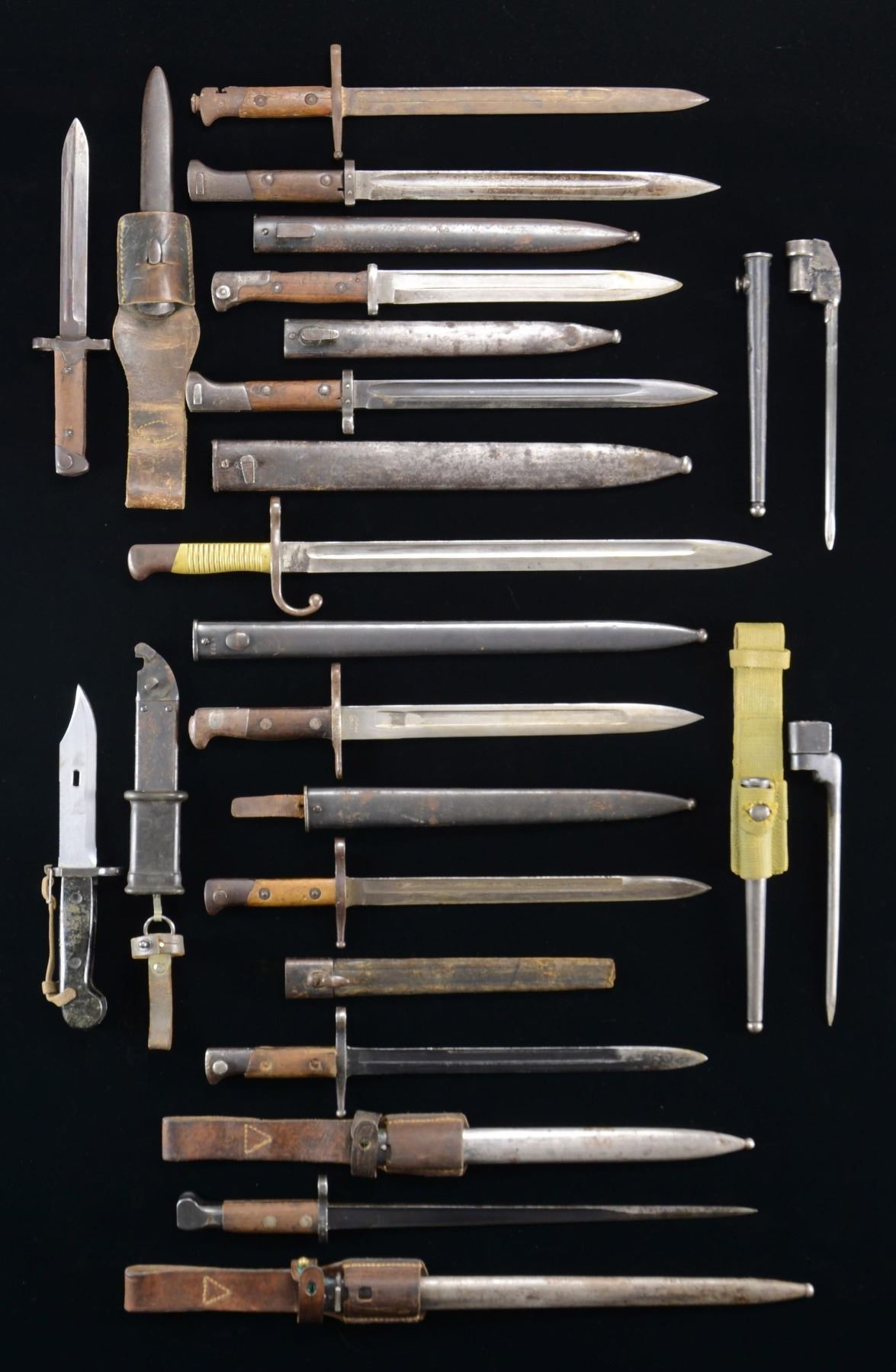 This varied lot of bayonets includes 2 VZ24 Czech bayonets with scabbards. / 1 British No. 4 MKII spike bayonet with scabbard and canvas frog. / 1 British No. 4 MKIII bayonet with scabbard. / 1 Italian M1938 fixed bayonet with scabbard and frog. / 1 Italian M1891 Carcano bayonet with iron scabbard and frog. / 1 Italian M1891 Carcano bayonet with leather scabbard missing the tip. / 1 Italian M1891 Carcano bayonet, in poor condition, with no scabbard. / 1 Dutch M1895 artillery bayonet with scabbard and frog. / 1 Argentine M1891 bayonet with scabbard. Hilt has 2-piece brass grips with iron guard and pommel. Darkened scabbard with unmatching serial numbers. / 1 Swiss M1889 bayonet and scabbard. Bayonet is marked "WAFFENFABRIK NEUHAUSEN". / 1 Czechoslovakian VZ24 bayonet with an open muzzle ring and unassociated scabbard. / 1 Russian M1968 SVD bayonet and scabbard. CONDITION: bayonets are generally in good, solid condition, with a moderate amount of use, except as noted above. (02-22801-10/BF). $500-800.