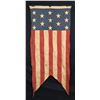 This very interesting and attractive banner measures approx. 36" x 72" and is swallowtail in form. It likely dates from as early as the centennial period to possibly as late as the Spanish American War. The banner has a 2 1/4" white cotton hoist with an open sleeve to facilitate hanging from a pole. At each end of the hoist is a cut hole to facilitate tie suspension. There is no evidence of grommets, either brass or sewn. The wool bunting blue field extends about 17 1/2" down from the top and features 13 cross-sewn white cotton stars on each side. There are five red vertical cotton stripes and four white vertical cotton stripes ending in a swallowtail form. CONDITION: The banner is in very solid condition with minimal small tears or holes. The colors are a bit faded, and the white cotton is a bit yellowed. The tips of the swallowtail are somewhat tattered, but the banner displays beautifully. (02-23766/BF). $500-800.