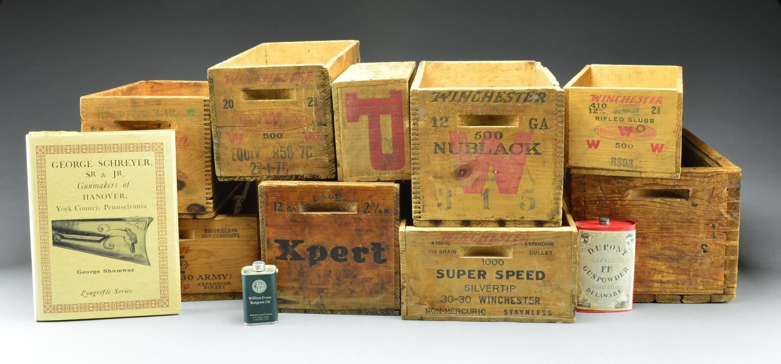 RELATED ITEMS. Manufacturers are Winchester, Remington, Peters & Western. Boxes have wide assortment of sizes. The smallest measures 9 1/4" X 6 1/2" X 4 1/2". The largest measures 18 1/4" X 11" X 9 1/2". Covers are not present. Other items include: 3 mounted Winchester mag. advertisements from the 1920s, copy of "George Schreyer, Sr & Jr, Gunmakers of Hanover, York County, Pennsylvania" by Shumway, vintage black leather flap holster for sm. frame revolver, S&W revolver box for Model 18-4 4" bbl. revolver w/ accessory packet, Dupont red oval powder can, early Dupont rnd. green smokeless powder can w/ gun dog motif, can of Williams Evans rangoon oil, & E.J. Churchill hand protector for double shotgun. CONDITION: boxes are in worn condition w/ staining, chipping & fading of lettering. Holster has wear, scuffing & cracking. Red powder can in good condition w/ light wear & scattered scratches. Smokeless can has notable wear, scratches & darkened appearance. (02-15711/RW). $400-600.