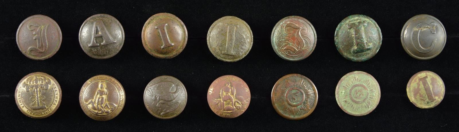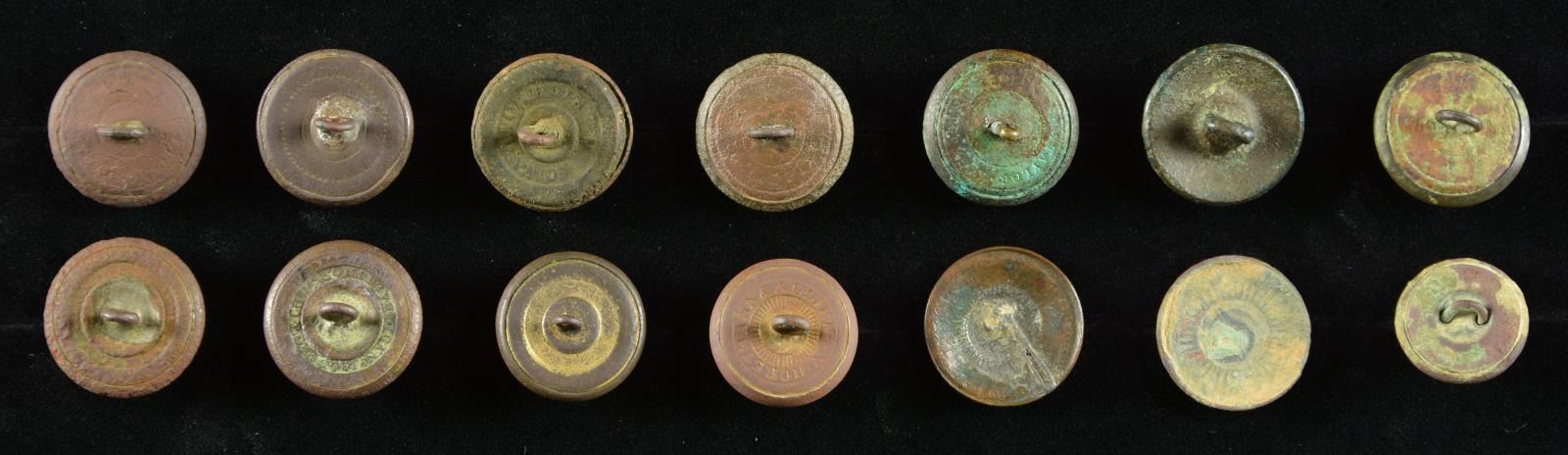 These fine excavated buttons include 1 CS-117-A. / 1 CS-177-A. Dug at Trevilian’s Station, VA. / 1 CS-181-A2. Dug at South Mountain, MD. / 1 CS-175-A2. / 1 CS-172-A1. Dug at Antietam, MD. / 1 CS-184-A. Dug at Petersburg, VA. / 1 CS-25-A1. / 1 CS-127-A1. / 1 CS-173-A. / 2 NC-16-type with no shanks. / 1 VA-13-A2. Dug at Gaines Mill, VA. / 1 VA-15-A. Dug at Mechanicsville, VA. / 1 SC-13-A4. Dug at Willoughby Run near Gettysburg, PA. CONDITION: as indicated, all buttons are excavated and have dark patinas. Many buttons have traces of gold remaining, please refer to photographs. All buttons have shanks, except as noted. (02-18117-1/BF). $2,200-2,700.