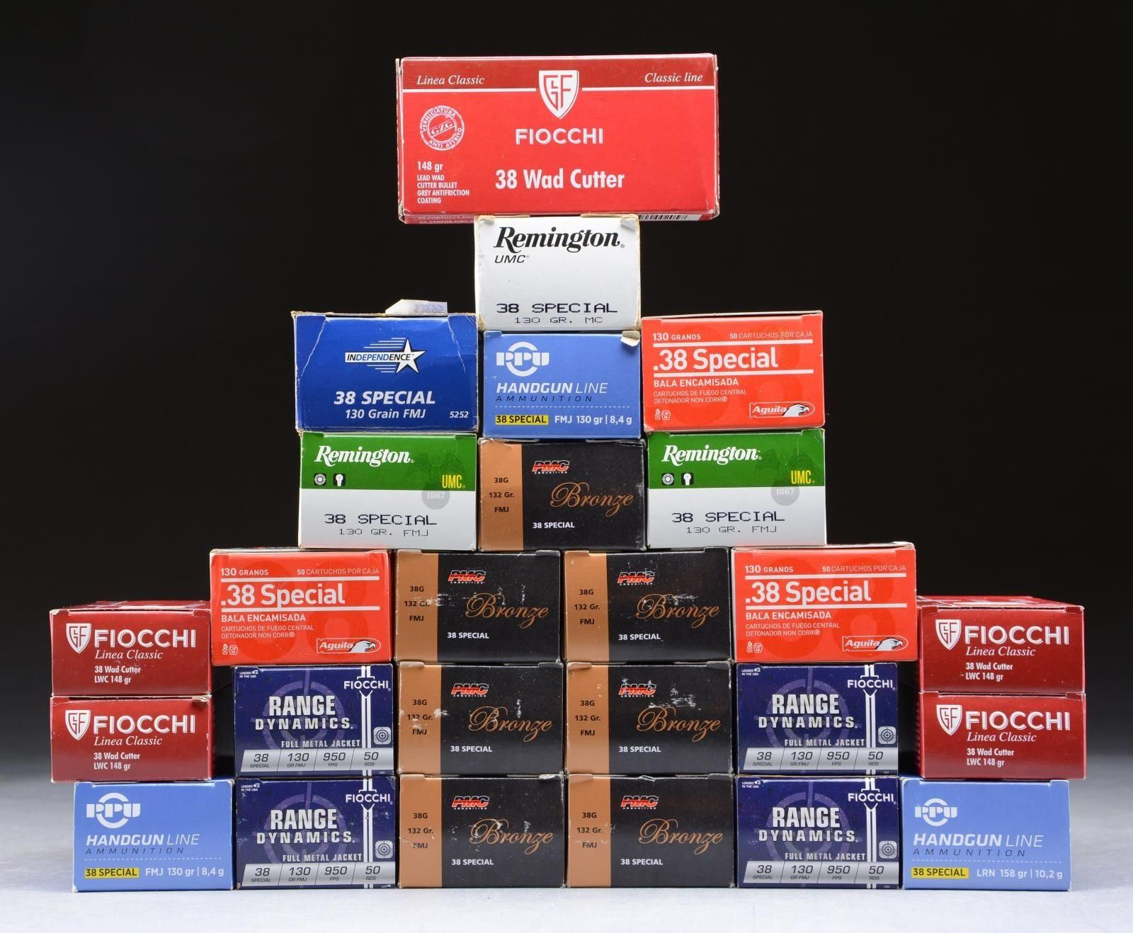 150 RDS. ( 3 BOXES) Rem. 130 gr.: fmj or mc. 150 RDS. (3 BOXES) Aguila 130 gr. FMJ, 250 RDS. (5 BOXES) Fiocchi 148 gr. LWC. 50 RDS. (1 BOX) Independence 130 gr. FMJ. 50 RDS. (1 BOX) PPU 158 gr. LRN. 100 RDS. (2 BOXES) PPU 130 gr. 350 RDS. (7 BOXES) PMC Bronze 132 gr. FMJ. BONCIDIONT: boxes in very good to near excellent condition w/ light wear. Ammo appears serviceable. PROVENANCE: The Collection of Gun Sport Ltd owned by Jon R. Thomas. (02-20377/MD). $300-500. check prices.