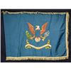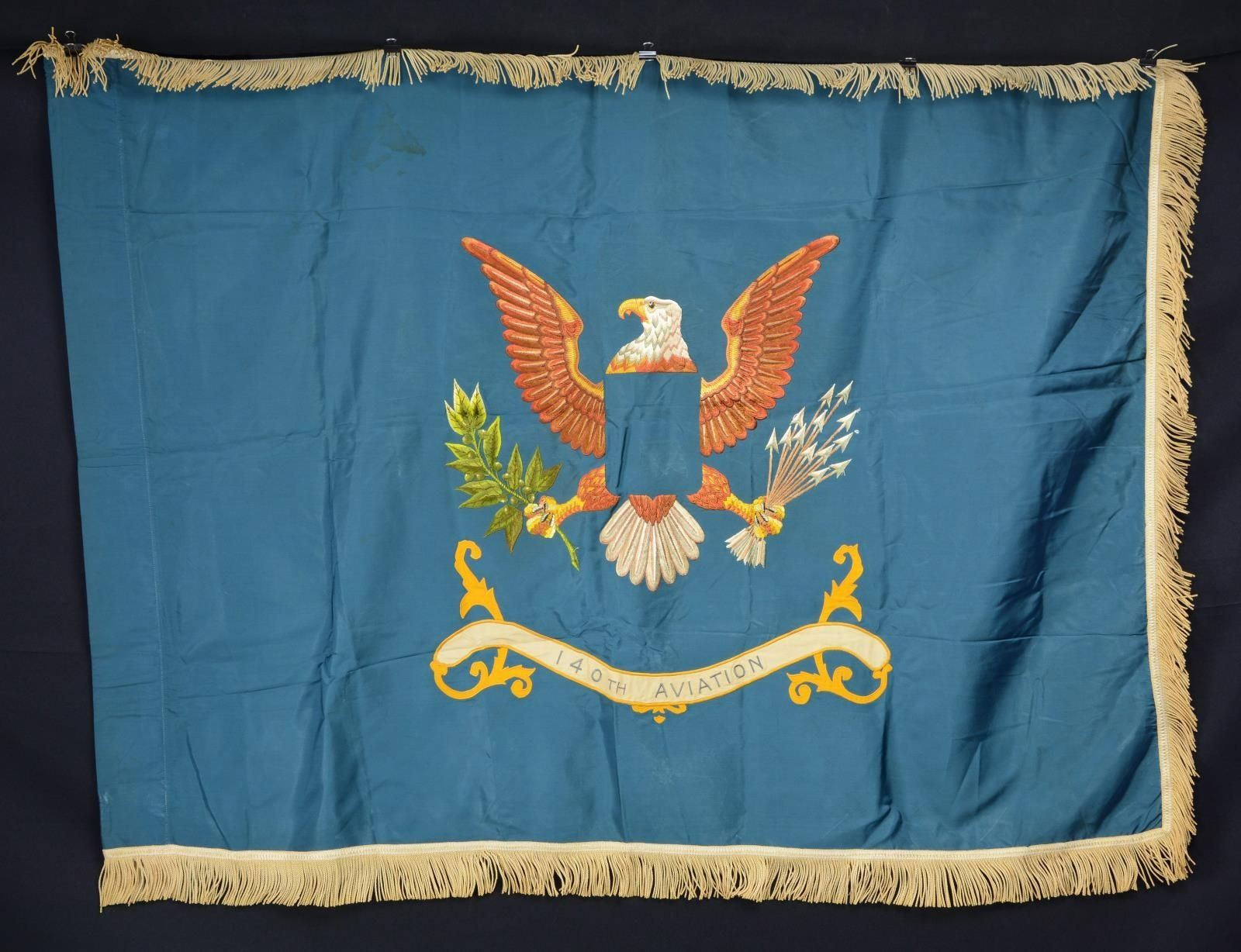 3' x 4' regulation double applique embroidered eagle and no crest field on Army sky blue field, white fringe. Inspection label dated June 1963. This battalion long deactivated is now is 140th aviation regiment with the 40th Division, California National Guard. Its current force structure consists of two battalions, the 1st, of which Company B and C exist (the latter posted at Joint Base Lewis-McCord); 3rd Battalion with three companies. These have detachments serving outside of California including at Buckley Space Force Base in Colorado, Las Vegas and Las Cruces in New Mexico. Elements of the regiment have served in Iraq. They currently fly the UH-72A Lakota helicopter. CONDITION: very good overall. (02-19982-33/JS). $200-300.