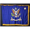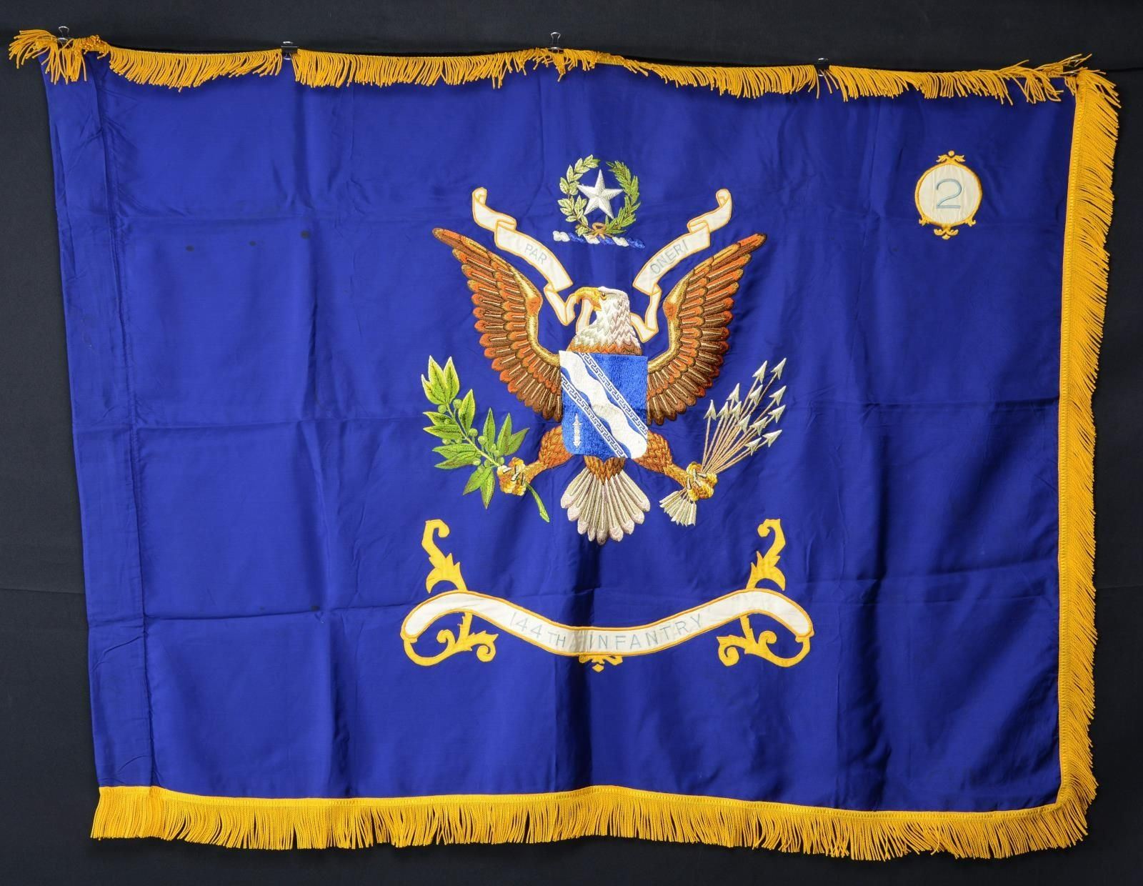 3' x 4' regulation double applique hand and machine embroidered eagle and crest on a blue field, gold fringe. The Latin slogan “PAR ONERI” on the ribbon means “Equal To The Task,” and above the Eagle is the Lone Star of Texas. The Philadelphia quartermaster depot label is undated but is no later than 1962 when the depot no longer contracted flags. The basis of the 144th Infantry formed in April 1880 when six companies of the Texas State Guard merged with the 4th Texas Infantry. Their first call to action came in 1898 when they mustered into Federal service for the Spanish American War. During this time the unit designation was changed to the 2nd Infantry, Texas Volunteers. Never being sent overseas, the regiment regained its 4th Texas name in 1903 when the state military forces reorganized. The regiment was again called to service along the Mexican border in 1916 holding a portion of the Texas side of that line. Once again called into Federal service in March 1917, the 4th Texas was combined with a portion of the 6th Texas Infantry to form the 144th Infantry Regiment. They became part of the 36th Infantry Division and were sent to France in July 1918 forming a reserve for the French. In October the regiment arrived at the front during the Meuse-Argonne Offensive and they began taking casualties in their attack towards the Aisne River. By their time of removal from the battle line they had suffered the second highest casualty rate of any regiment of the division losing over 360 men. The war ending in November 1918, the 144th Regiment was back in Texas where in July 1919 they mustered out of Federal service. In between the wars, the regiment served in the state helping with citizen relief from storms, dealing with two riots and handling a strike. The coming of World War 2 in Europe brought about an expansion of the US Army in 1940 and the 144th was again mobilized at Camp Bowie in November 1940. On December 8, 1941, the unit moved to Fort Lewis in Washington defending that part of the West Coast from possible Japanese attack. In February 1942, the regiment was taken from the 36th Division to serve as an independent command and in April moved to San Francisco. Then, in January 1943, the regiment was sent to Florida to patrol the coast line before being sent to Mississippi in March 1944. During their time there the regiment provided training to new men as well as those who transferred to the infantry from other Army service branches. Trained men form this unit then went on to serve with a number of other Army divisions especially important as the casualties grew larger from November 1944 onward in the infantry ranks. In early January 1945, the regiment was back in Texas before moving to Alabama in April. They were deactivated in September. The 144th was reactivated starting in April 19467 when the Army created the 49th Armored Division and in 1959 the regiment was redesignated as the 144th Mechanized Infantry. With the Berlin Crisis taking place in 1961, the regiment was sent to Louisiana staying there until May 1962 before heading back to Texas. They then returned to state service. Between 1968 and 1973, the regiment was deactivated but remained a part of the Texas National Guard. The 144th began serving in the War on Terror in 2006 as part of the 56th Infantry Brigade Combat Team. The 3rd Battalion's B Company was sent to Iraq returning home in 2007 after serving in action there. The 3rd Battalion then mobilized as Task Force Panther fighting in Operation Iraqi Freedom before heading to Afghanistan in 2012 operating as Task Force Bowie. In October 2017, the 3rd Battalion was sent to Africa where they served until July 2018. Currently only the 3rd Battalion remains of the regiment and is back serving with the 36th Division as part of the 56th Brigade Combat Team. CONDITION: very good overall, minor stains. (02-19982-17/JS). $200-400.