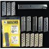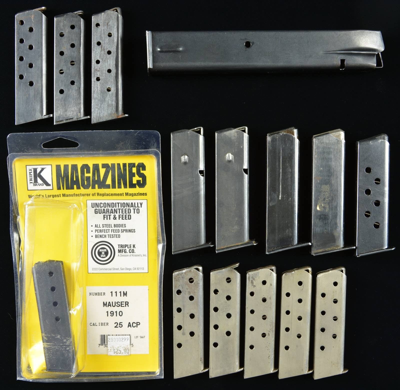 Very good to new blued (unless noted) originals & aftermarkets as noted. 2 unmarked Mauser aftermarket 32 ACP style w/ push button rectangular bases & 3 slots on left sides. / 1 unmarked Mauser aftermarket 32 ACP style w/ push button rnd. front base & 6 holes on each side. / 1 new Triple K 25 ACP for 1910 Mauser; new in package. / 3 unmarked like Triple K 25 ACP appearing for 1910 Mauser w/ 8 holes per side. 1 has smaller holes & appears original. 1 w/ larger holes has slot at top of spine. / 5 plated 25 ACP like Mauser 1910 w/ 8 holes plus followers dished on top having rounded noses (1 flat). / 1 aftermarket 25 rd. for Browning Hi-Power. / 2 original J. P. Sauer 38H. (02-16951-10). $300-450.