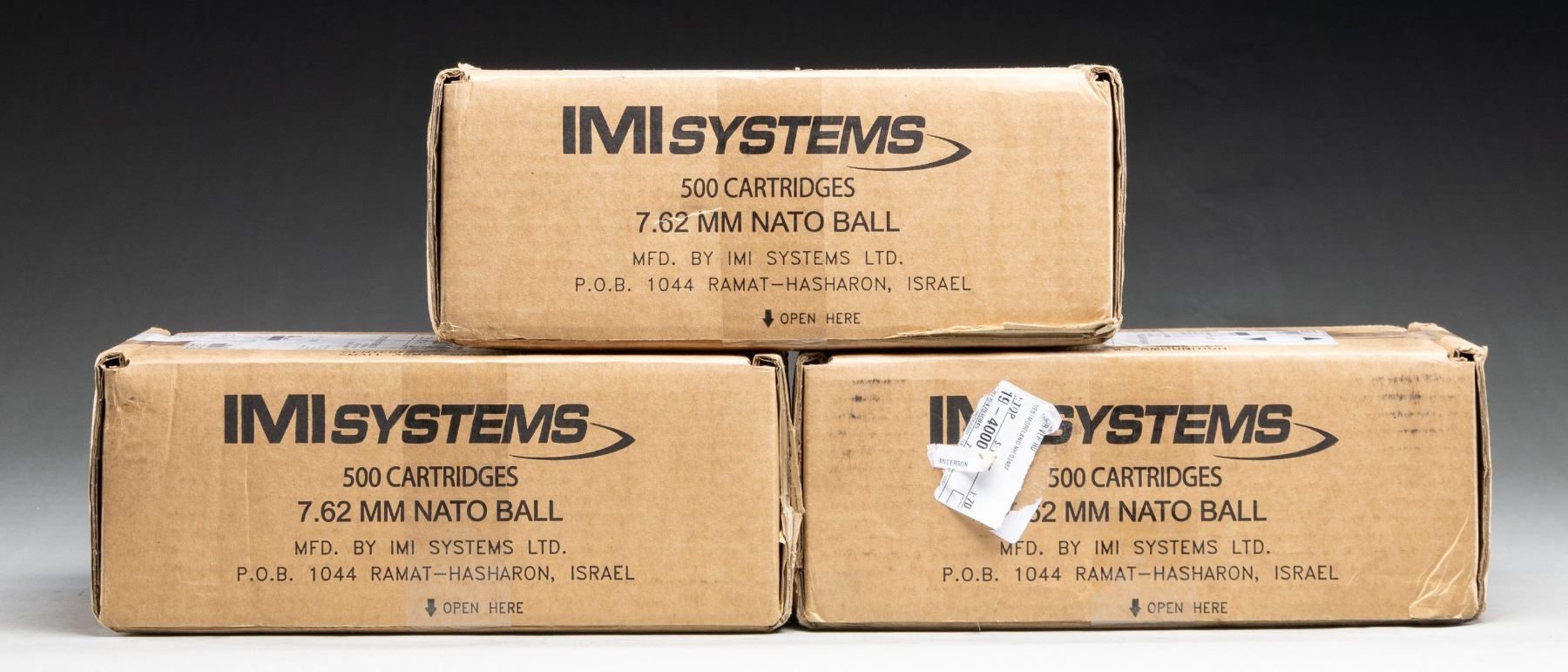 Three 500 rd. boxes of IMI made 7.62 NATO FMJ ammo. Total of 1500 rds. CONDITION: ammo is sealed in shipping boxes. (02-25177-3/MJC). AMMO. $700-1,000.