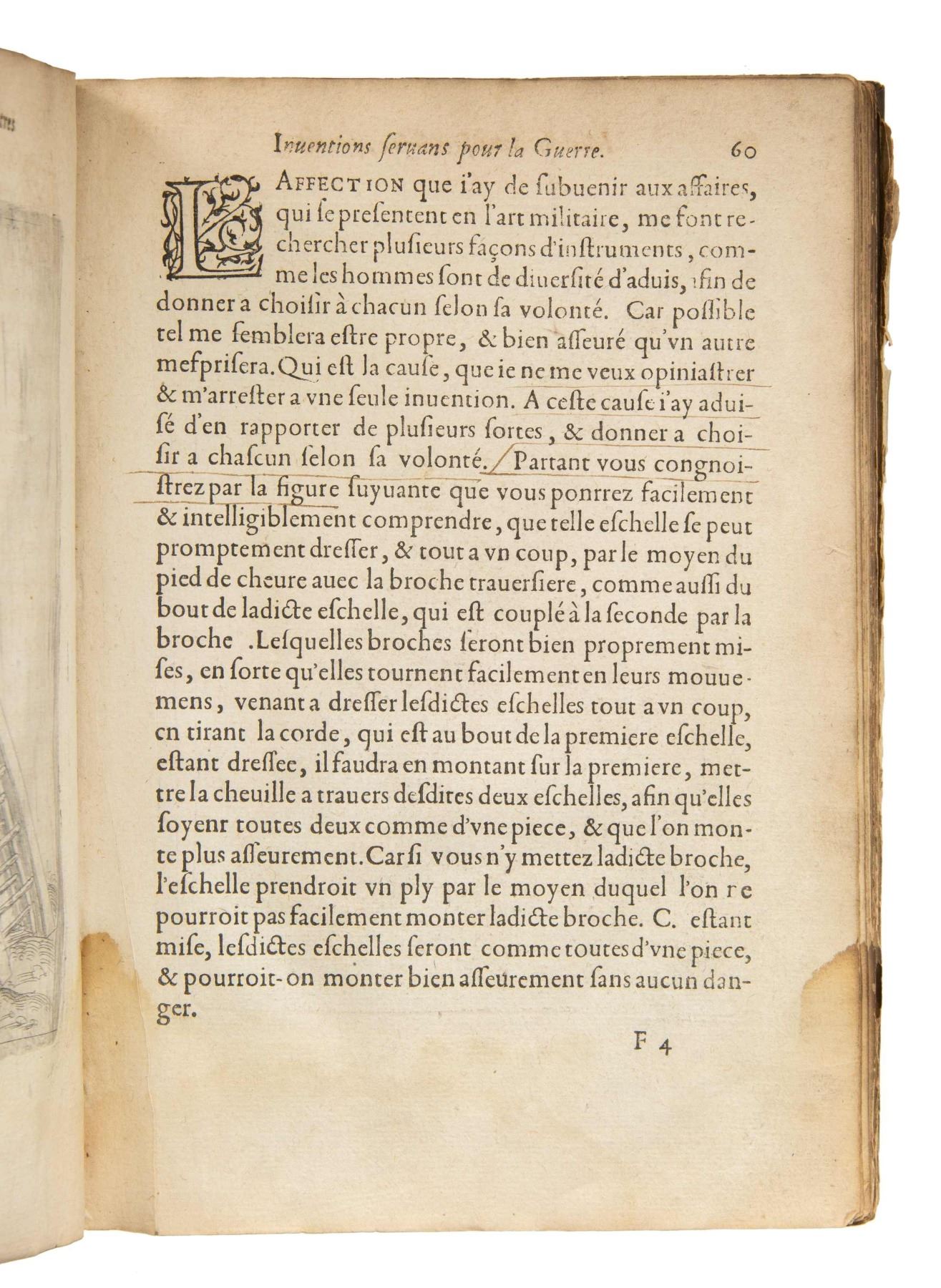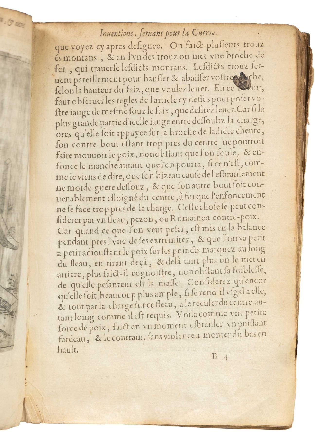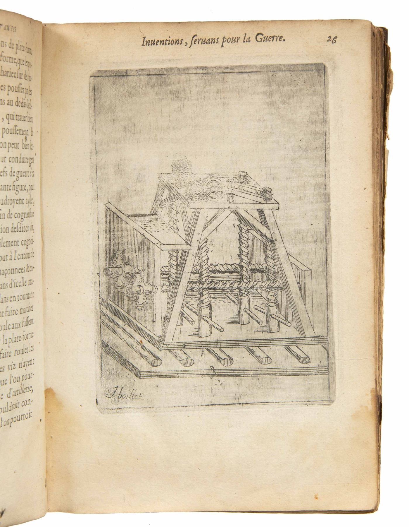 DE GUER BY JOSEPH BOILLOT. This first edition 1598 French artillery manual was written by one of the most learned men of his time, Joseph Boillot. The book appears to have its original animal skin covers with the title page intact. Remarkably, it appears that all 90 intriguing engravings original to the book are intact. The book details the use of gunpowder and artillery in warfare. Boillot was an engineer in the army of Henry IV famous for the Edict of Nantes. CONDITION: despite its great age the volume is quite stable and easily read, if you speak French. The engravings are clear and quite interesting. The covers are solid and have protected the pages well for 427 years. (02-25208/BF). $500-1000.