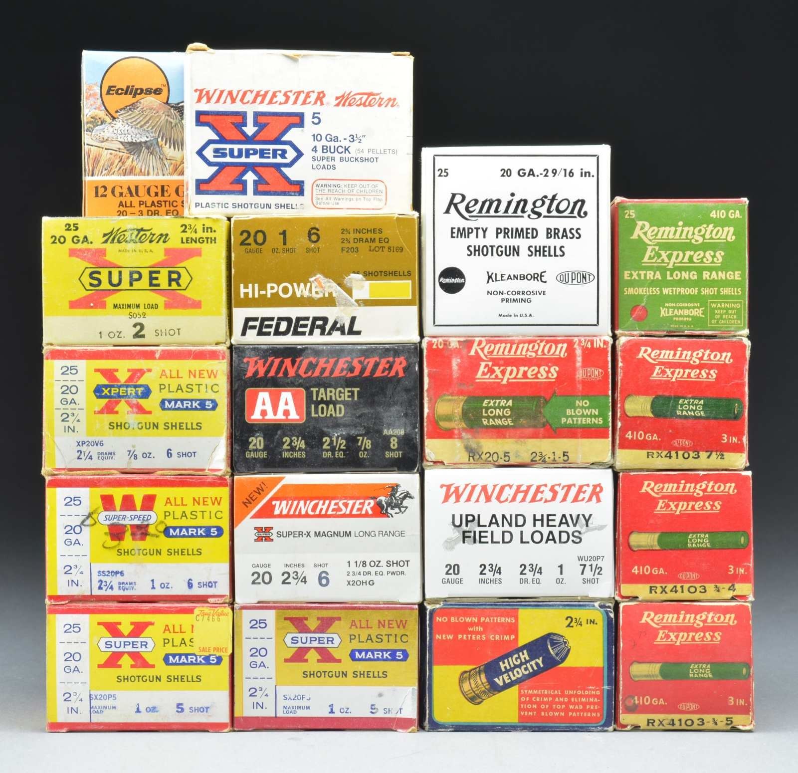 13 BOXES (275 RDS) OF 20 GAUGE: 10 full boxes of various different makers & loads, primarily plastic shell. / 2 Partial boxes of mixed shells. / 2 Full boxes of Remington empty primed brass, near excellent.