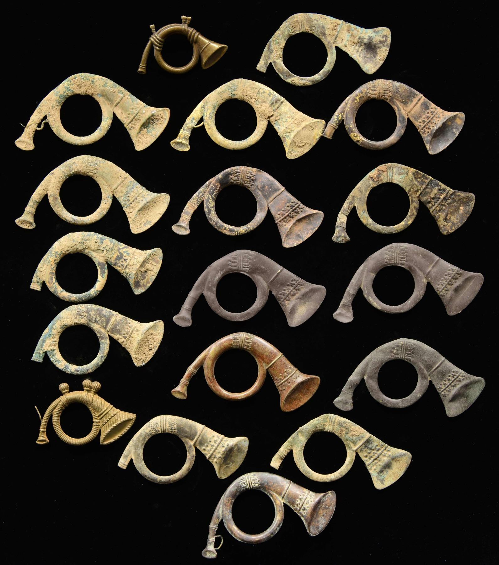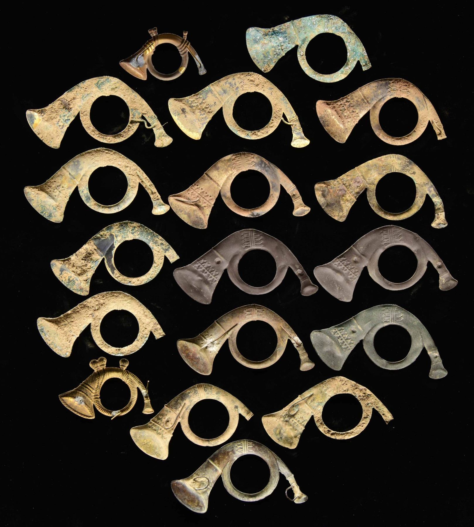 HAT INSIGNIA & MORE. This lot consists of 16 excavated Civil War era enlisted infantry hat bugles, as worn on kepis, as well as Hardee hats. / 1 Non-excavated officer’s false embroidered infantry hat bugle of the Civil War period. / 1 US M1872 enlisted infantry hat bugle. CONDITION: excavated hat bugles show varying degrees of wear, corrosion, and losses. Please see photos for an accurate representation of condition. Non-excavated horns show light wear. (02-22828-1/BF). $700-1,000.
