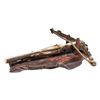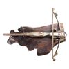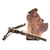 WITH STAND. Overall: 29.75". Steel prods measures 25.25" wide with 1/4" woven cloth string, 4 green & blue cloth dampers. Walnut stock held to bow by rope with a provision for iron loop at front. Stock has large finely carved bone inlay on top with additional bone inlays at tip, sides & butt. Motifs on top include 2 interlocking dragons & "Man-in-the-Moon". Steel lever acts as trigger for bone latch. 2 Steel studs on sides of stock for drawing string. Also included is 28.75" long walnut stand. CONDITION: the crossbow & stand appear good, intact overall with patina on steel parts along with side inlays separating from stock. PROVENANCE: Estate Collection of Nicholas Apergis. (02-24797/MD). $3,000-5,000.