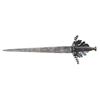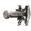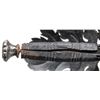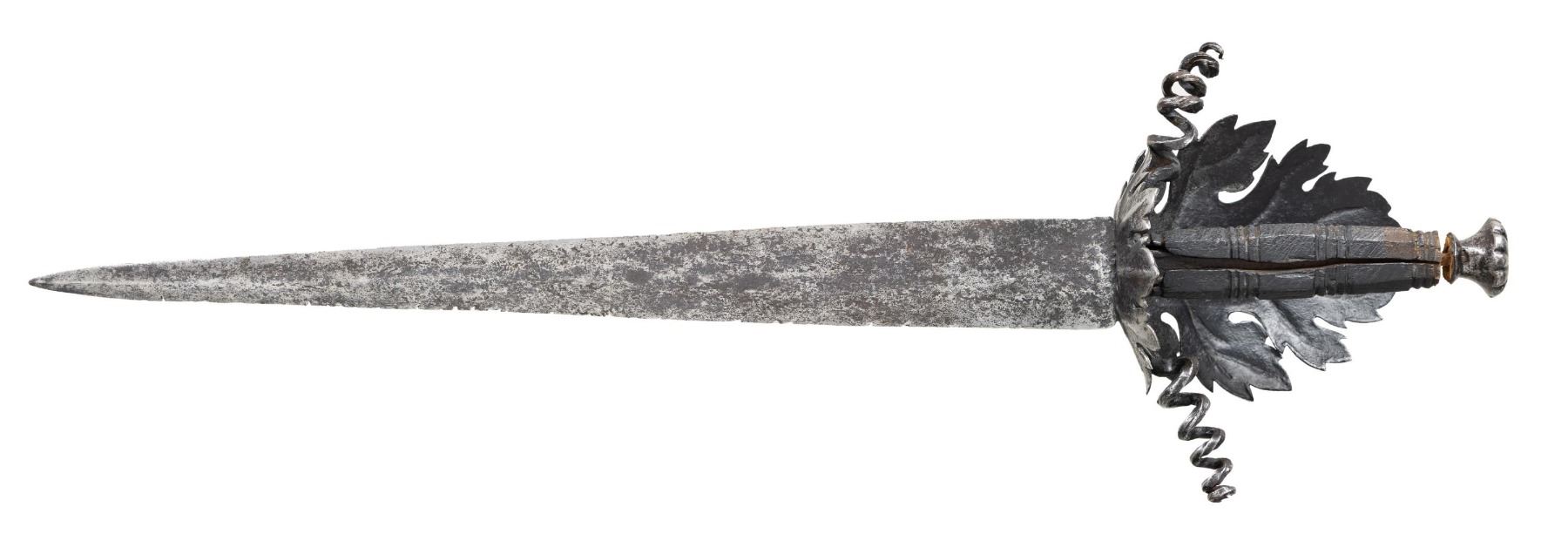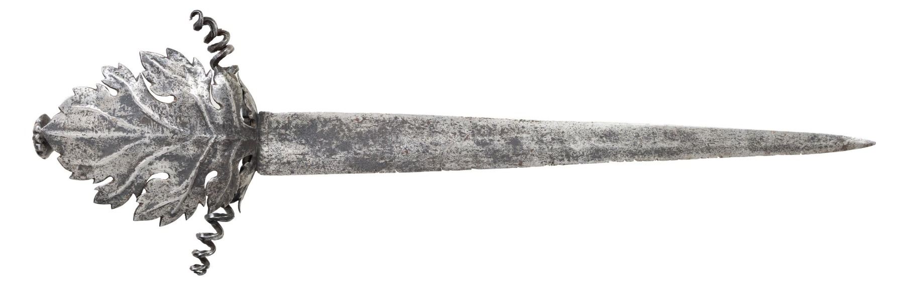 SWORD WITH LEAF GUARD. An interesting early weapon that is likely a parrying dagger or main gauche, but could be considered a short sword. It measures 22 1/4" overall with a plain 16 1/8" blade. The guard is made up of two tapering spiral appendages on each side and a huge, well designed and formed, 6 3/8" oak leaf guard. Inverted bell pommel with the original carved wooden grip. The main gauche was generally carried in the left hand during a sword fight for added lethality and was occasionally referred to as a "left hand dagger". CONDITION: blade has a dark lightly cleaned patina with universal cleaned pitting. The iron hild also has a dark lightly cleaned patina. The grip has a large age crack and has minor losses. PROVENANCE: Estate Collection of Nicholas Apergis. (02-24763/BF), $1500-2250. PROVENANCE: Estate Collection of Nicholas Apergis