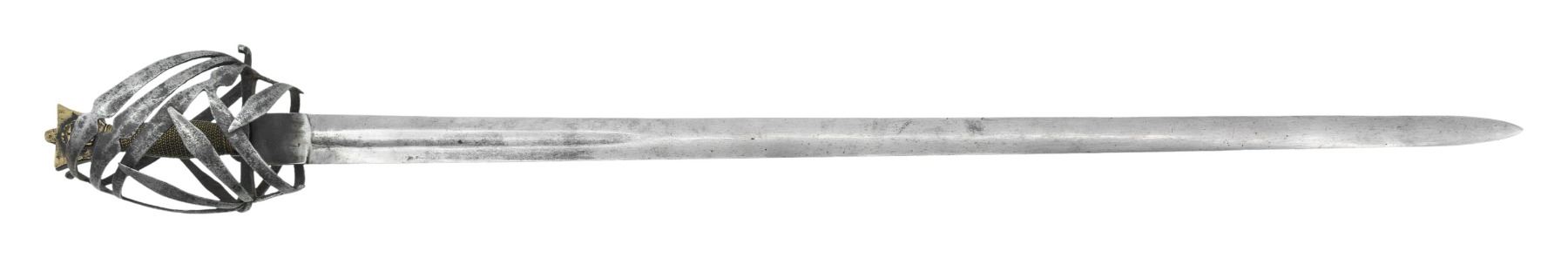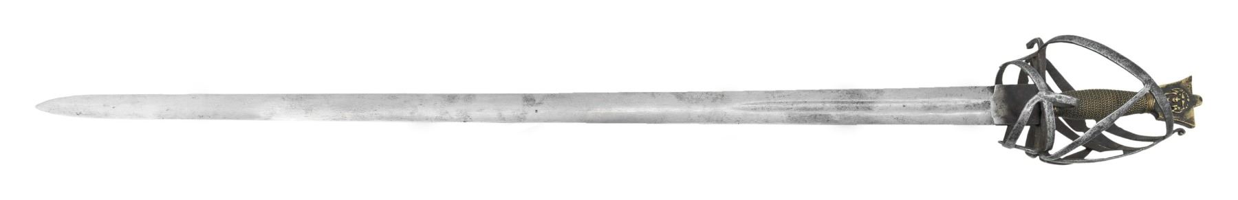 An example of a early 16th to 17th century Venetian schiavona measuring 41 1/2" overall with a plain 35" double edged blade featuring a central 9" fuller. Classic schiavona hilt with multiple branches and a thumb loop. Brass flattened tulip shaped pommel with a grotesque face on either side. Brass simulated wire wrapped grip. CONDITION: blade shows light wear and may be a replacement. Hilt has a great patina with minor pitting. Brass pommel and grip show wear but could be early replacements. PROVENANCE: Estate Collection of Nicholas Apergis. (02-24779/BF). NON-GUN. $1,000-2,000.
