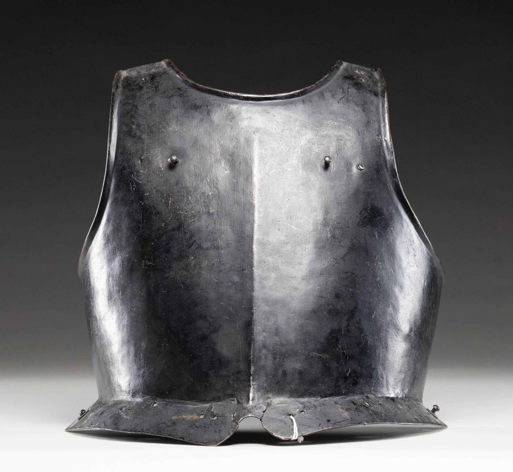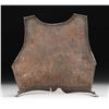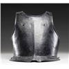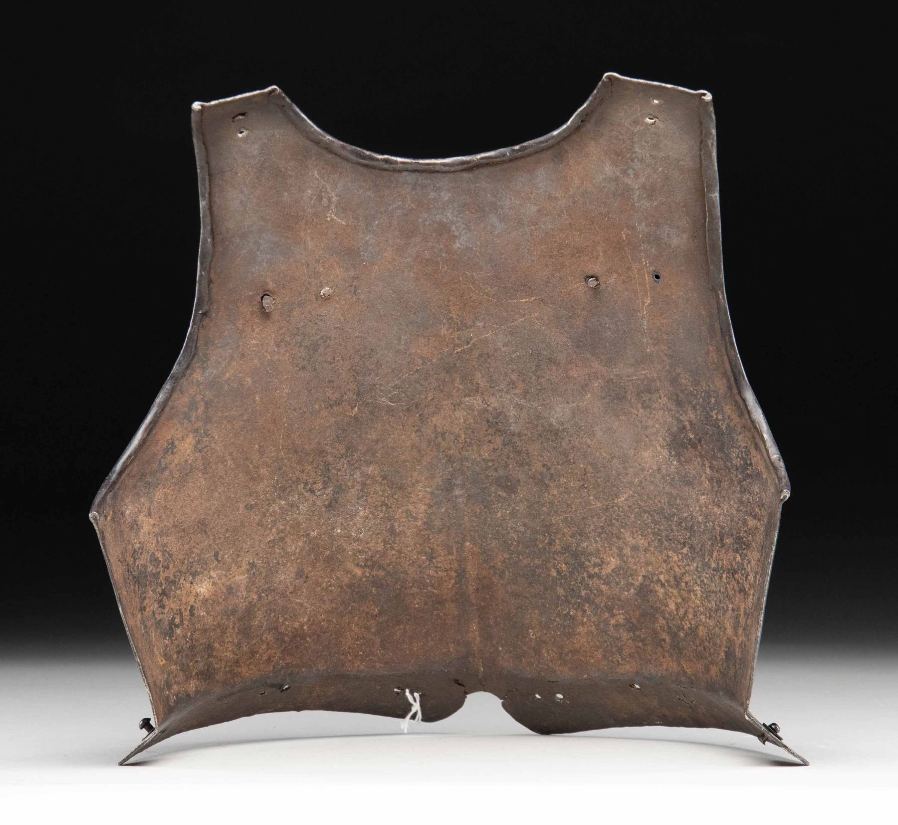 This breastplate dates from the mid 16th Century and was likely worn by a pikeman. It measures approx 14 1/2" tall with a width of about 14". The breastplate shows a raised edge around the neck and arms. It has a raised medial ridge and a slight 1 1/2" flare at the bottom. The plate appears to be one piece and has two holes at each shoulder, one hole and a rivet on each side of the chest and several holes with two rivets around the skirt. CONDITION: there appears to be some period repairs at the lower front of the skirt. The entire piece has a darkened patina with an oxidized finish on all interior surfaces. PROVENANCE: Estate Collection of Nicholas Apergis. (02-24731/BF). NON-GUN. $1,200-2,000.