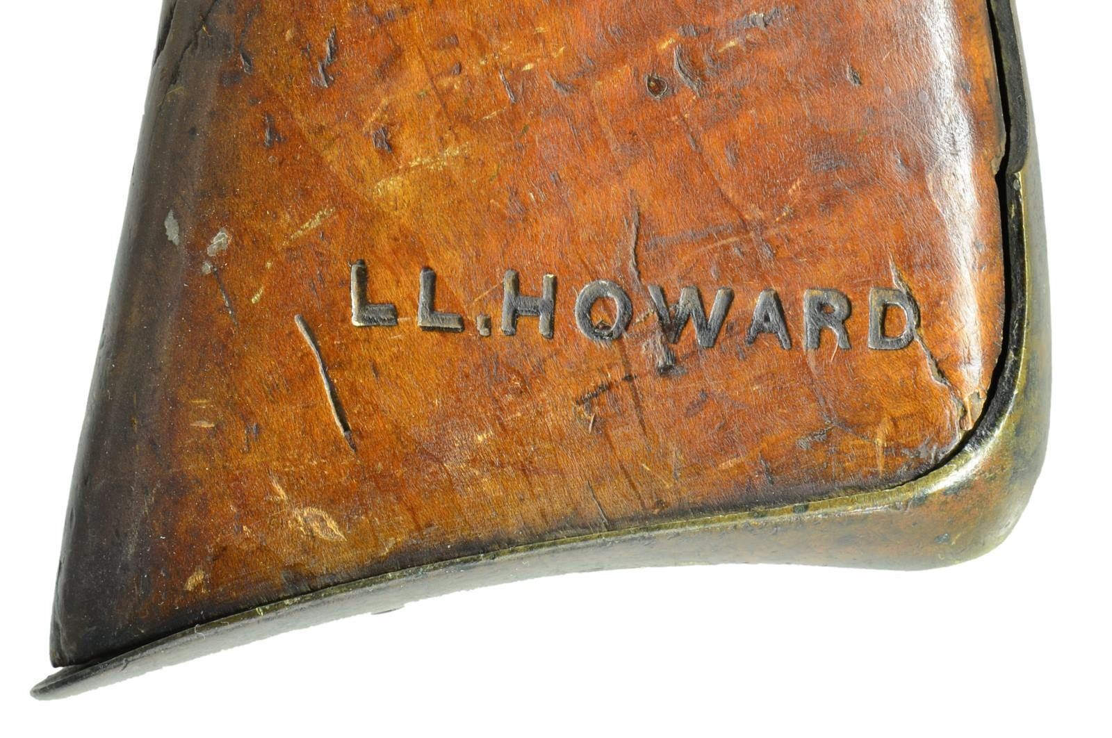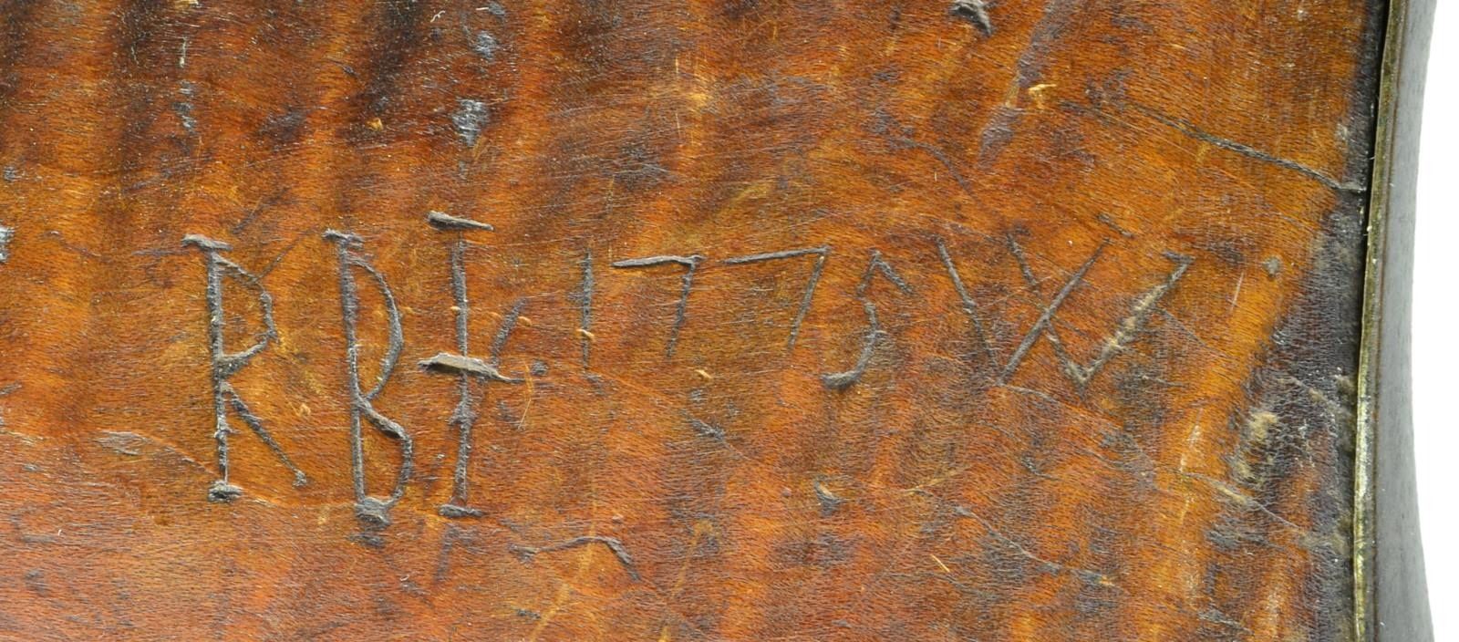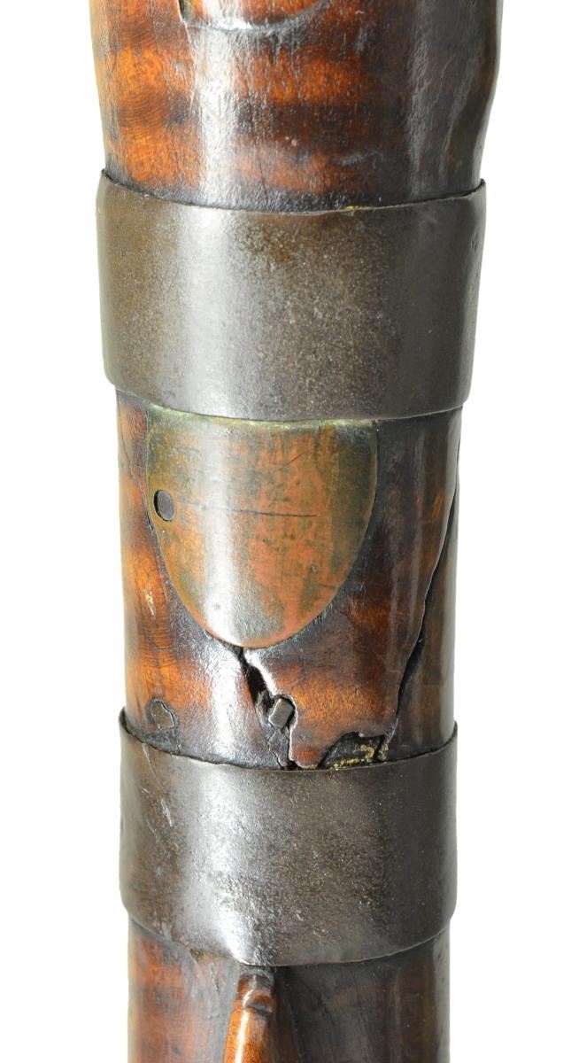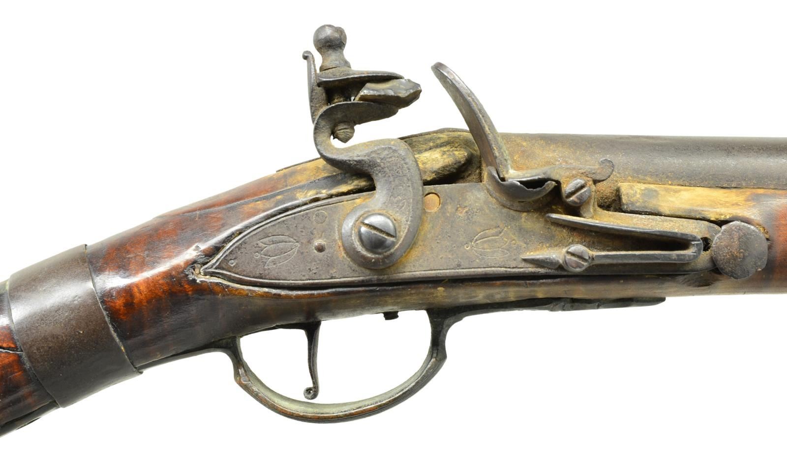 STOCK. Cal. 62. NSN. Bbl. 54". This amazing survivor has wonderful hand worn patina & initials & date carved in stock "RBI 1775 W". Brass mounted fowler w/ early oval wrist was broken & repaired w/ 2 braised iron bands: all w/ matching patina to rest of gun. Sock is cut back at muzzle for bayonet lug on bottom of bbl. There is a branded name in buttstock which consignor believes was soldier who served in the Connecticut line. This gun is thoughts to have characteristics of Connecticut maker Medad Hills from a well known family of Connecticut gun makers of the revolutionary war & earlier era. CONDITION: very good "as found". The Ketland tulip lock & bbl. have mostly smooth iron patina w/ pitting at breech. The iron band repair is so well done as is an iron headed nail or screw forward of lock taking place of long lost 2nd lock screw. Stock, other than the contemporary repair, is sound w/ hand worn patina w/ sm. well patinated reductions in crack toward muzzle. About 1" piece is missing on right side of forestock. Even the wooden ramrod appears original & very good. Lock spring good, but wont fall past half cock. Smooth, clear bore. PROVENANCE: From the Collection of James B. Taylor. (01-20503/JS). ANTIQUE. $6,000-10,000.