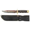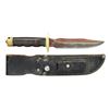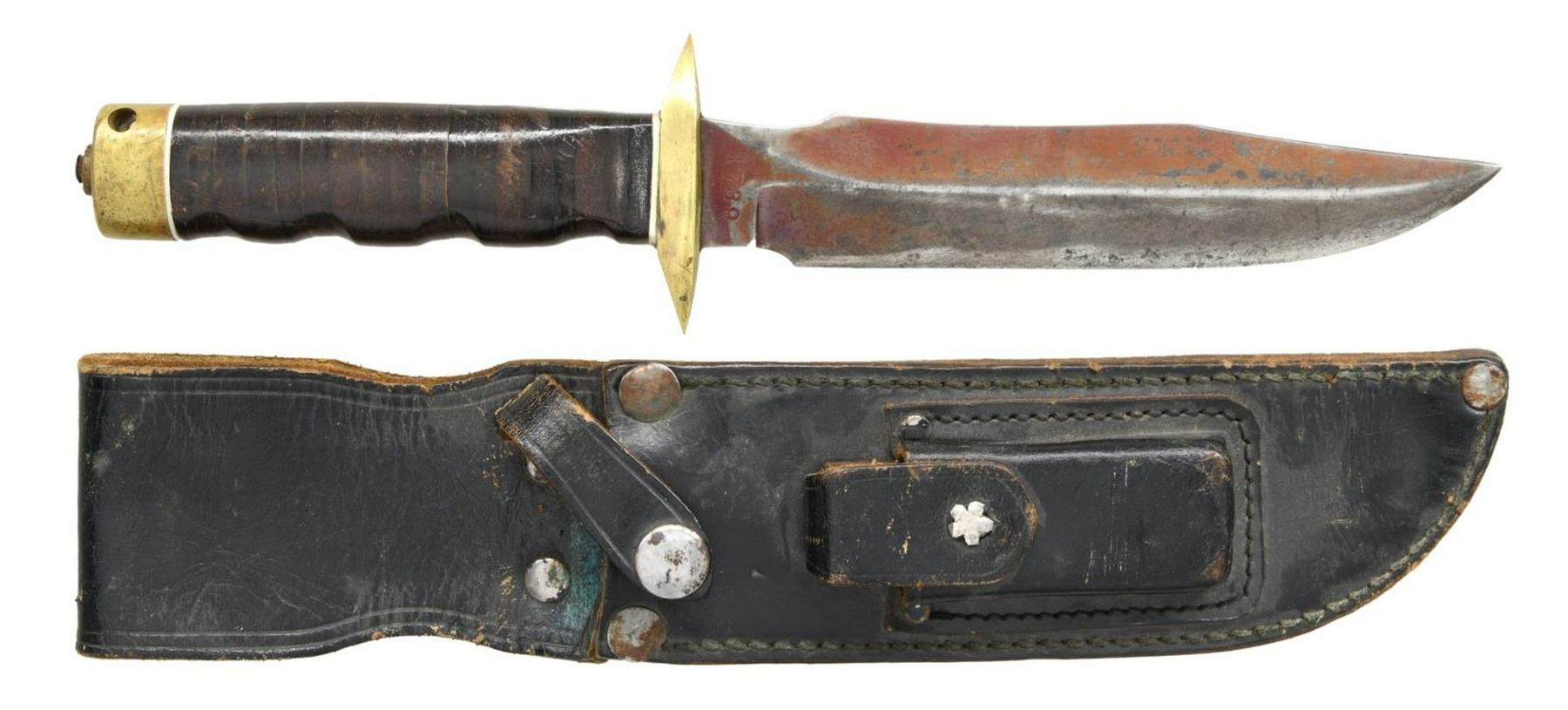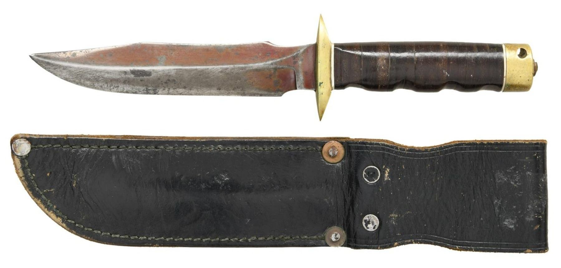 Per consignor, Vietnam War era with 6" clip point blade having a dark maroon finish. Overall: 10 3/4". Brass dbl. hilt & pommel w/ wing nut for attachment to tang & thong ferrule. 18" Leather washer handle w/ finger grooves. Black leather sheath w/ pouch having sharpening stone. CONDITION: blade has plum tone w/ patina, areas of wear & sharpening on edge. Brass has mellow patina. Handle has light handling marks. Fair sheath shows cracking of leather, spots of verdigris & oxidation on rivets. PROVENANCE: from the Lifelong Collection of Glen E. Mattox. (02-18666/MD). $300-500.