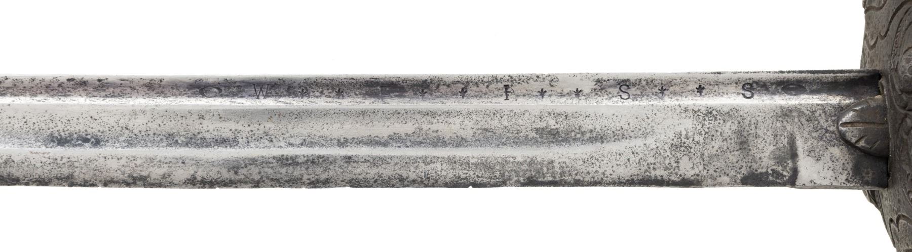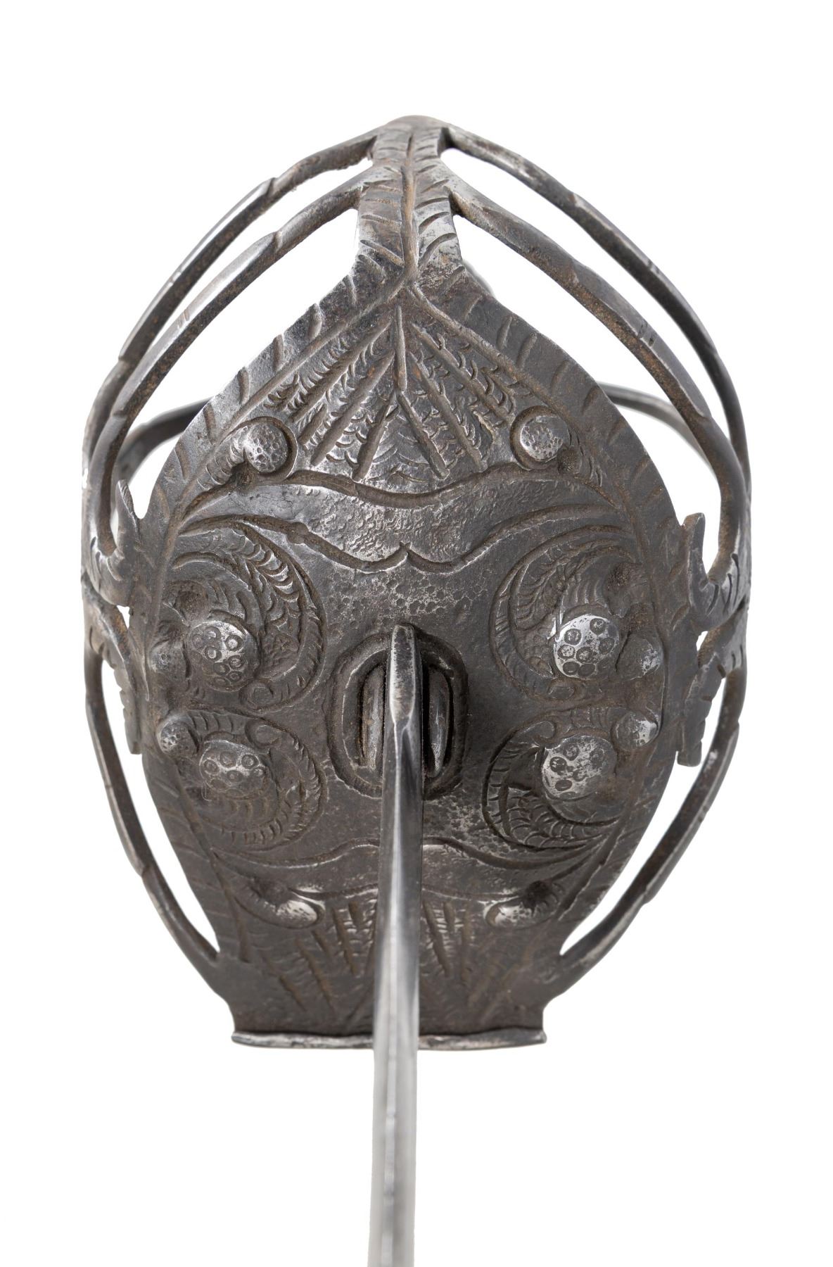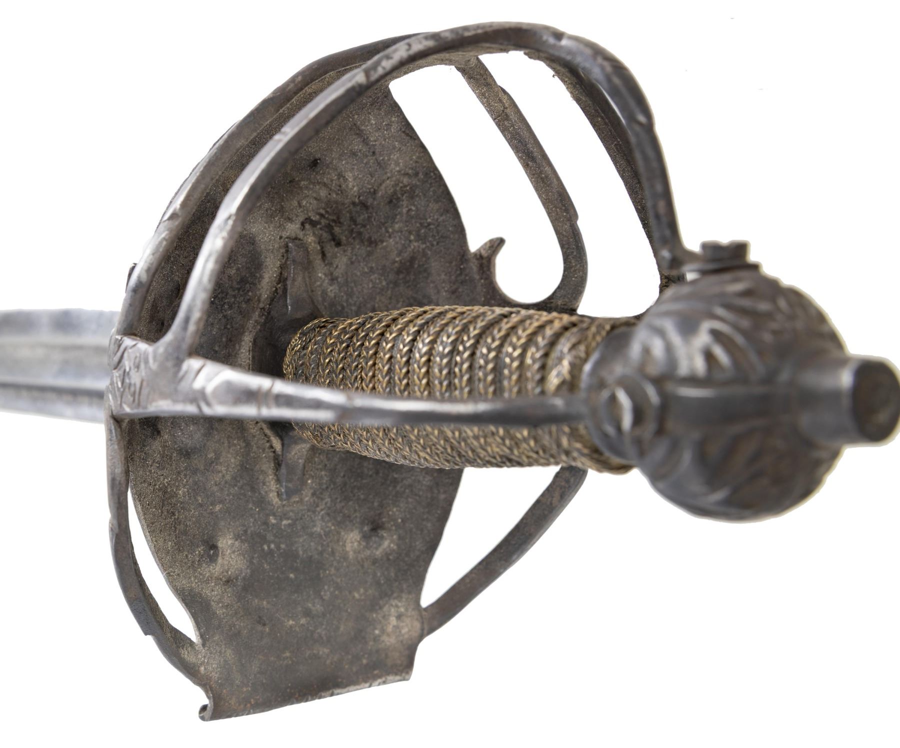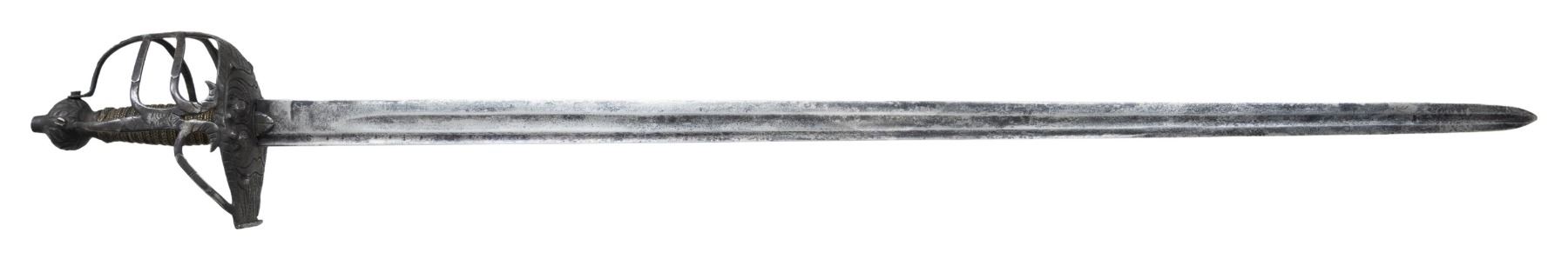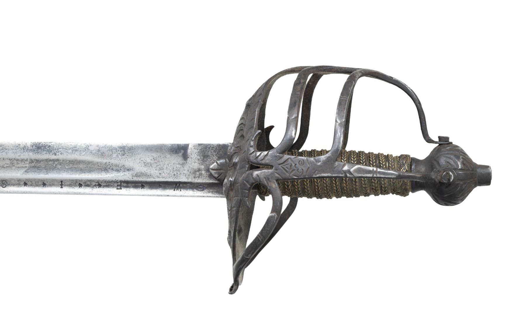 A great example of a 17th century English horseman's backsword often termed a mortuary hilt that was quite popular during the English Civil War. This example measures 41 3/4" overall with a double fullered blade of 35". The top fuller is stamped " W * * E * * I * * S * * S " ON BOTH SIDES. The stunning iron hilt has serpent like and foliate designs on the underside of the guard. There are two branches at the front of the guard and four branches to the rear. The entire hilt is covered in simple foliate motifs and two faces believed to be Charles I of England.. The globular pommel is decorated with designs to compliment the rest of the hilt. Wire wrapped gip with Turk's head knots above and below. No scabbard. CONDITION: blade has a pleasing medium gray patina with only moderate wear. The hilt is solid with no notable faults. Grip may be a very early rewrap. PROVENANCE: Estate Collection of Nicholas Apergis. (02-24734/BF). $1800-2800.