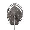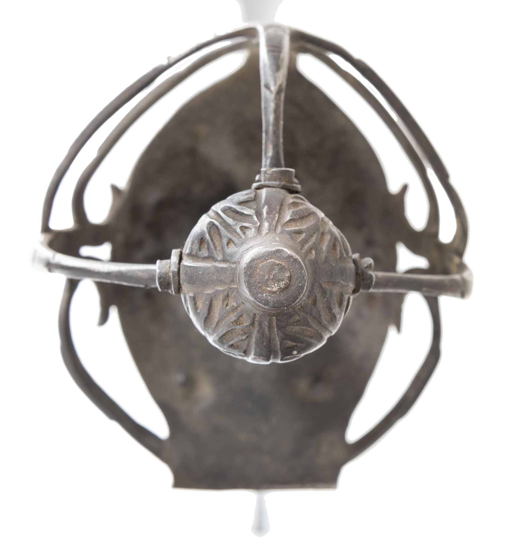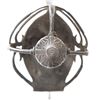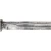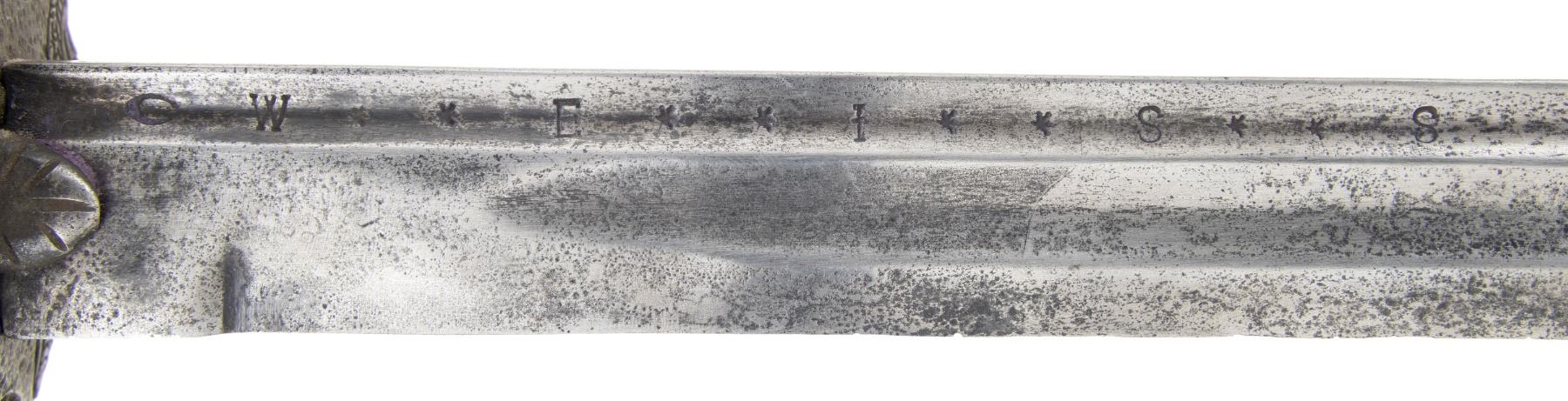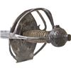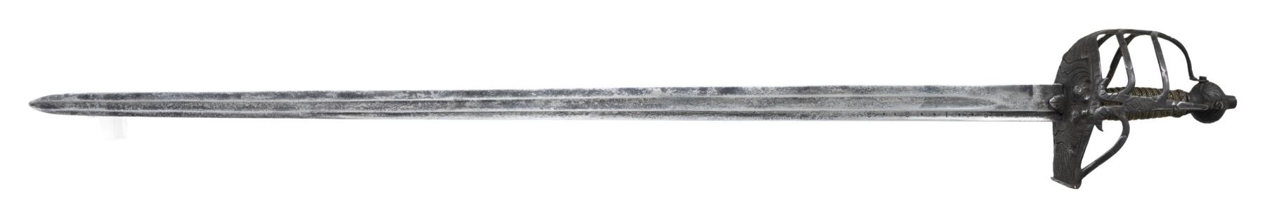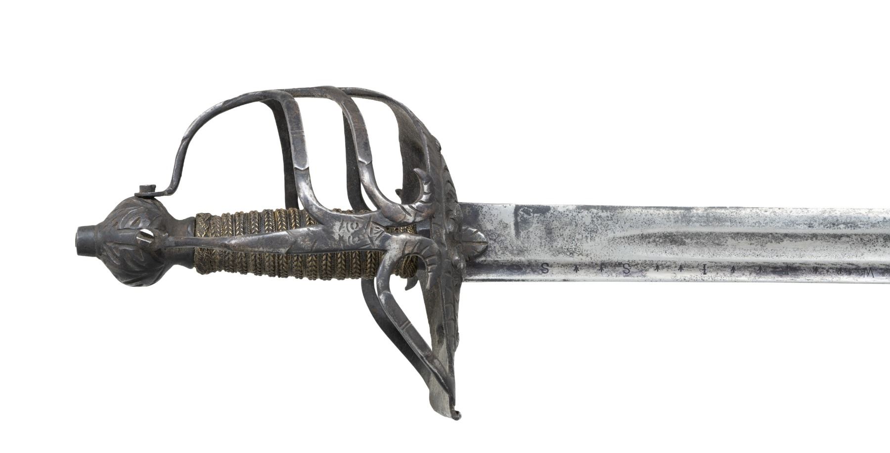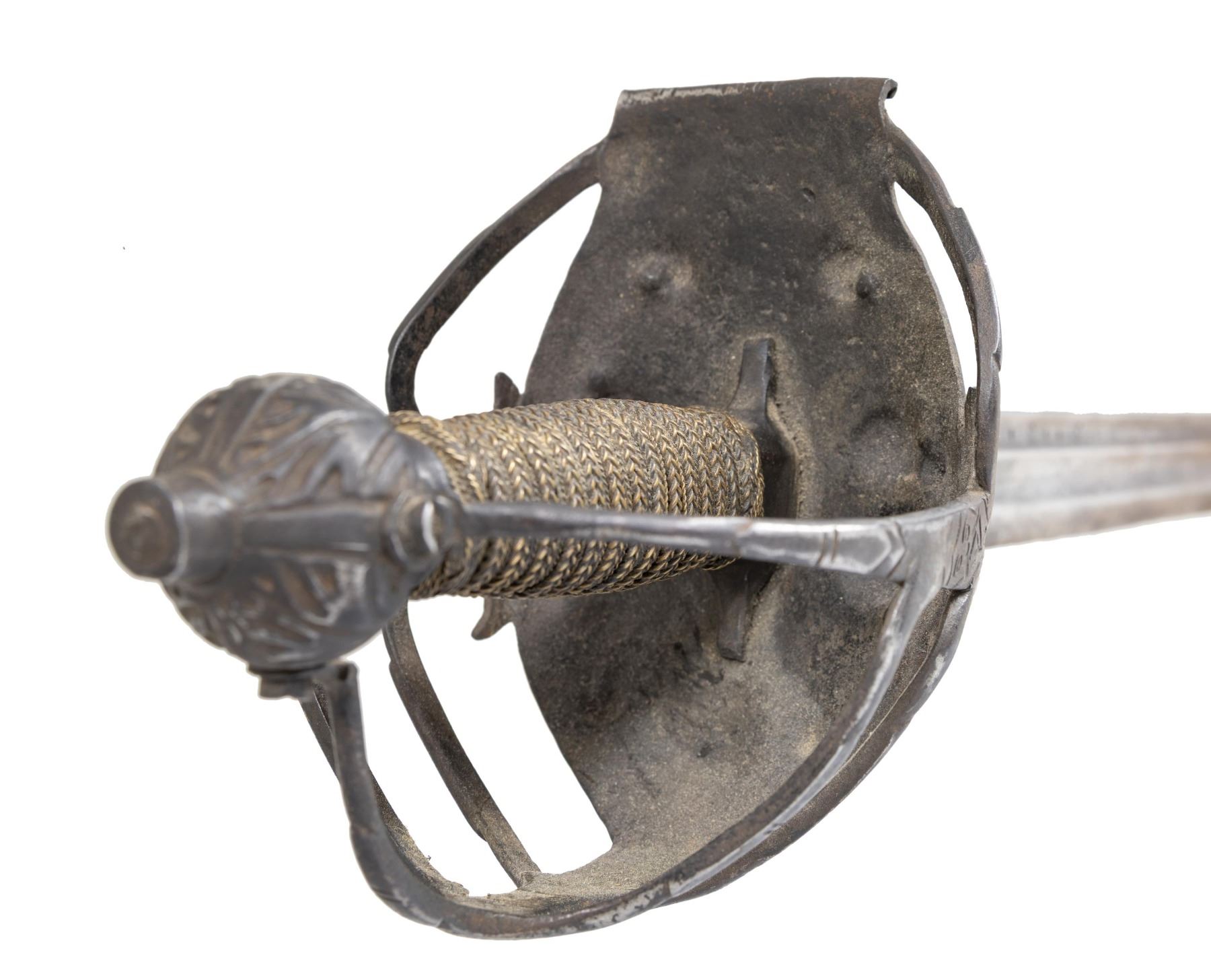 A great example of a 17th century English horseman's backsword often termed a mortuary hilt that was quite popular during the English Civil War. This example measures 41 3/4" overall with a double fullered blade of 35". The top fuller is stamped " W * * E * * I * * S * * S " ON BOTH SIDES. The stunning iron hilt has serpent like and foliate designs on the underside of the guard. There are two branches at the front of the guard and four branches to the rear. The entire hilt is covered in simple foliate motifs and two faces believed to be Charles I of England.. The globular pommel is decorated with designs to compliment the rest of the hilt. Wire wrapped gip with Turk's head knots above and below. No scabbard. CONDITION: blade has a pleasing medium gray patina with only moderate wear. The hilt is solid with no notable faults. Grip may be a very early rewrap. PROVENANCE: Estate Collection of Nicholas Apergis. (02-24734/BF). $1800-2800.