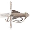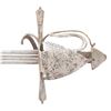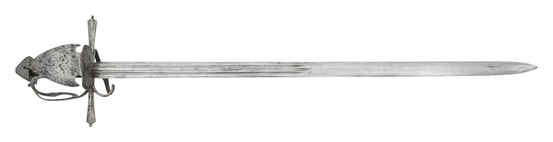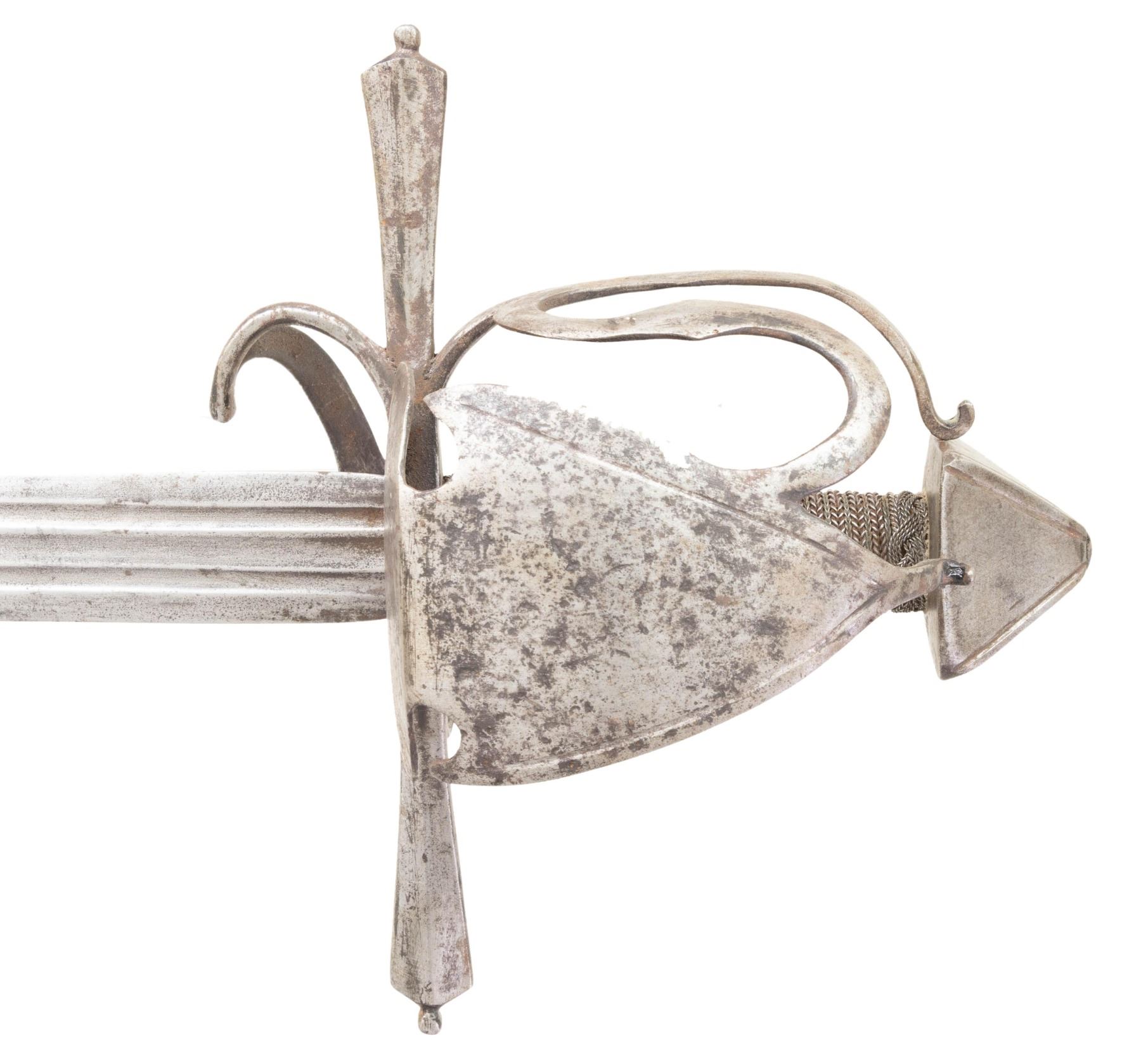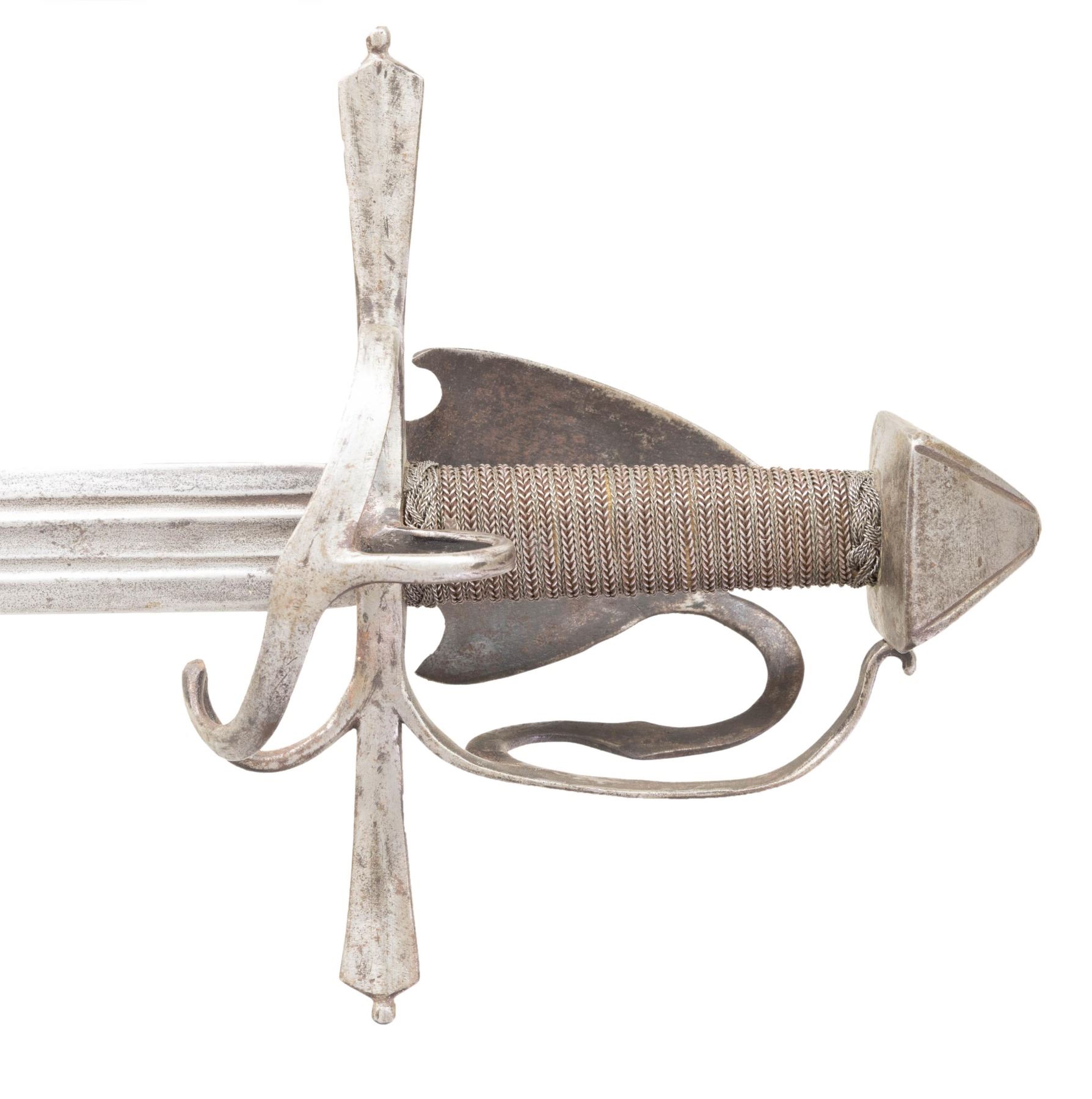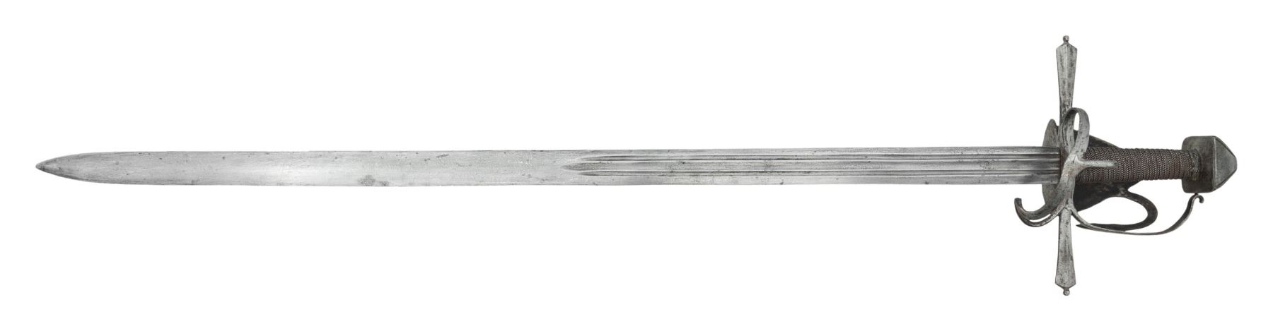 An example of a early 17th century broadsword similar to a dussage or a tessek measuring 39" overall with a plain 33 1/4" double edged straight blade featuring a central 16" fuller flanked by smaller 15" fullers. The hilt is of dussage/tessek style with a large pyramidal pommel. Wire wrapped grip with Turk's head knots at the top and bottom. CONDITION: blade shows light wear with a few edge nicks and may be a post production replacement. Hilt has a gray cleaned patina with minor pitting. Grip is intact with light wear and may be a replacement. PROVENANCE: Estate Collection of Nicholas Apergis. (02-24670/BF). NON-GUN. $1,000-2,000.