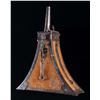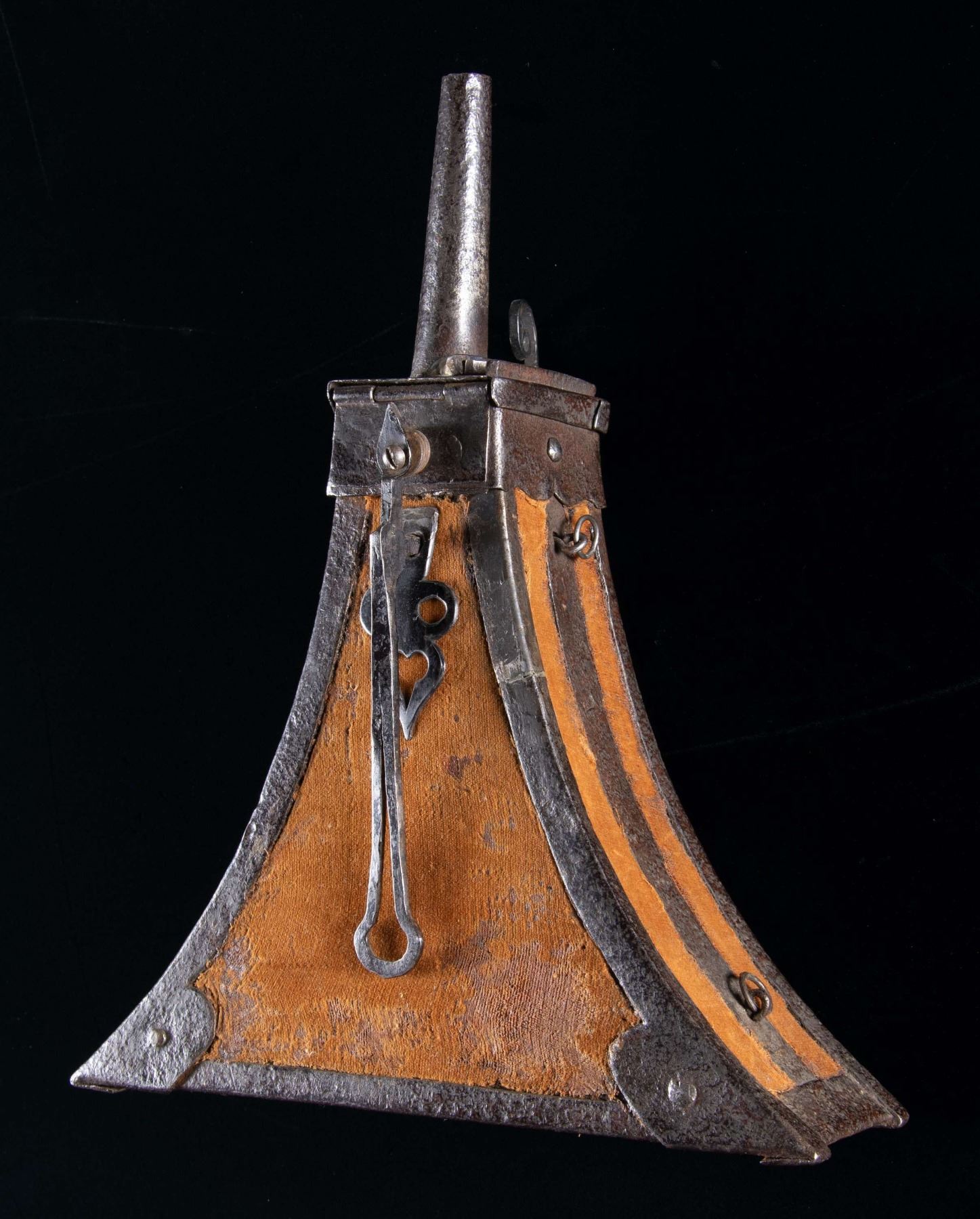 HORN. 10.5x8x2.5" iron bound cloth covered wood frame. CONDITION: good, powder release flange is restored, heavy iron patina. (02-25344/JS). NON-GUN. $500-800.