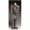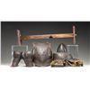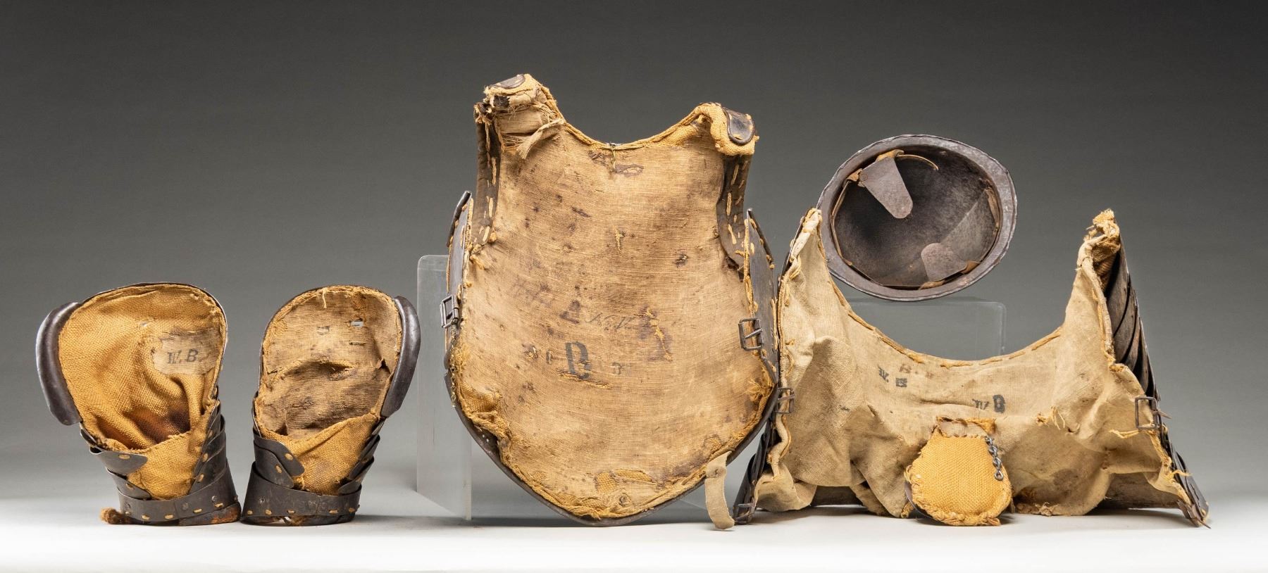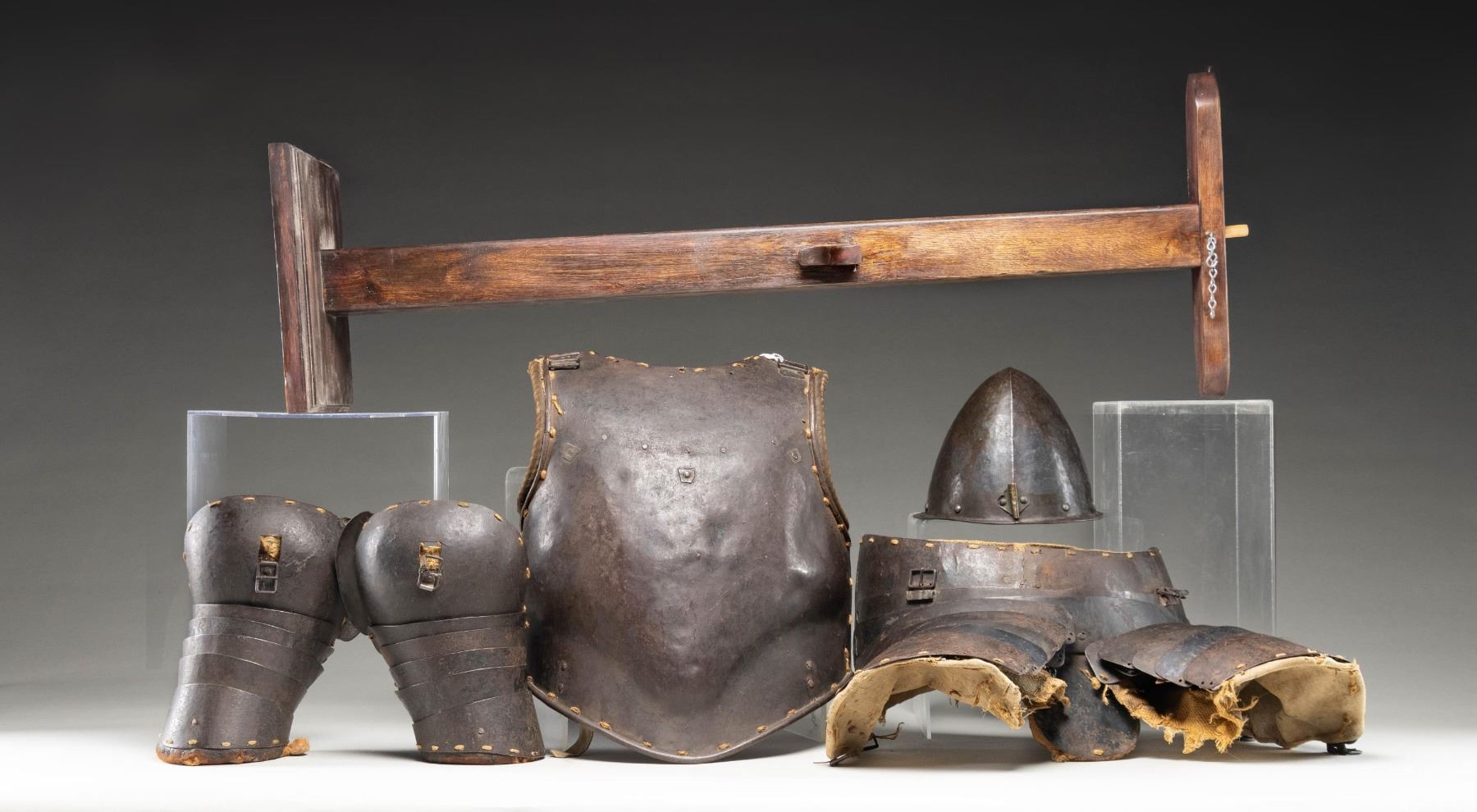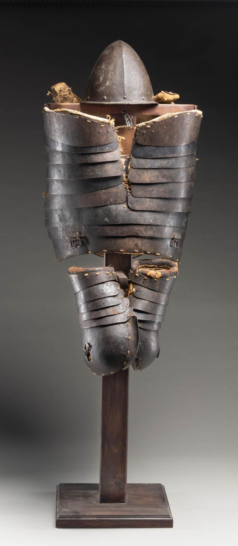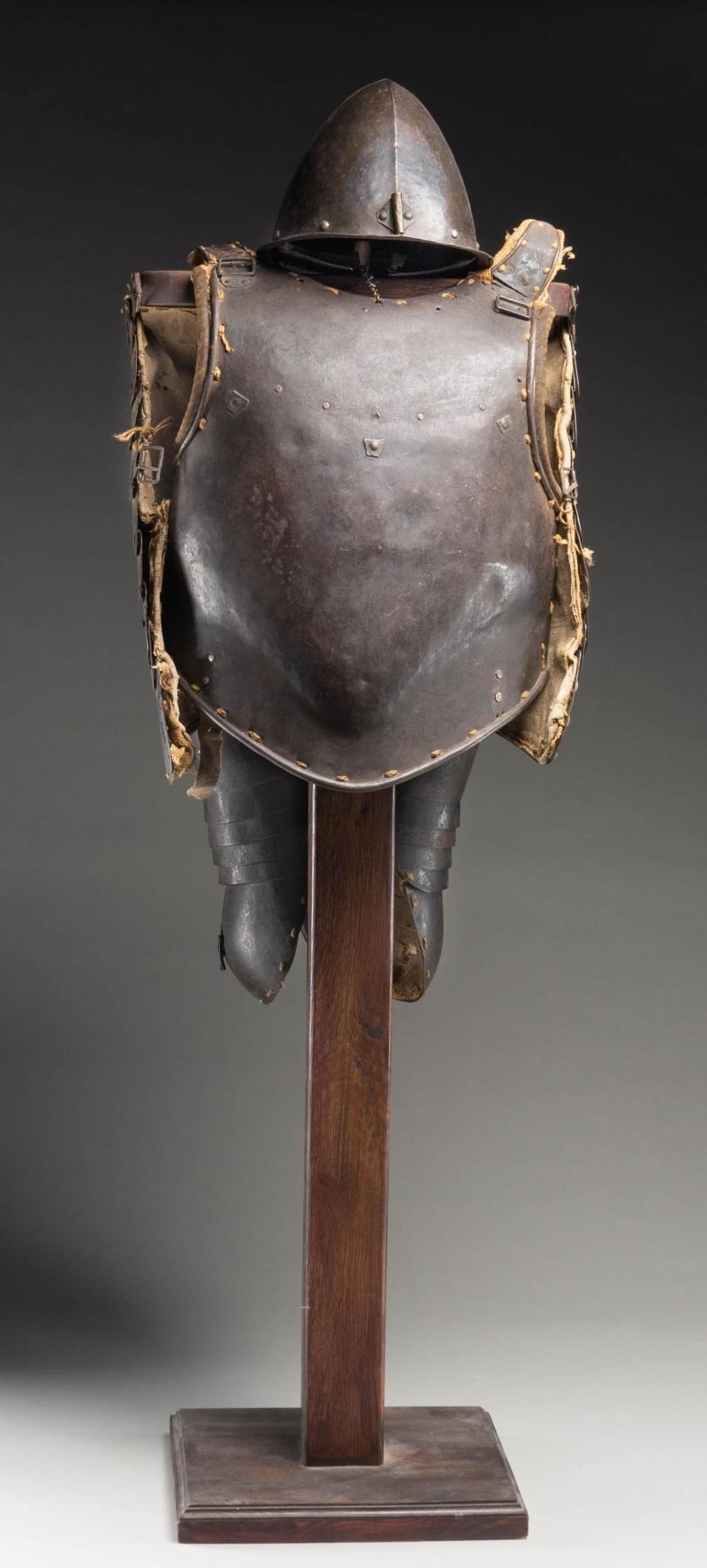 A wonderful set of iron pikeman's armor from the 17th century likely of Italian origin. The breast plate is a single piece with two small hinged sideplates with buckles at the lower back area. Breast plate is lined with coarse woven material over burlap showing inked markings. Shoulder armor is made up of six plates each and lined in a similar manner. The skirt has a double row of six plates over three rows of single large wrap-around plates. The helmet is a cabasset forged in one piece with 10 rivets around the base and an additional two rivets in the plume holder. There is a small hole in the rim likely for hanging. The helmet is a bit light in weight and shows several dents. CONDITION: all pieces have a dark patina and show extensive wear from its nearly four centuries of existence. The linings are quite worn and threadbare but surprisingly complete. (02-24803/BF). NON-GUN. $3,000-5,000.