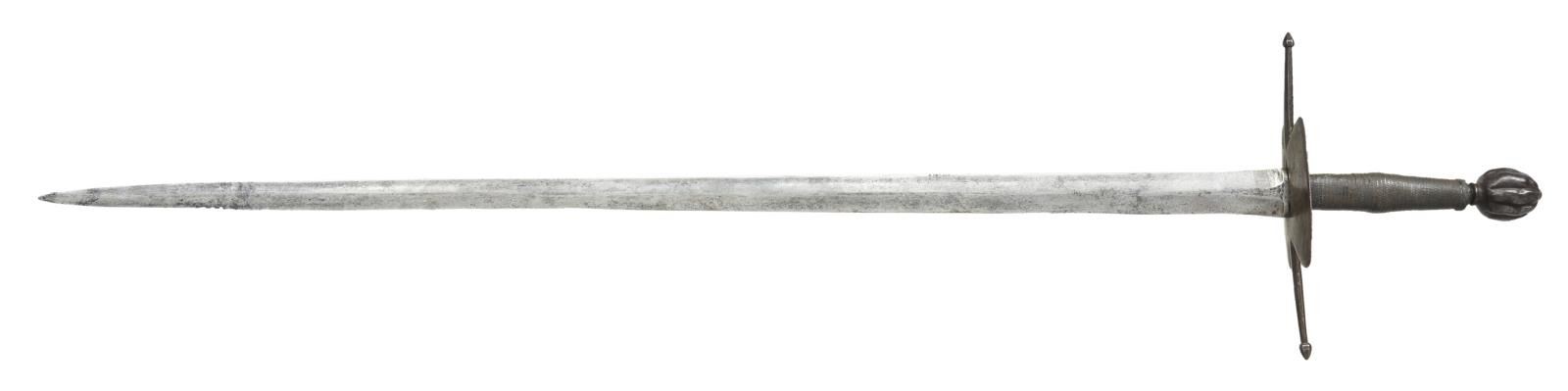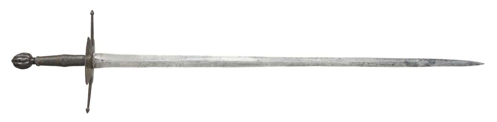 Overall length: 44". Blade length: 36 1/2". Plain blade w/ a raised medial ridge. Iron dbl. shell guard w/ 9 1/2" crossguard. Lg. lobed melon pommel. Wire wrapped grip w/ turks head knots at the top & bottom. Grip appears to be filled w/ a tar like material. No scabbard. CONDITION: blade has a cleaned gray mottled finish. Hilt has been lightly cleaned but retains a dark patina. Grip is complete. (02-16673-18/BF). $1,000-1,800.
