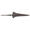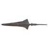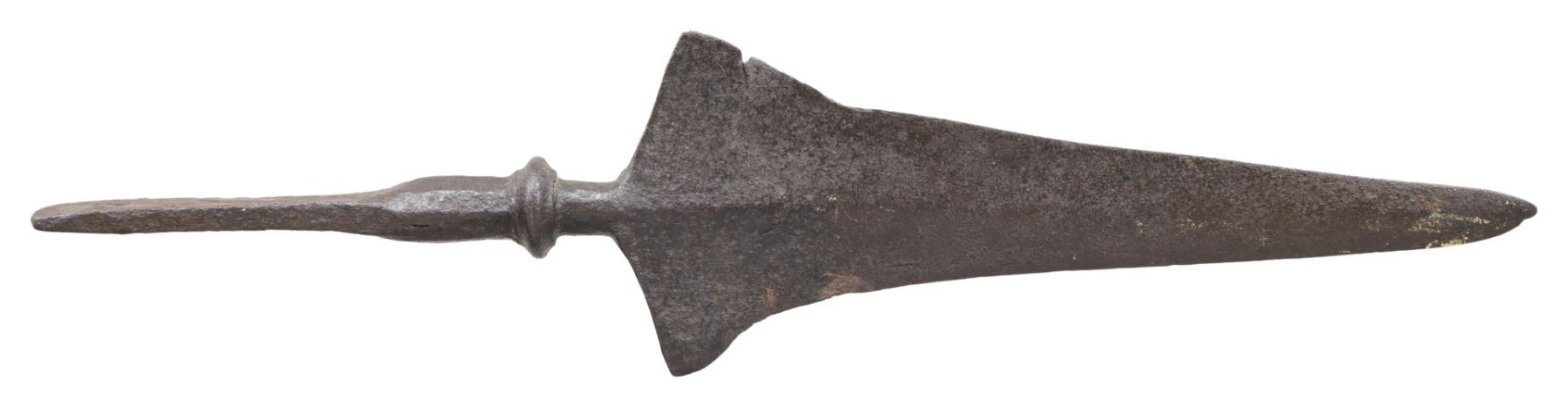 A very early hand forged European iron spontoon head measuring 19 3/4" overall with a 12 1/4" blade and a 6 1/4" tang. The blade has a raised medial ridge and an internal tang with a rectangular securing hole near the base. CONDITION: the entire head has an ancient dark patina and the is a minor crack in one of the lower wings. (02-24788/BF). $300-500.